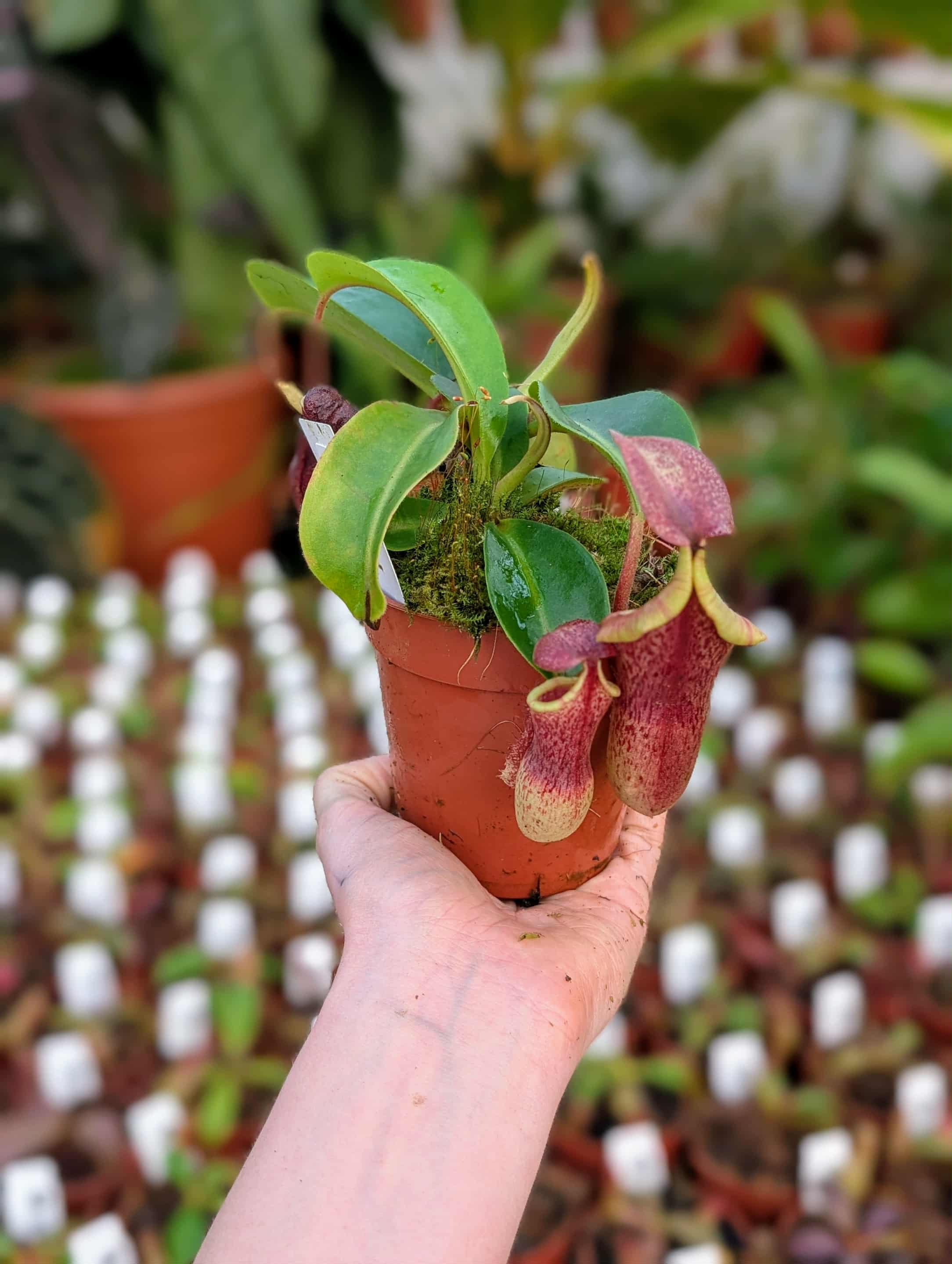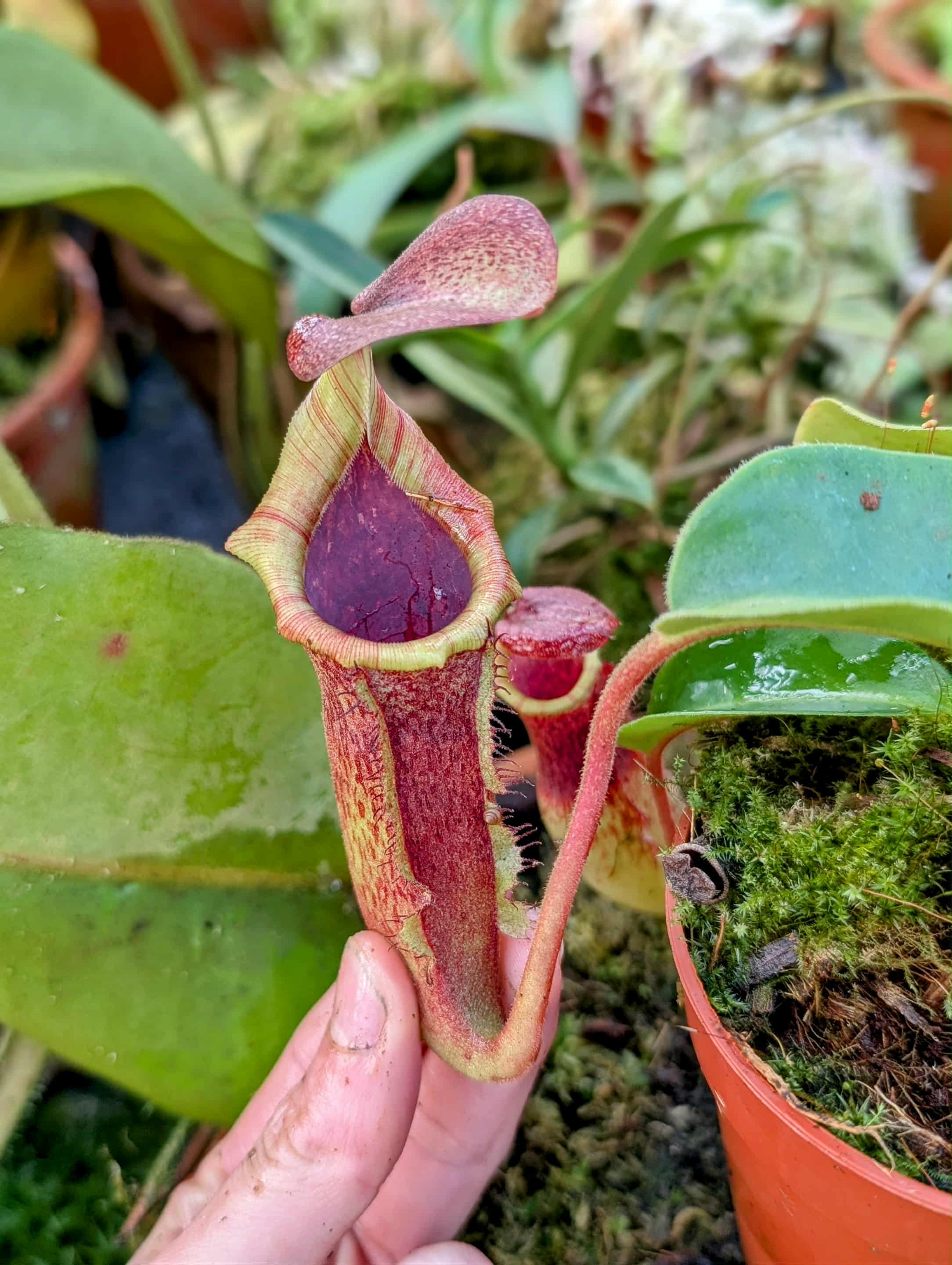 A spectacular multi-species hybrid combining the dramatic features of lowii, veitchii, boschiana, maxima, spectabilis, and ventricosa. This cross is bred for bold peristomes, striking pitcher coloration, and strong, compact growth.