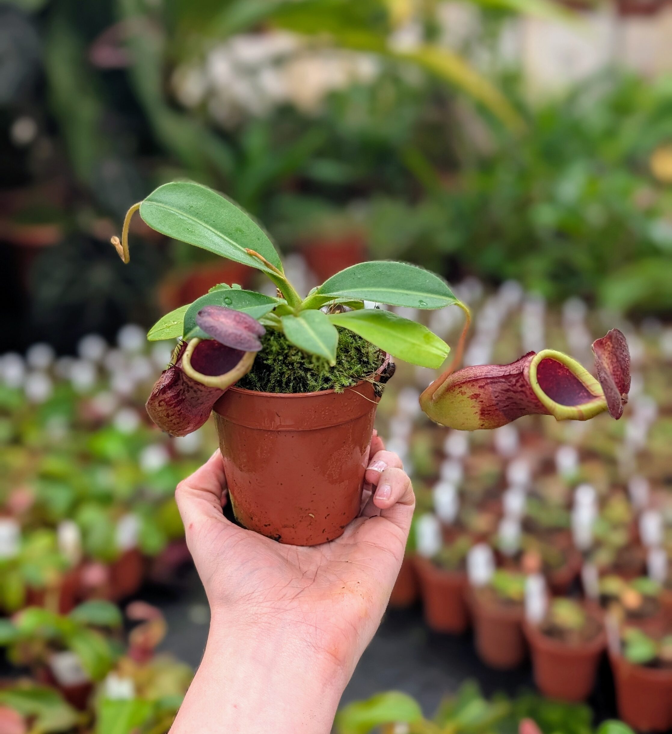 A spectacular multi-species hybrid combining the dramatic features of lowii, veitchii, boschiana, maxima, spectabilis, and ventricosa. This cross is bred for bold peristomes, striking pitcher coloration, and strong, compact growth.