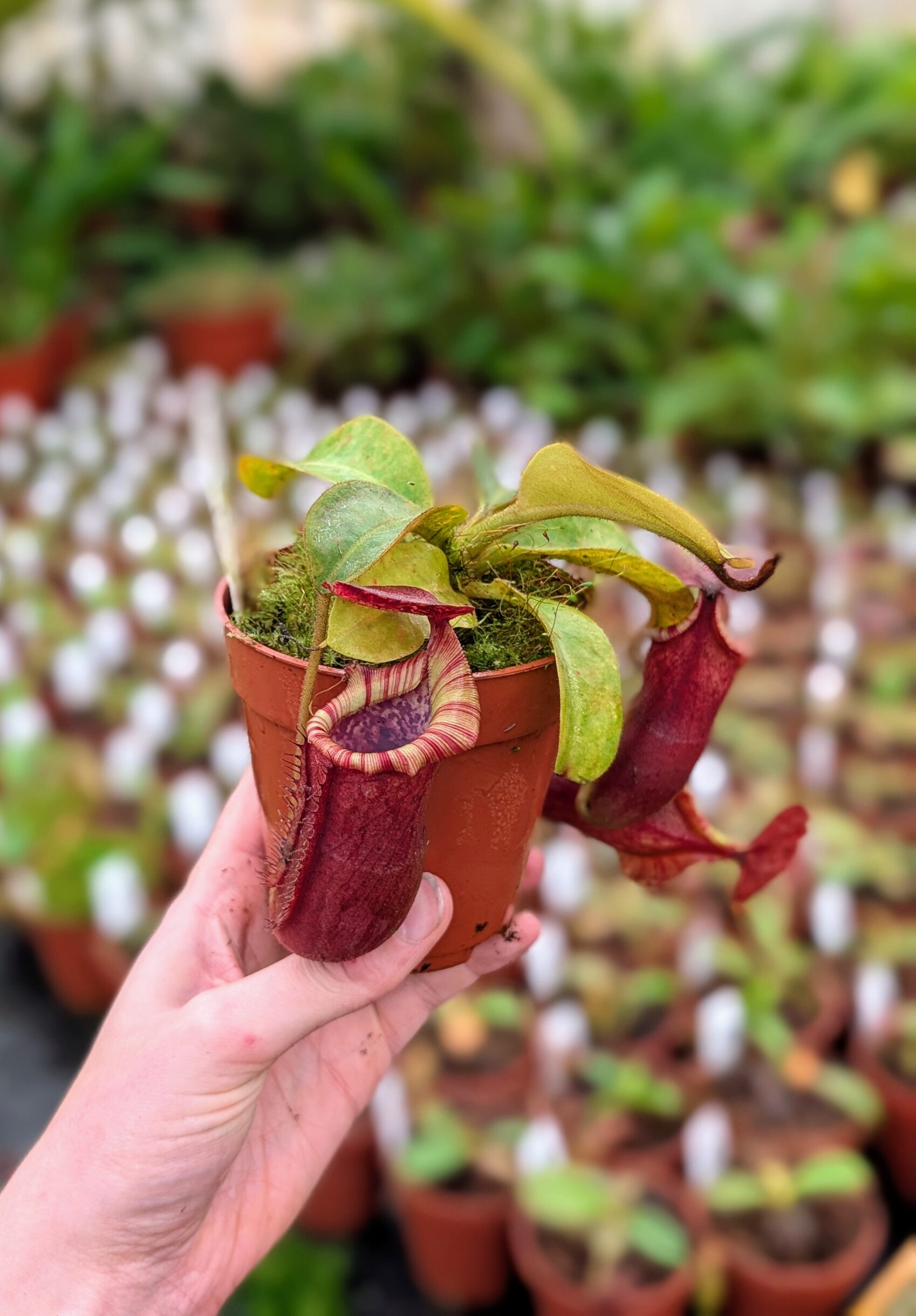 A spectacular multi-species hybrid combining the dramatic features of lowii, veitchii, boschiana, maxima, spectabilis, and ventricosa. This cross is bred for bold peristomes, striking pitcher coloration, and strong, compact growth.