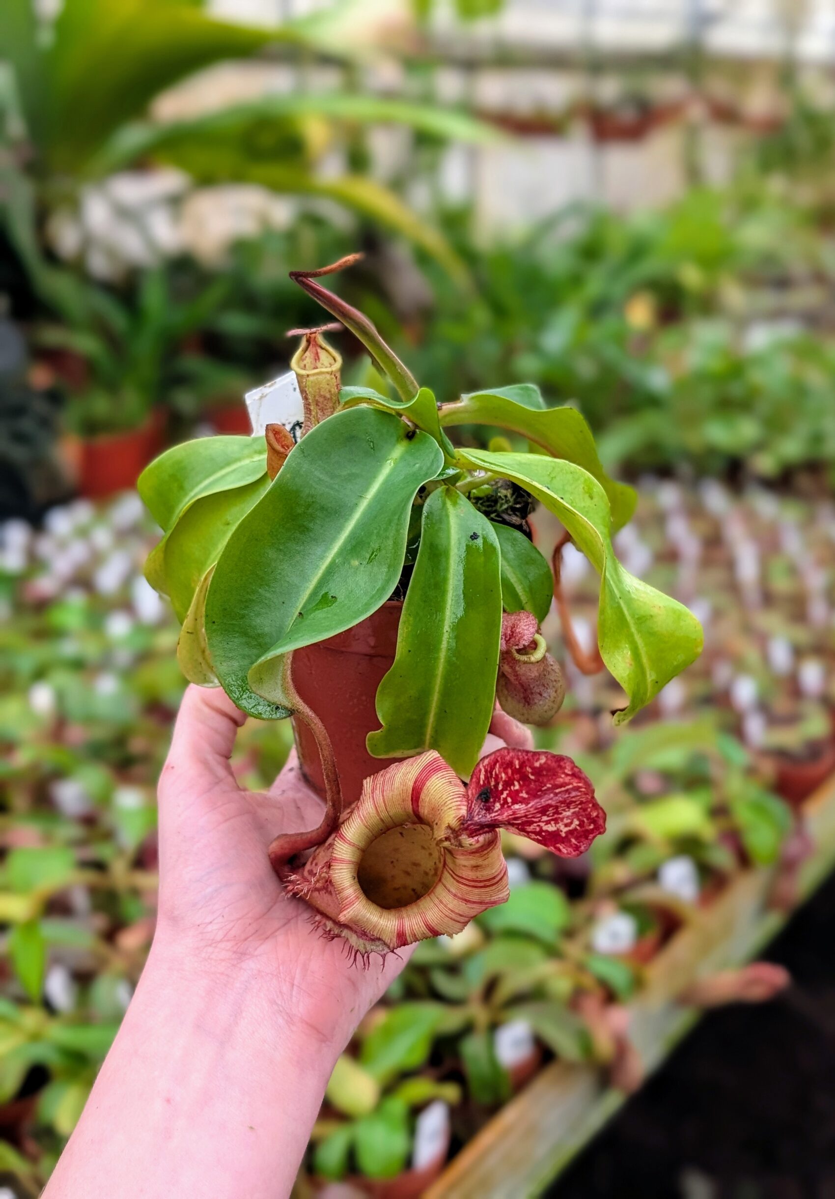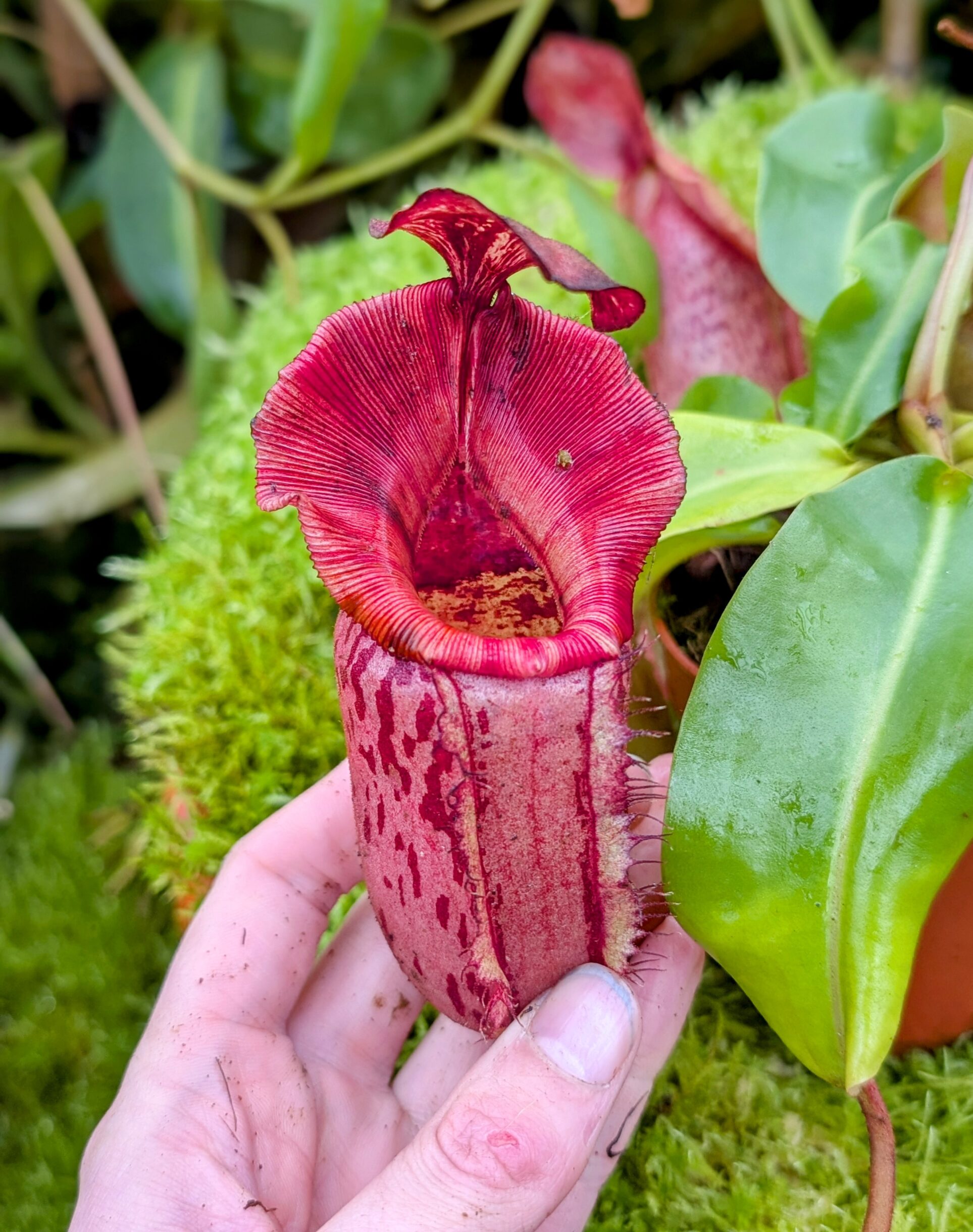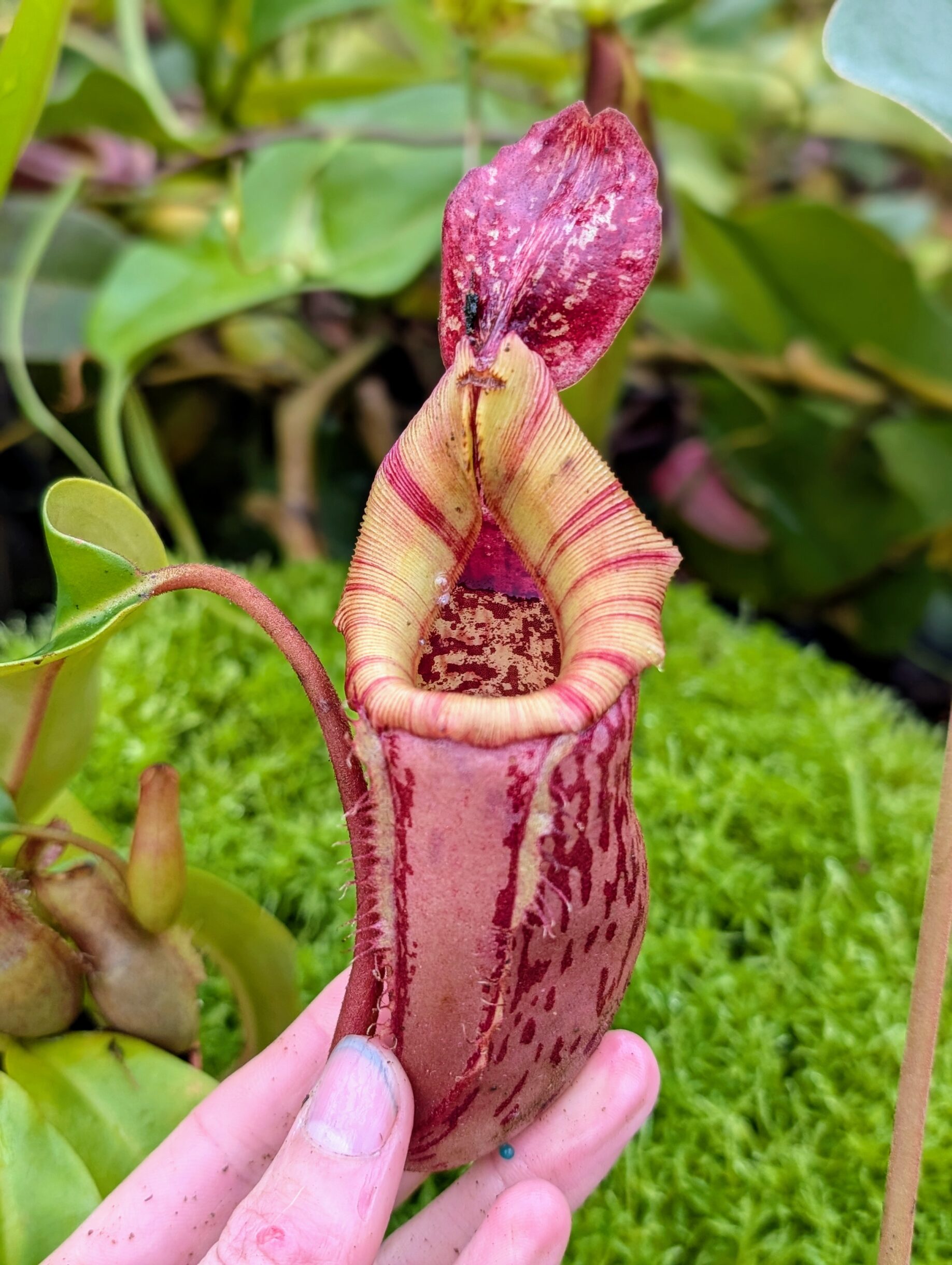 A spectacular multi-species hybrid combining the dramatic features of lowii, veitchii, boschiana, maxima, spectabilis, and ventricosa. This cross is bred for bold peristomes, striking pitcher coloration, and strong, compact growth.