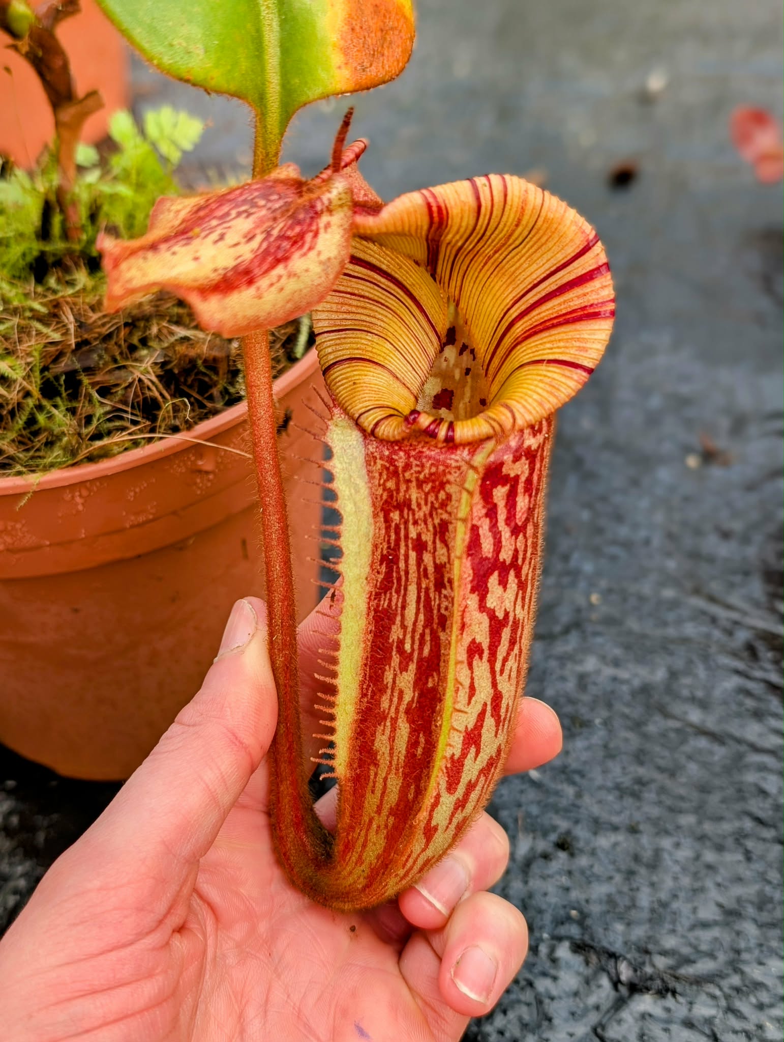 A distinctive Nepenthes hybrid combining bold structure and refined detail. Influences from N. boschiana and N. veitchii provide sturdy growth and well-formed pitchers, while N. mollis adds a softer, more elegant touch.