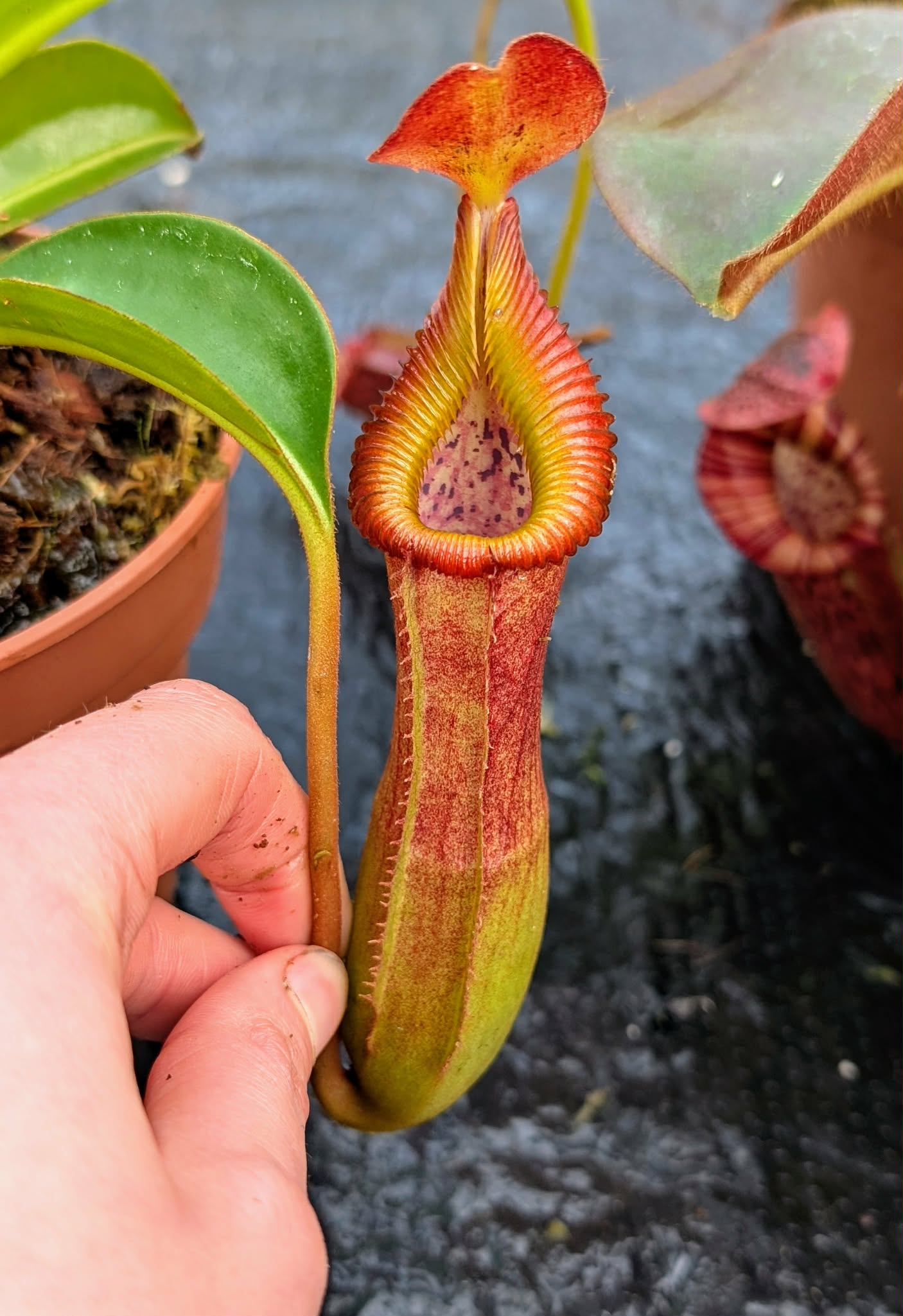 A powerful Nepenthes hybrid combining the massive size potential of N. truncata with the distinctive traits of N. lowii and the bold elegance of N. edwardsiana.