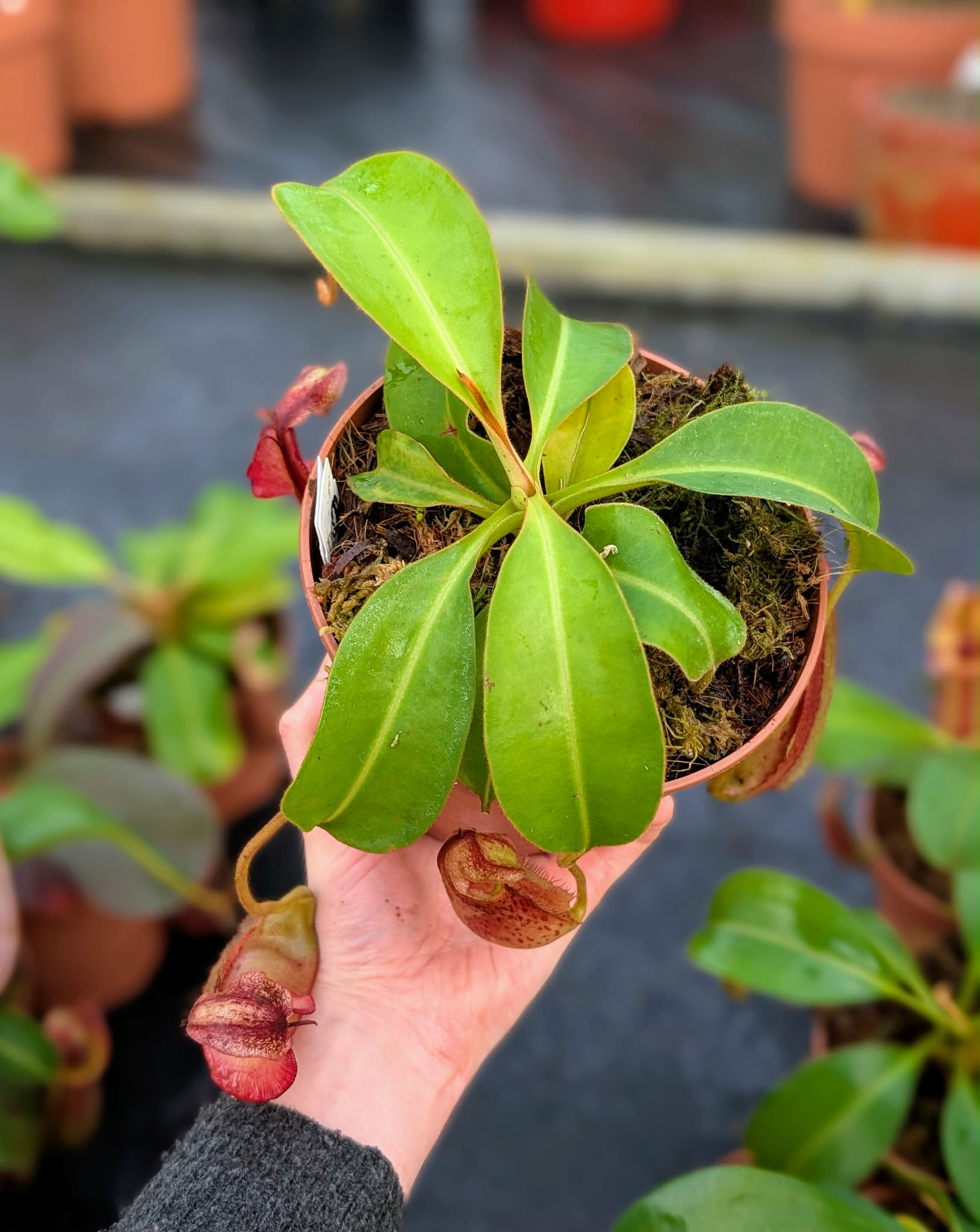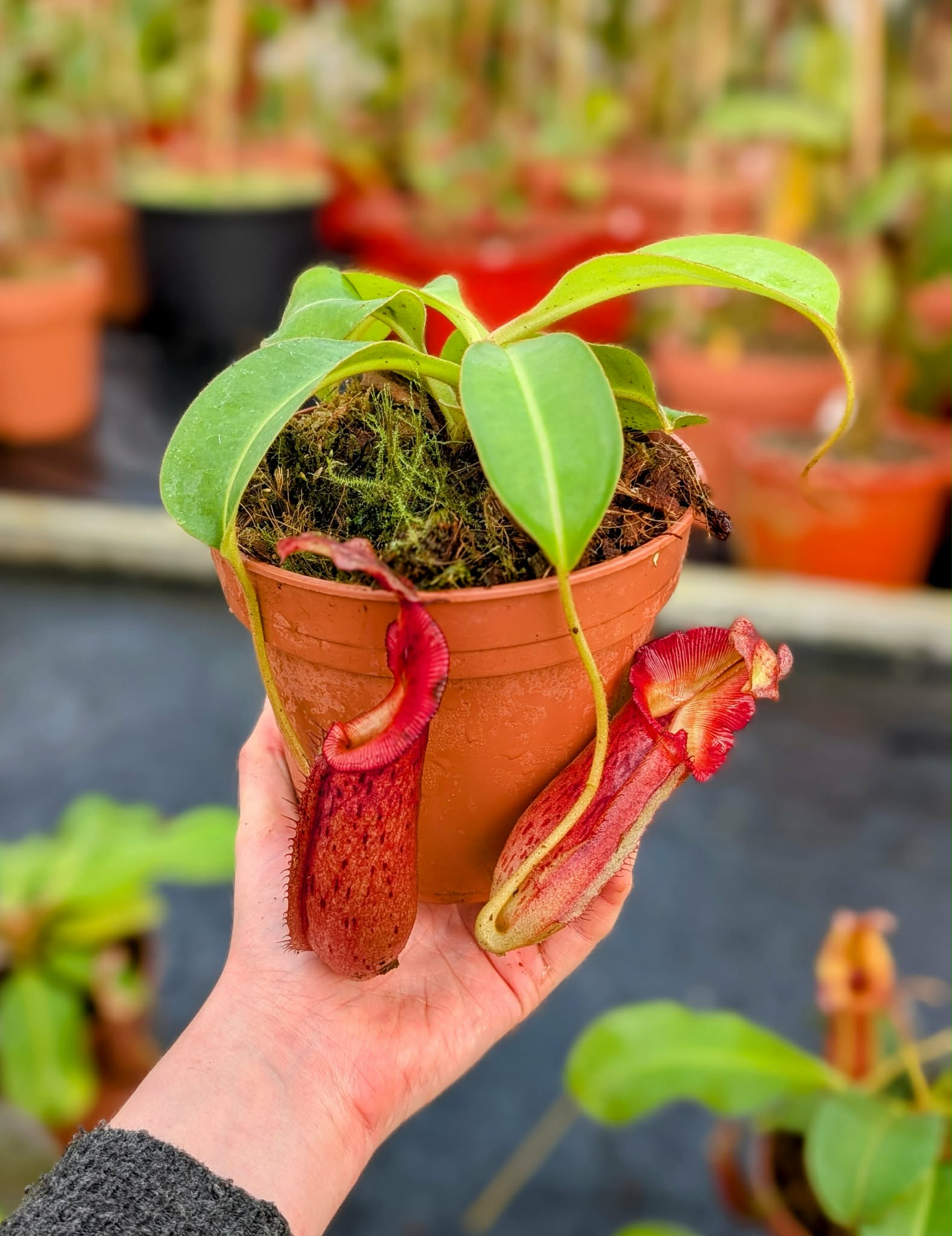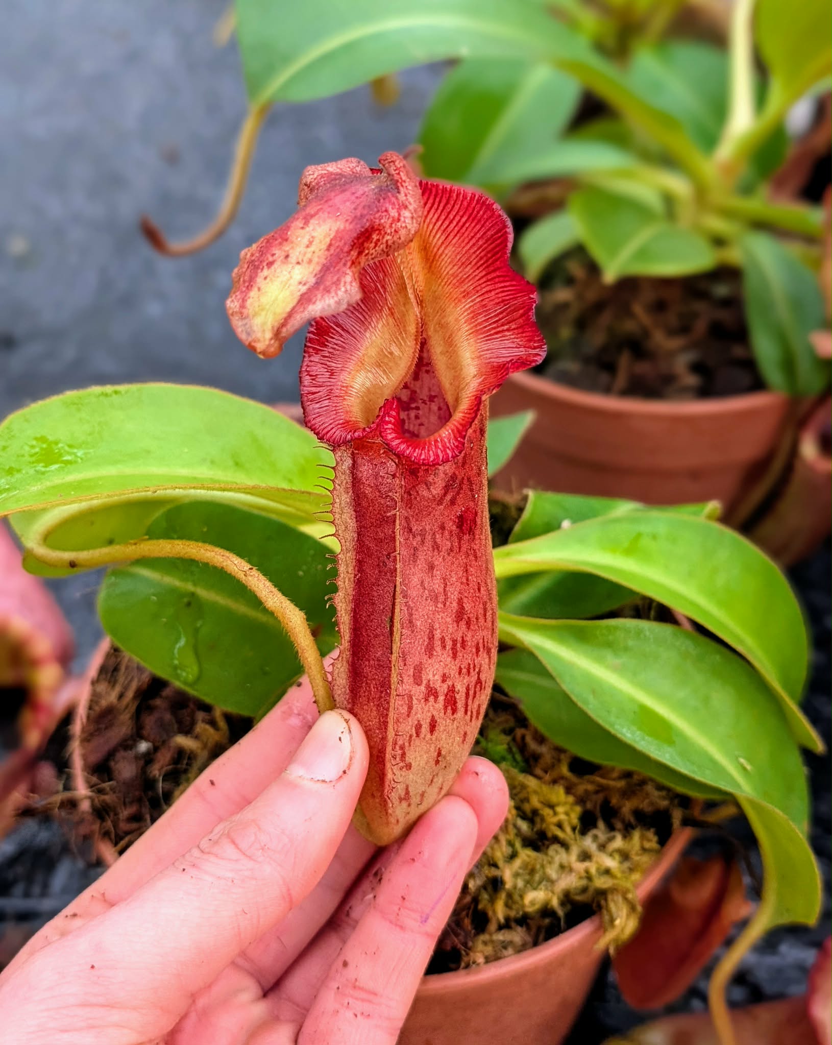 A striking Nepenthes hybrid combining the dark tones of N. maxima ‘dark’ with the elegance of N. eymae, the structure of N. veitchii, and the bold presence of N. lowii, N. boschiana, and N. mira.