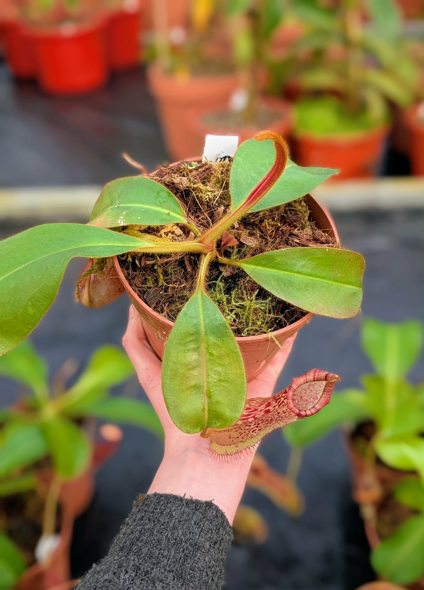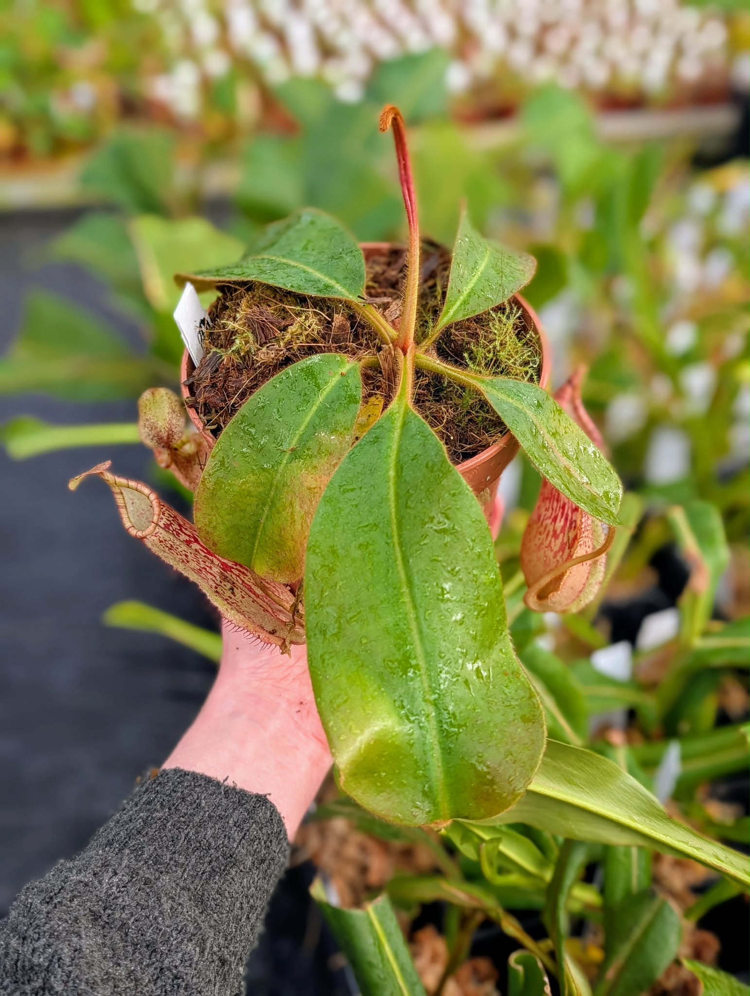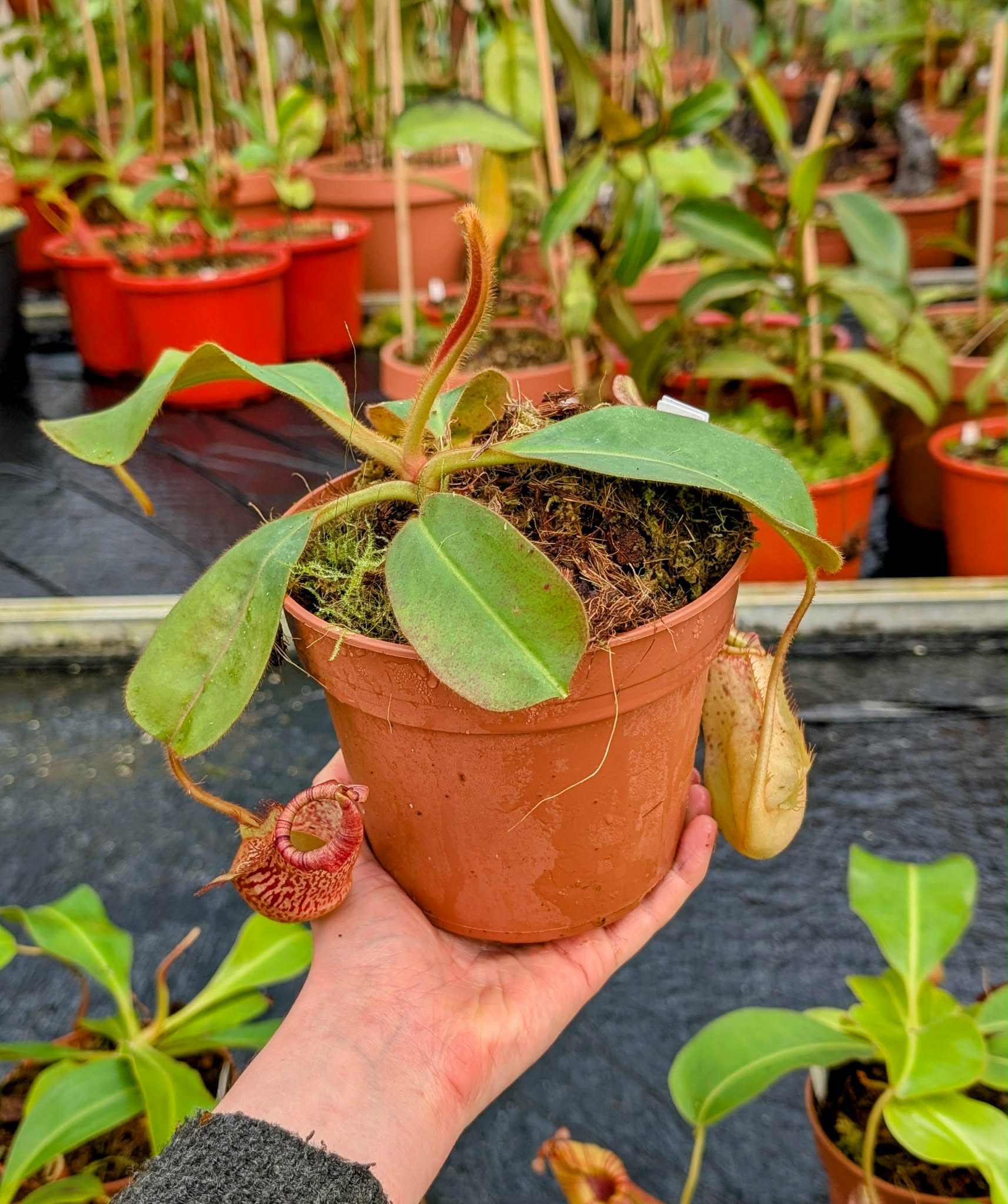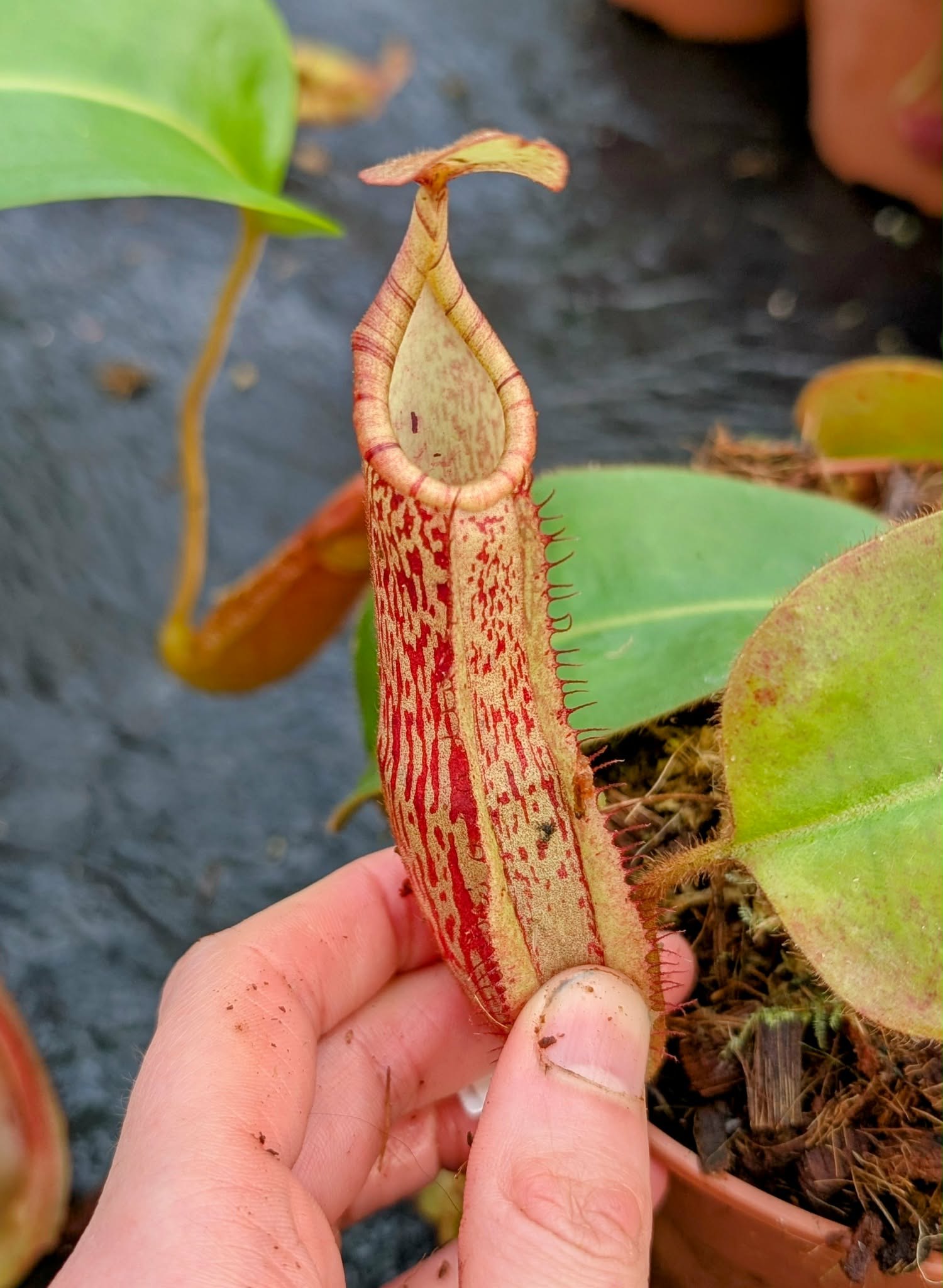A striking Nepenthes hybrid combining the elegant pitcher form of N. peltata and N. platychila with the robust influence of N. veitchii.