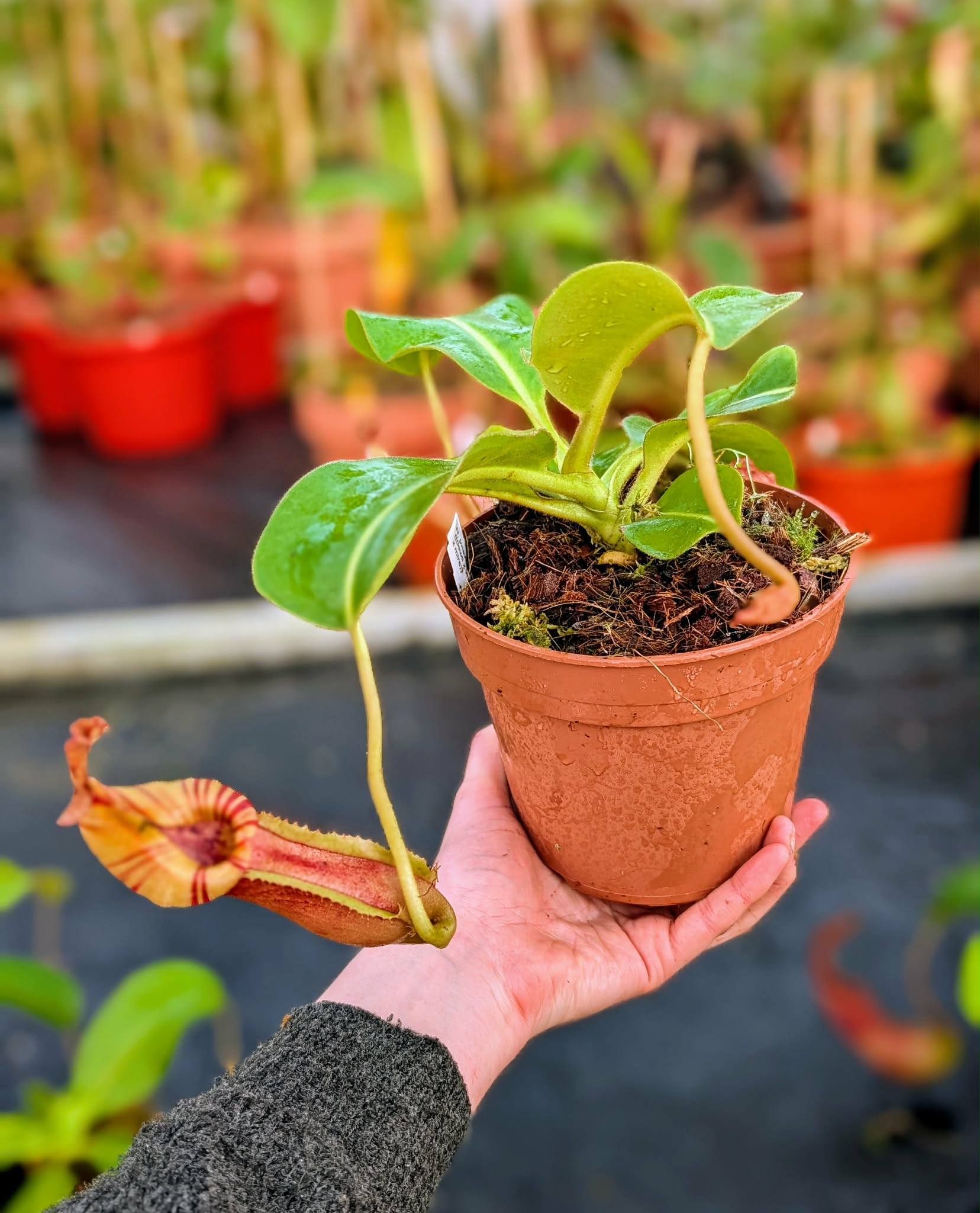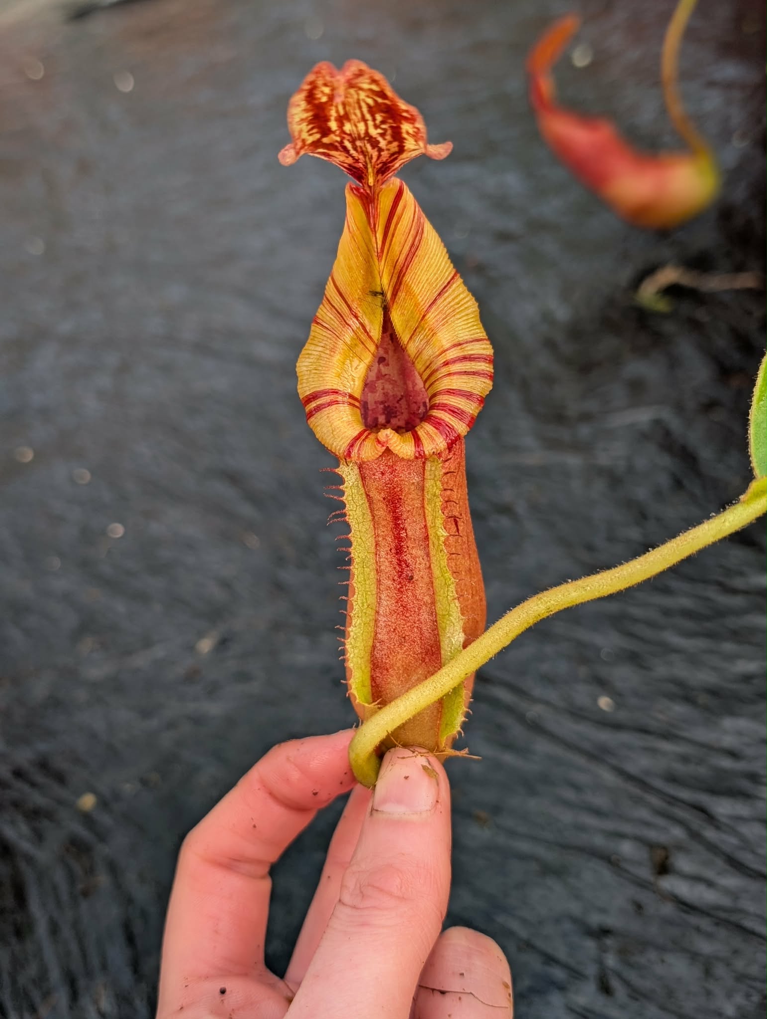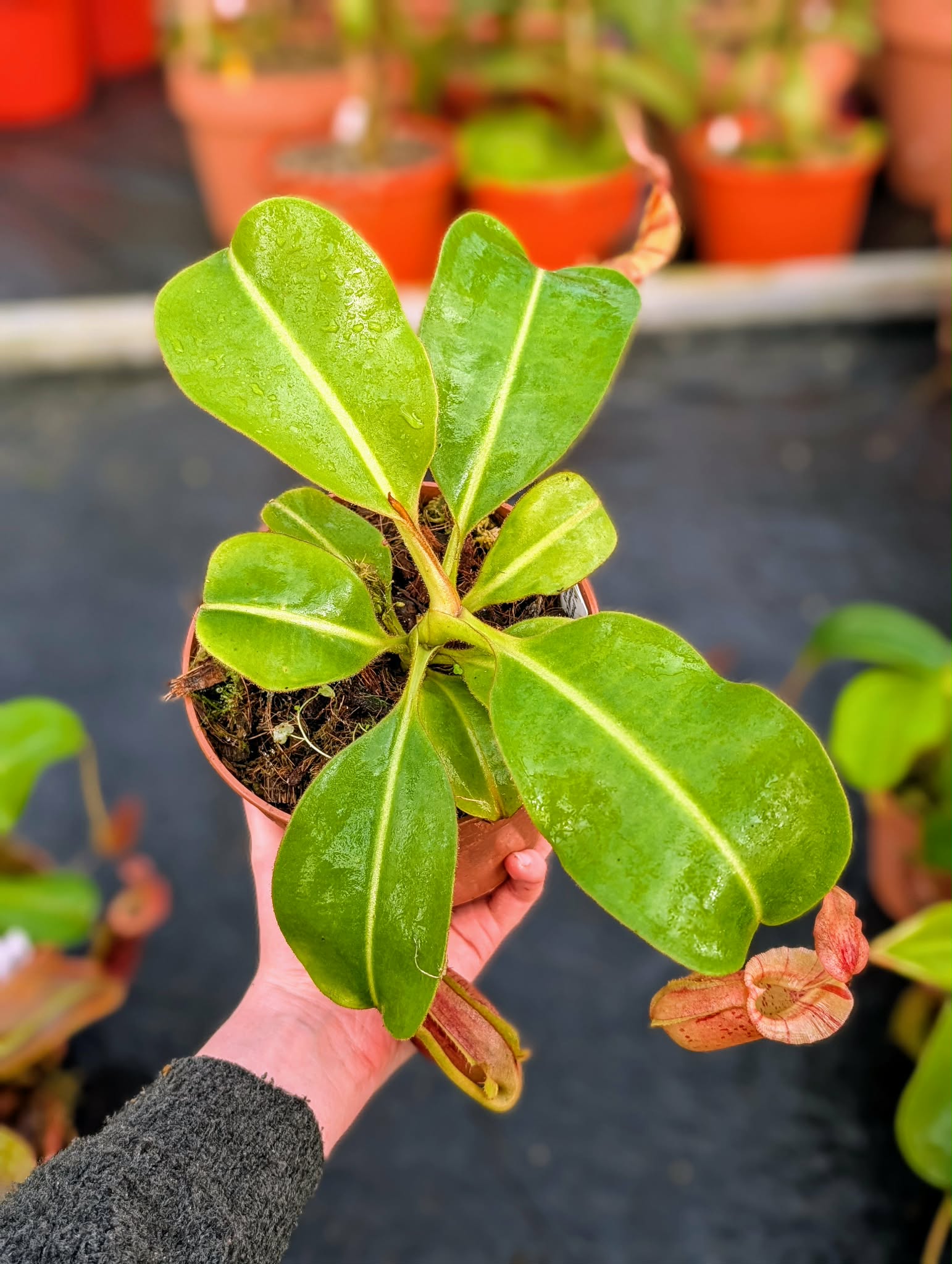 A striking Nepenthes hybrid combining the dark tones of N. maxima ‘dark’ with the elegance of N. eymae, the structure of N. veitchii, and the bold presence of N. lowii, N. boschiana, and N. mira.