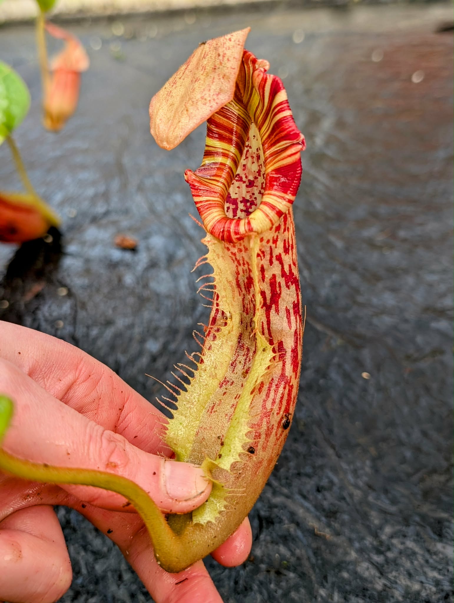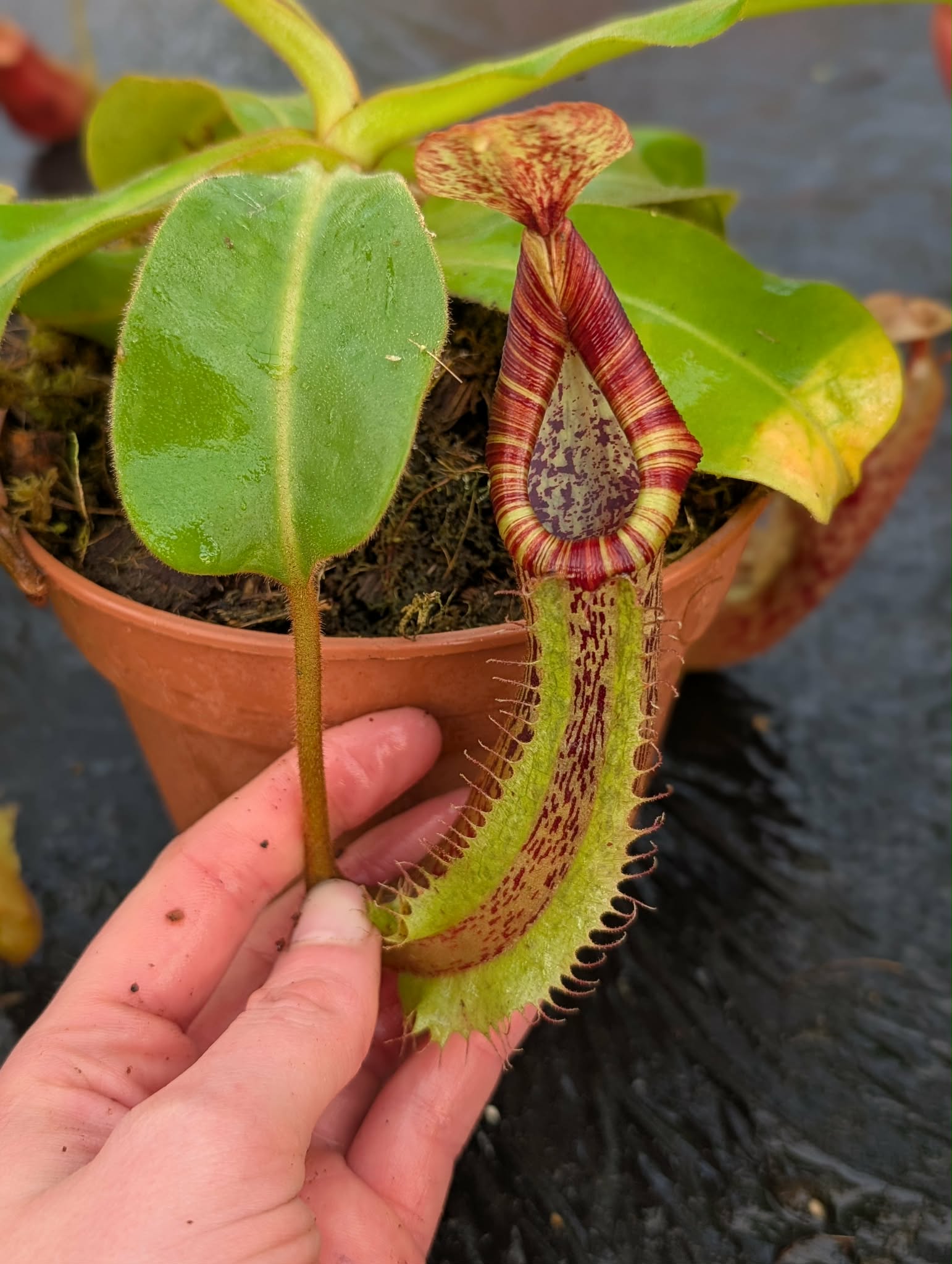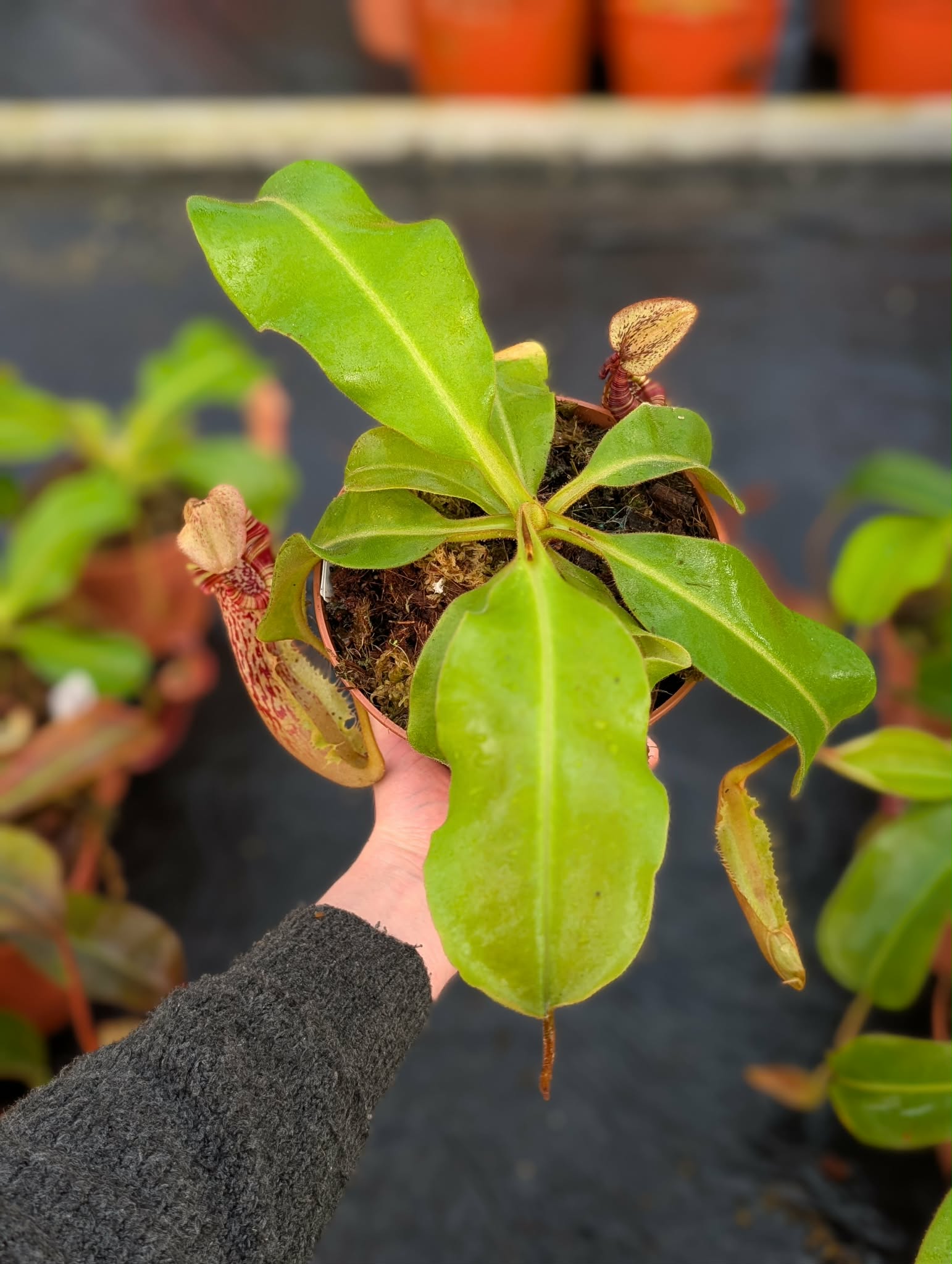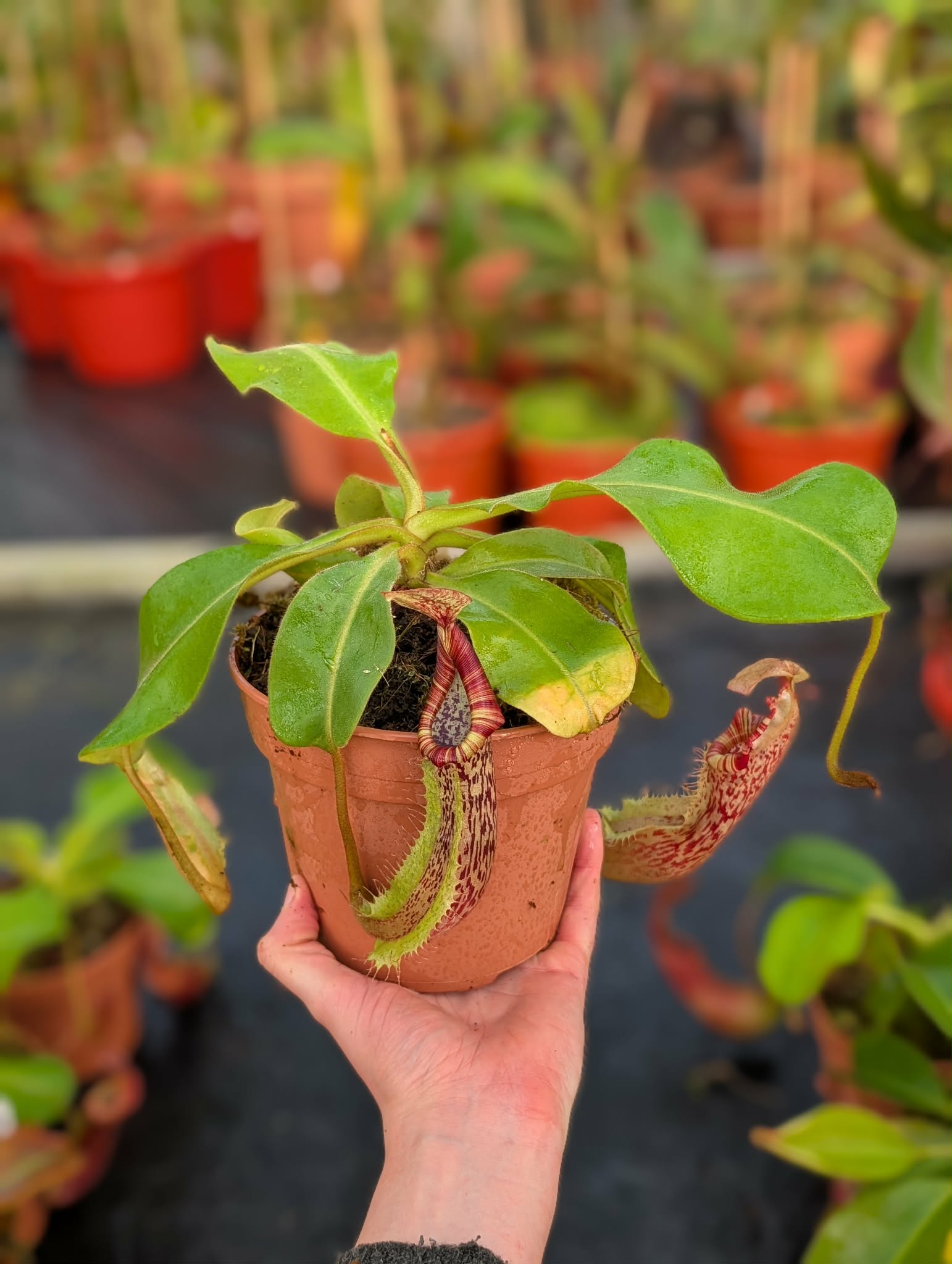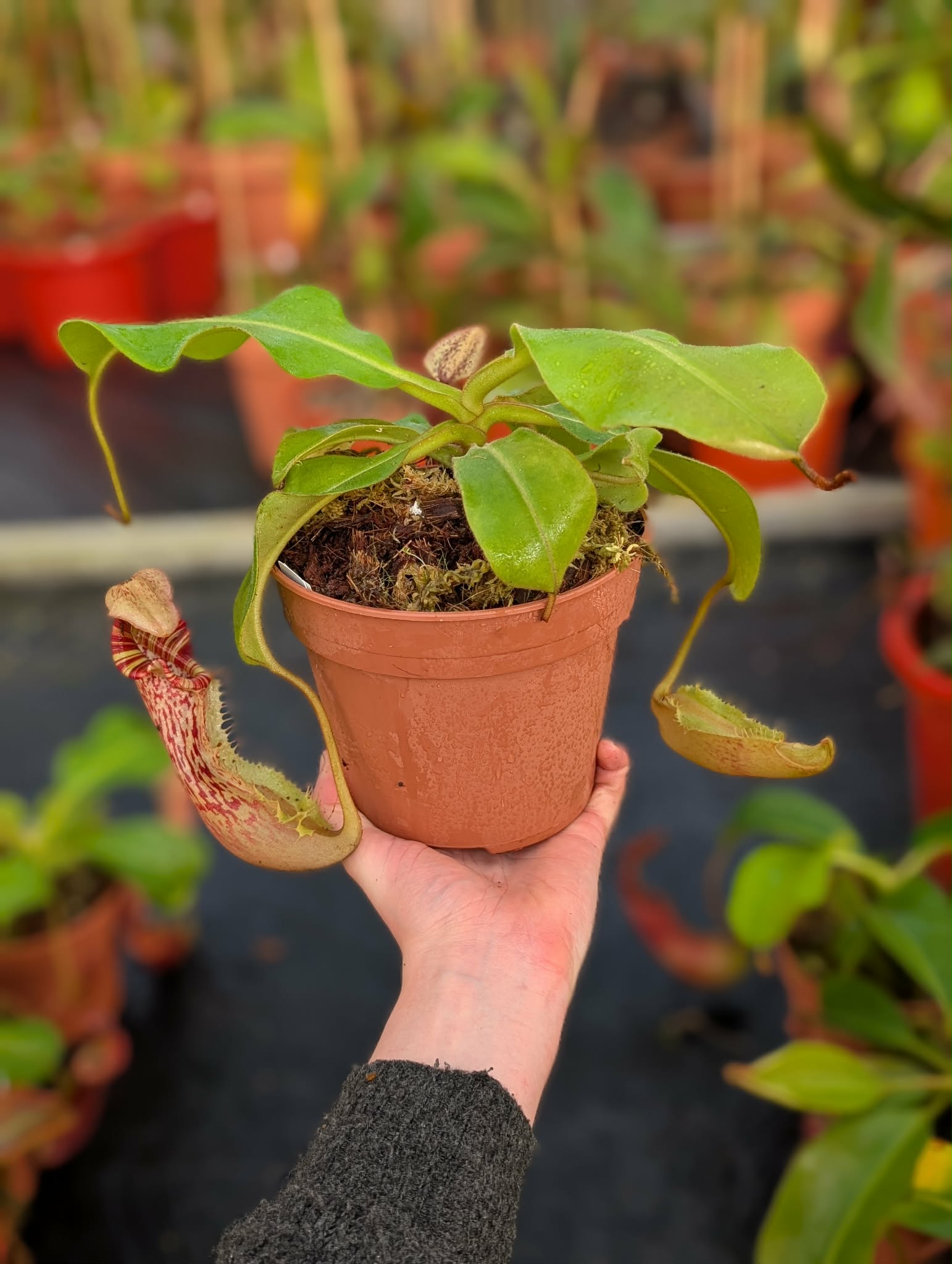 A beautiful Nepenthes hybrid combining bold structure, elegance, and refined detail. The robust influence of N. boschiana and N. veitchii ensures strong, well-shaped pitchers, while N. maxima, N. stenophylla, and N. lowii add size, character, and graceful proportions.