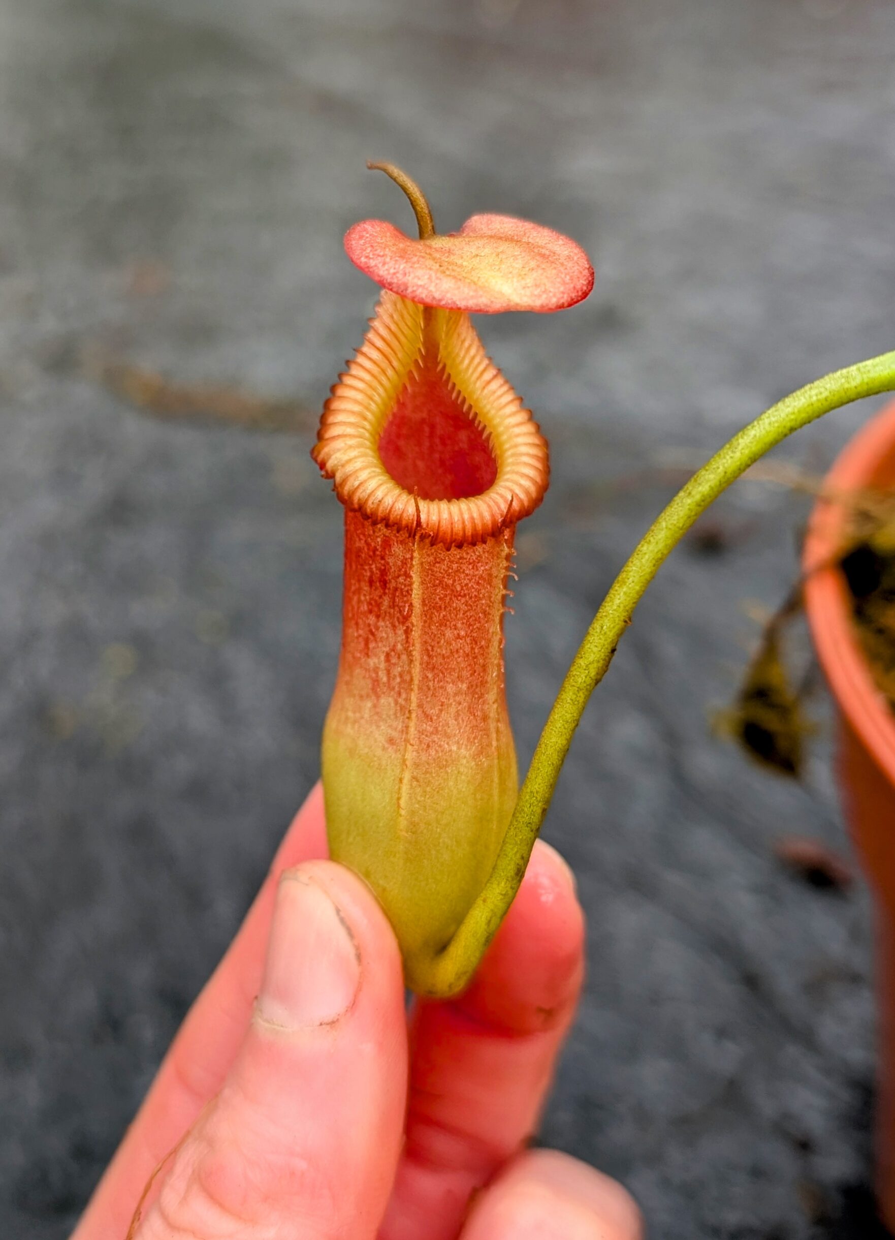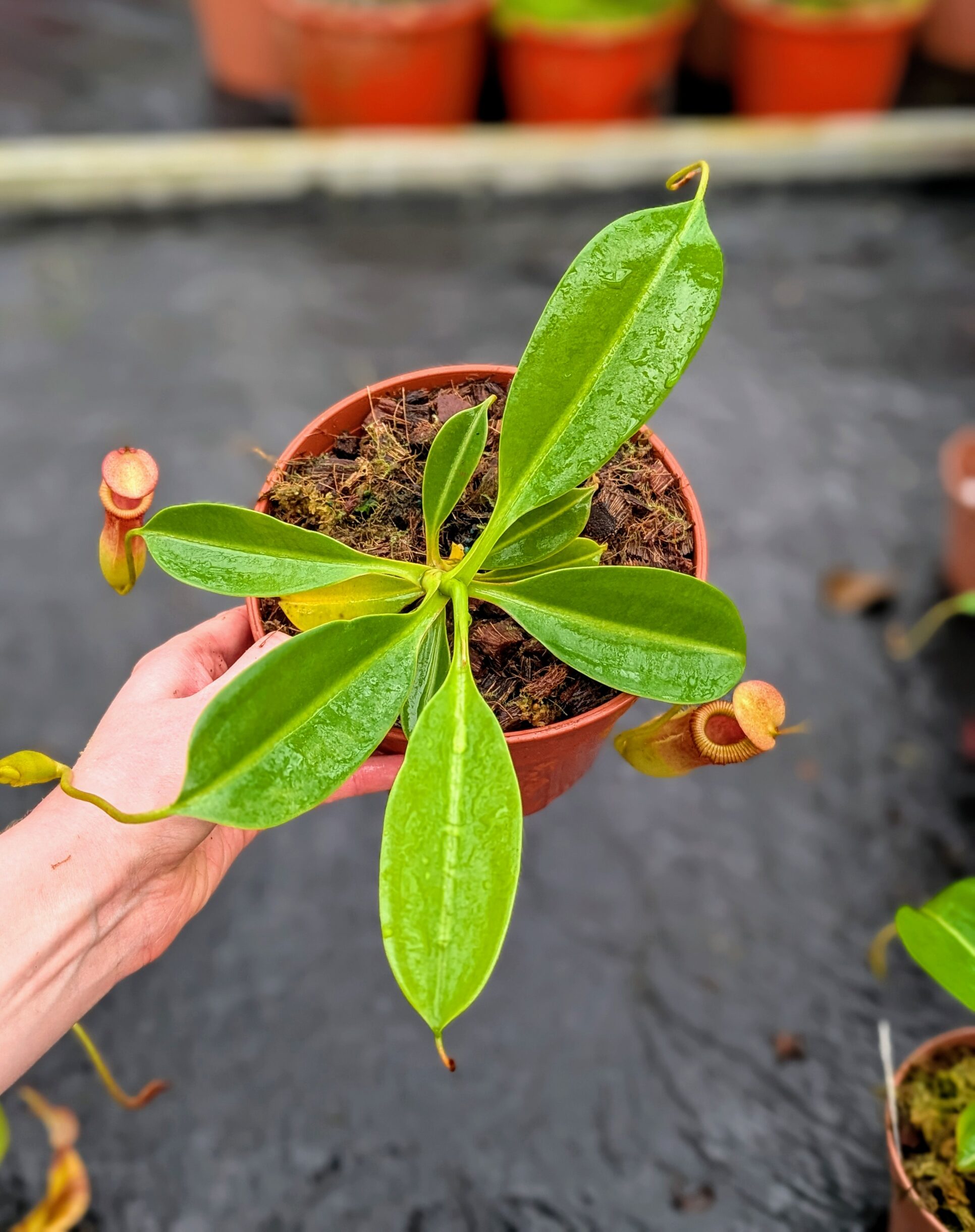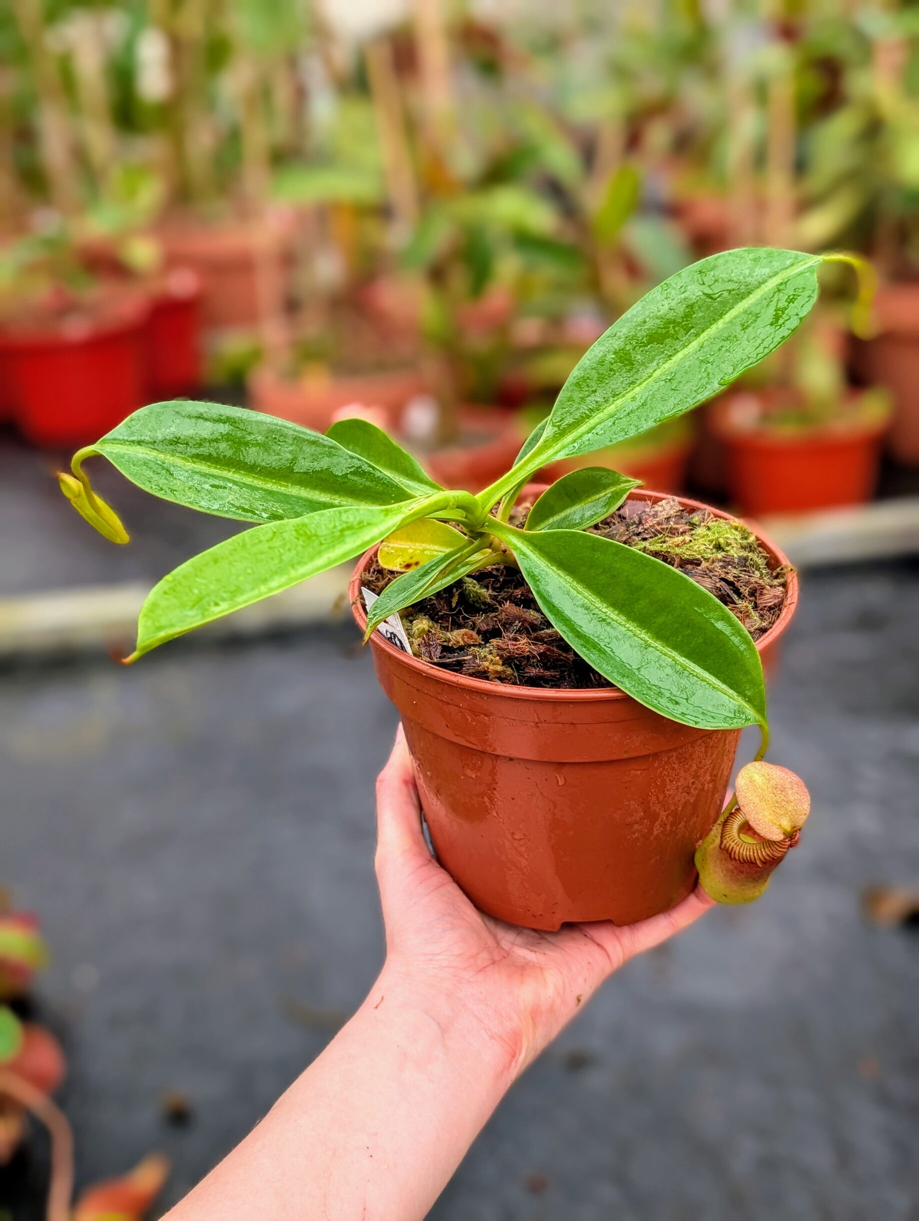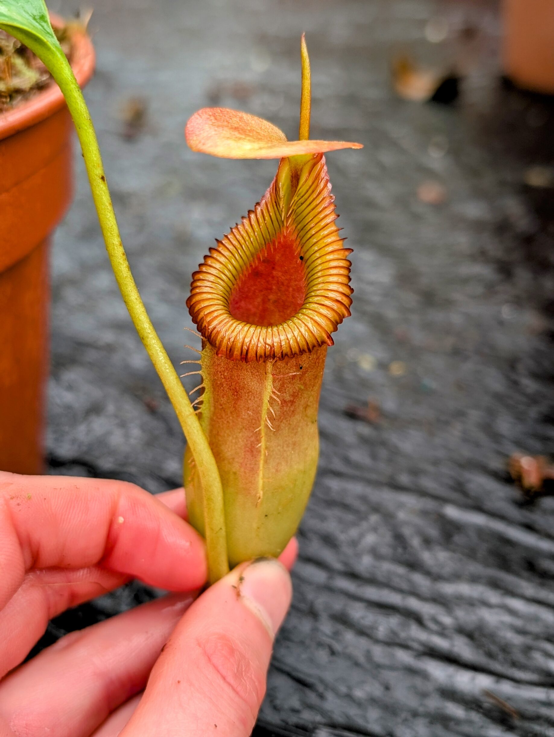 A striking Nepenthes hybrid with refined pitcher form and strong edwardsiana influence. Produces well-shaped, ribbed pitchers with attractive coloration.