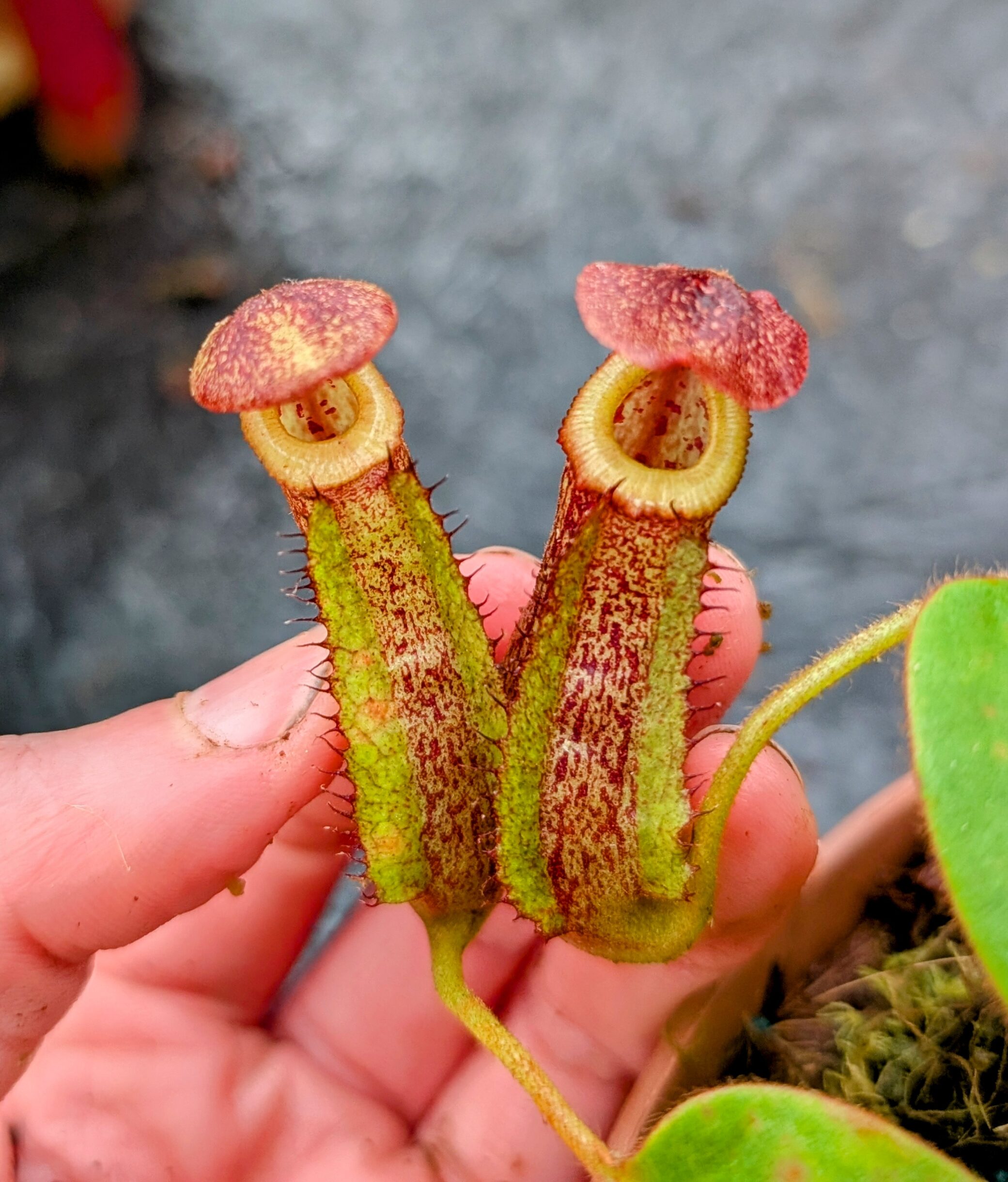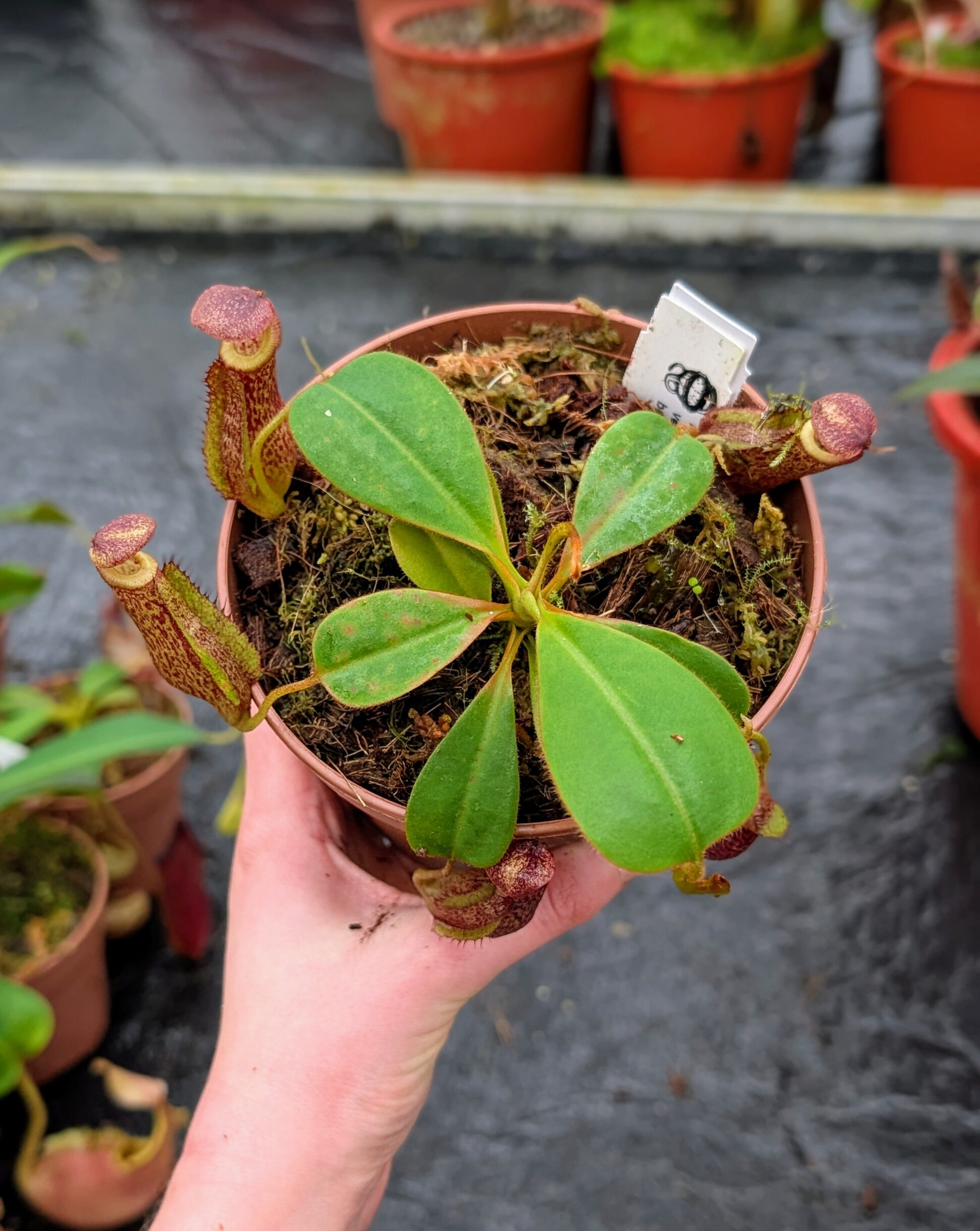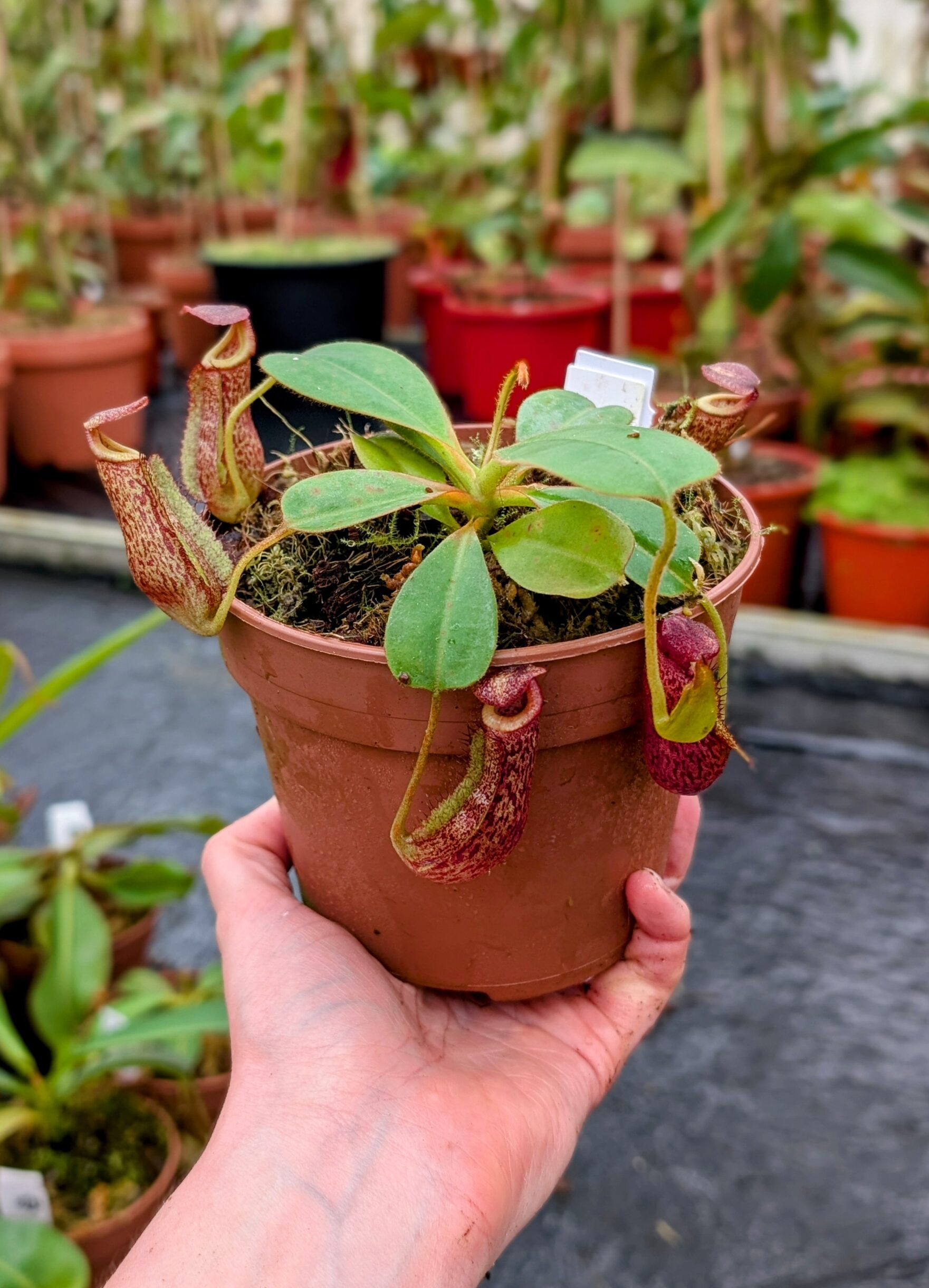 A striking Nepenthes hybrid combining the dark tones of N. maxima ‘dark’ with the elegance of N. eymae, the structure of N. veitchii, and the bold presence of N. lowii, N. boschiana, and N. mira.