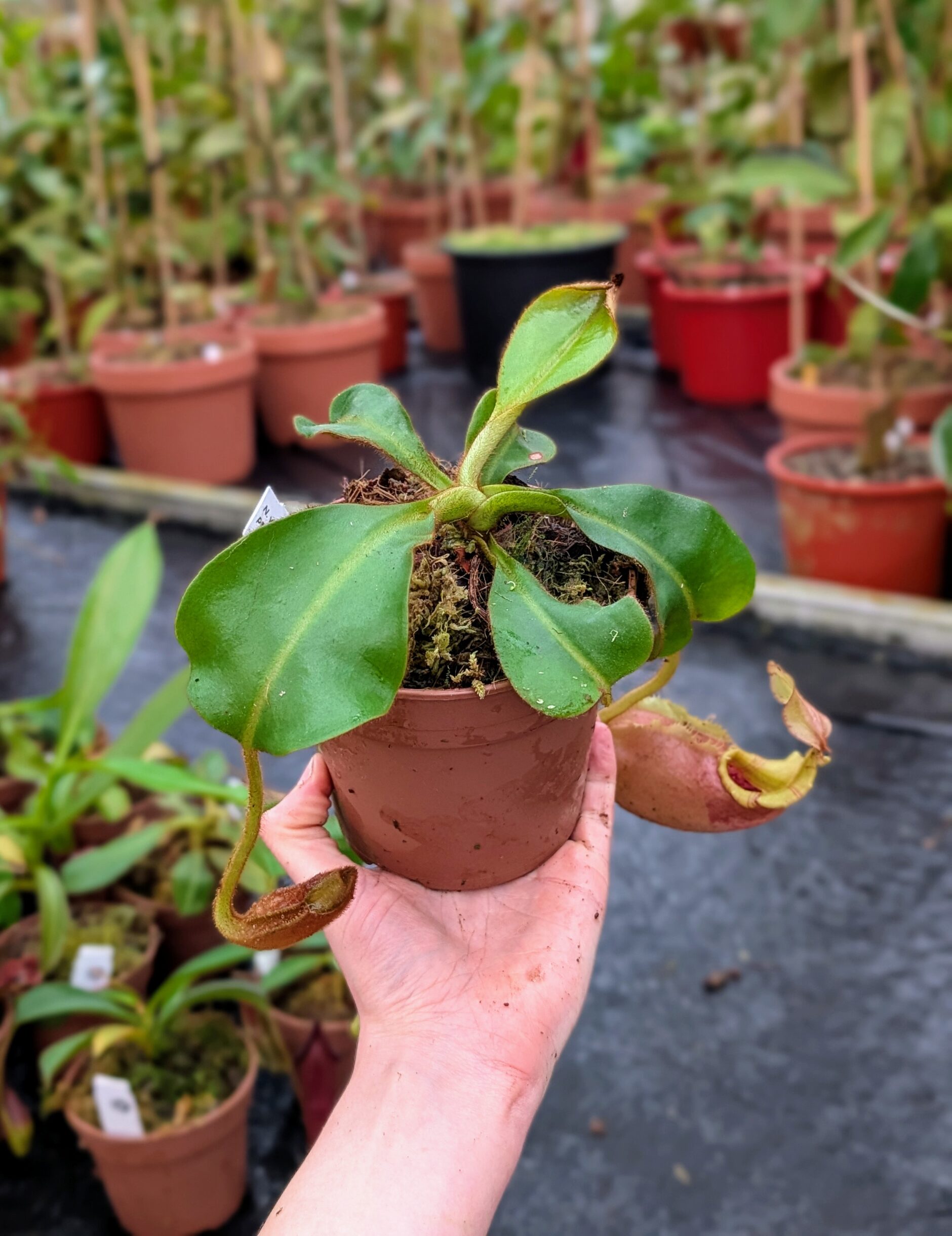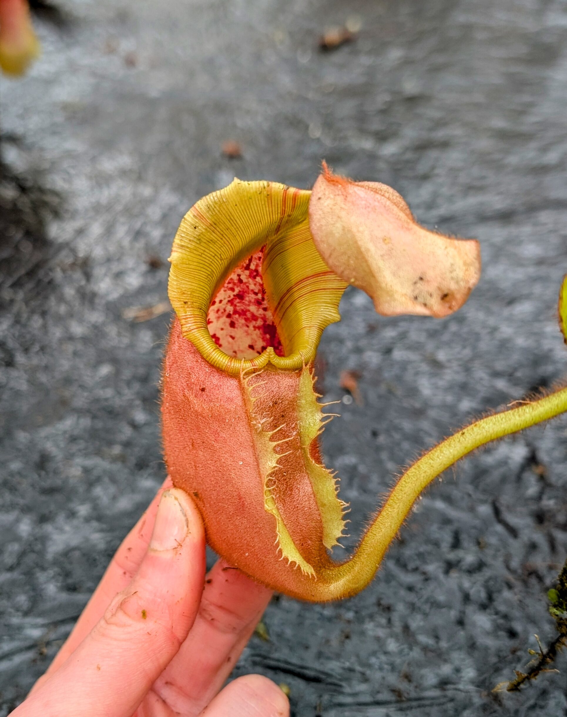 Greenhouse bred from two of EP’s forms. A pink/red, squat pitcher with a striped peristome x EP’s best (kxm) variant with large pink/red pitchers and a very striped amazing peristome. Intermediate conditions are best.