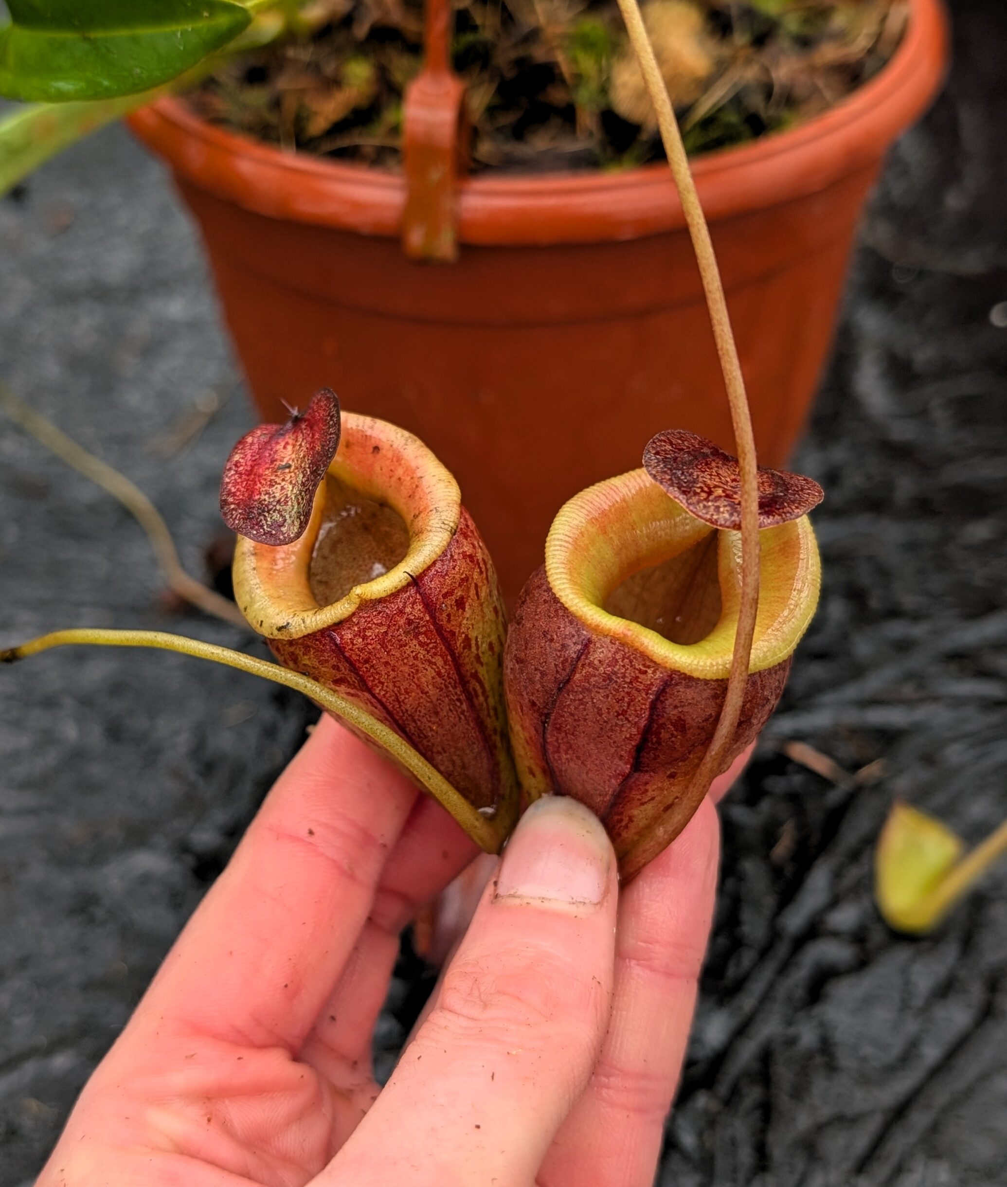 A delicate yet striking hybrid combining the slender elegance of N. tenuis with the vibrant colors and classic pitcher form of N. flava.