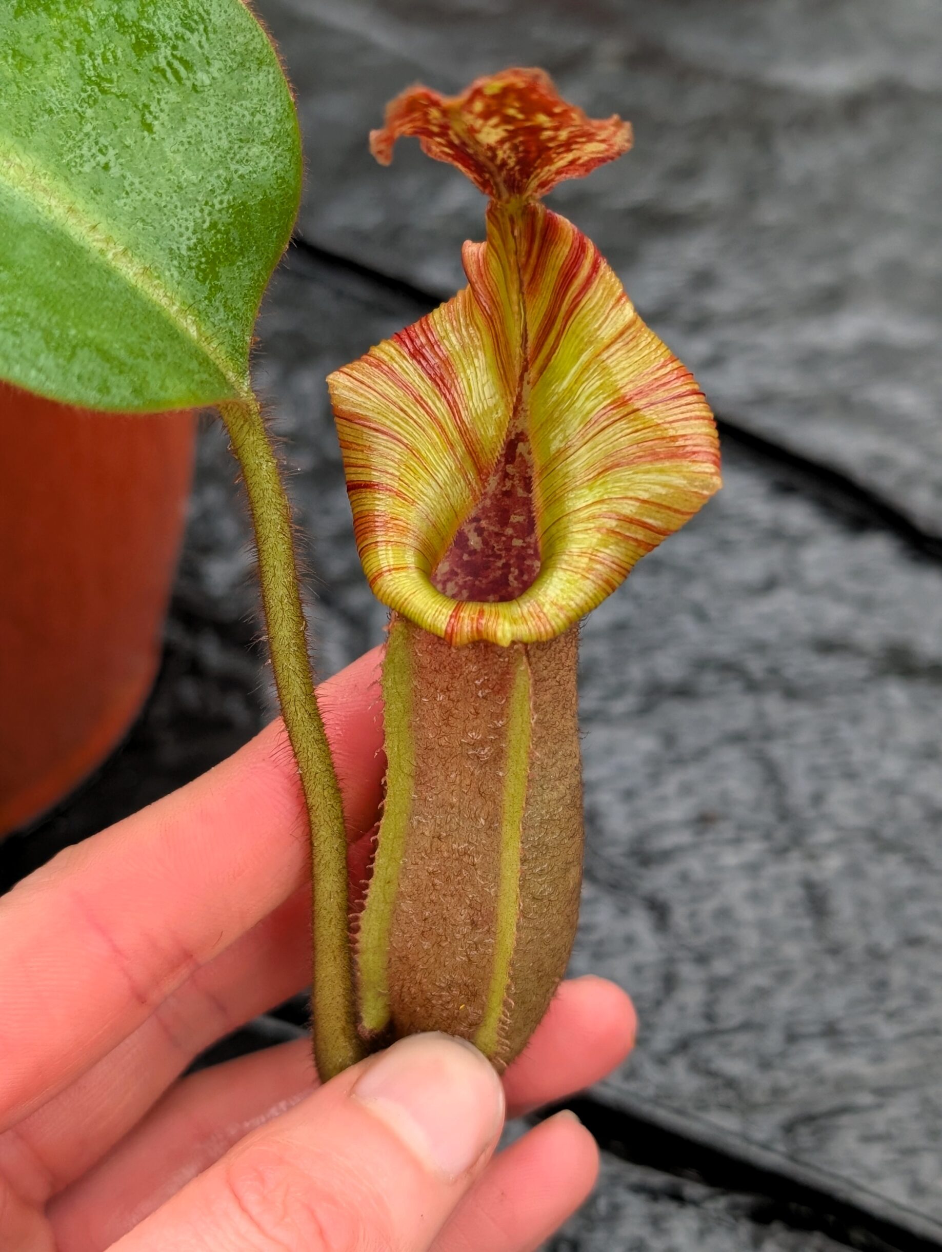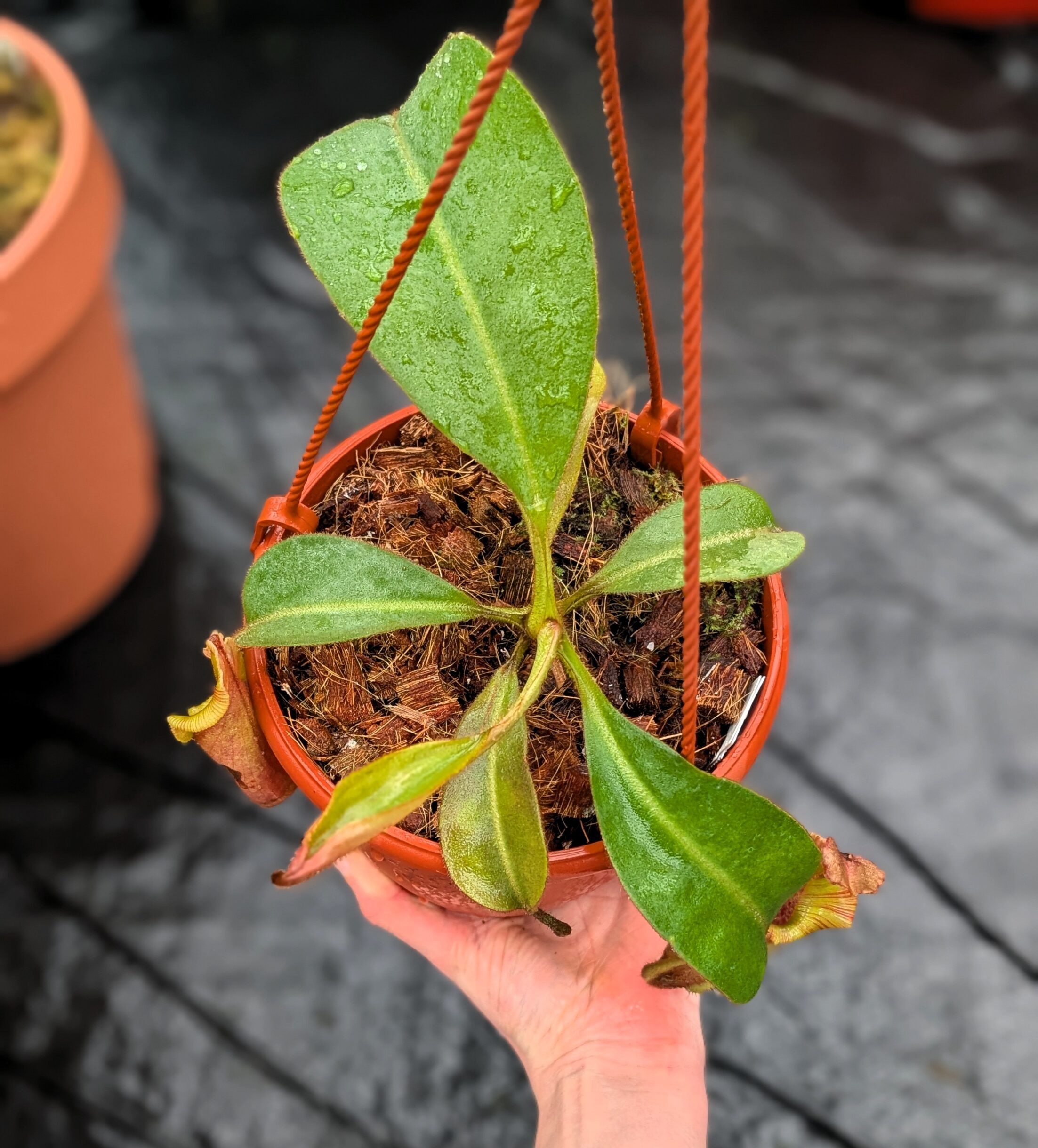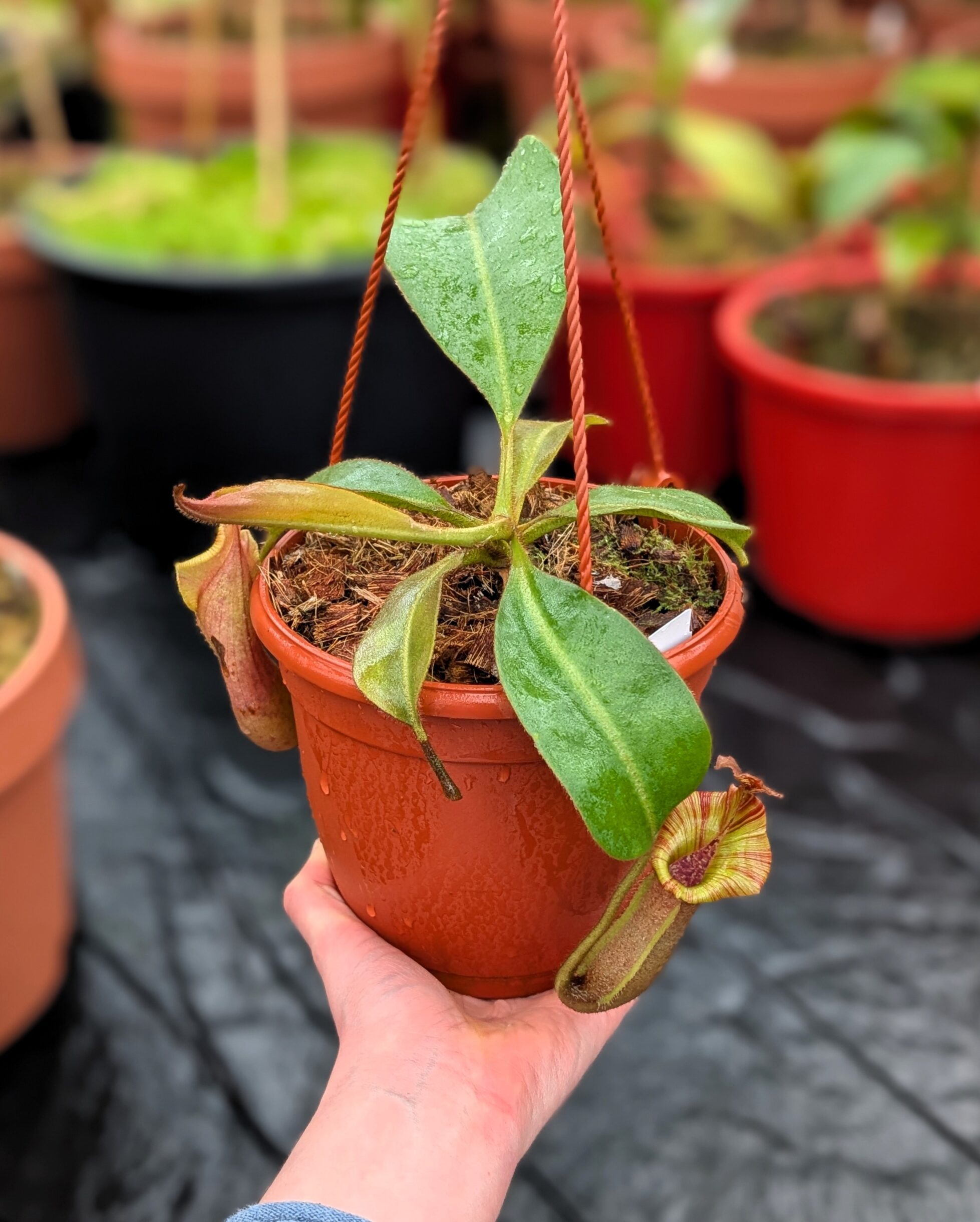 A striking and complex hybrid featuring elegant peristomes, bold pitcher shapes, and vibrant coloration inherited from multiple highland species. Vigorous and robust, it combines impressive aesthetics with reliable growth, making it a standout in any Nepenthes collection.