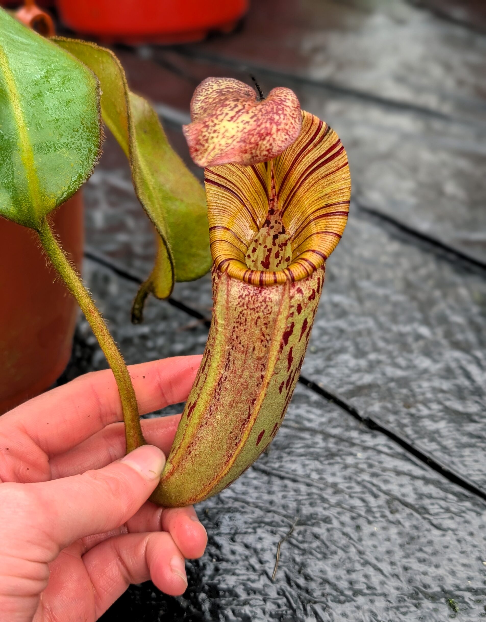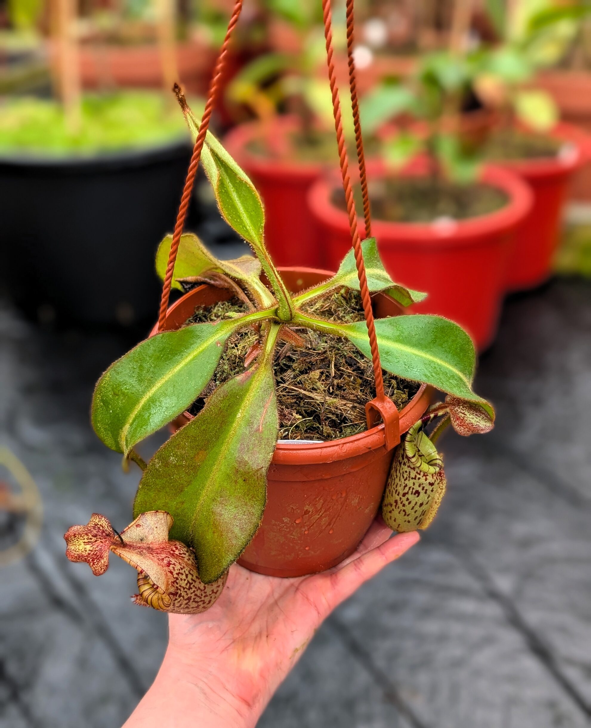 A distinctive Nepenthes hybrid combining bold structure and refined detail. Influences from N. boschiana and N. veitchii provide sturdy growth and well-formed pitchers, while N. mollis adds a softer, more elegant touch.