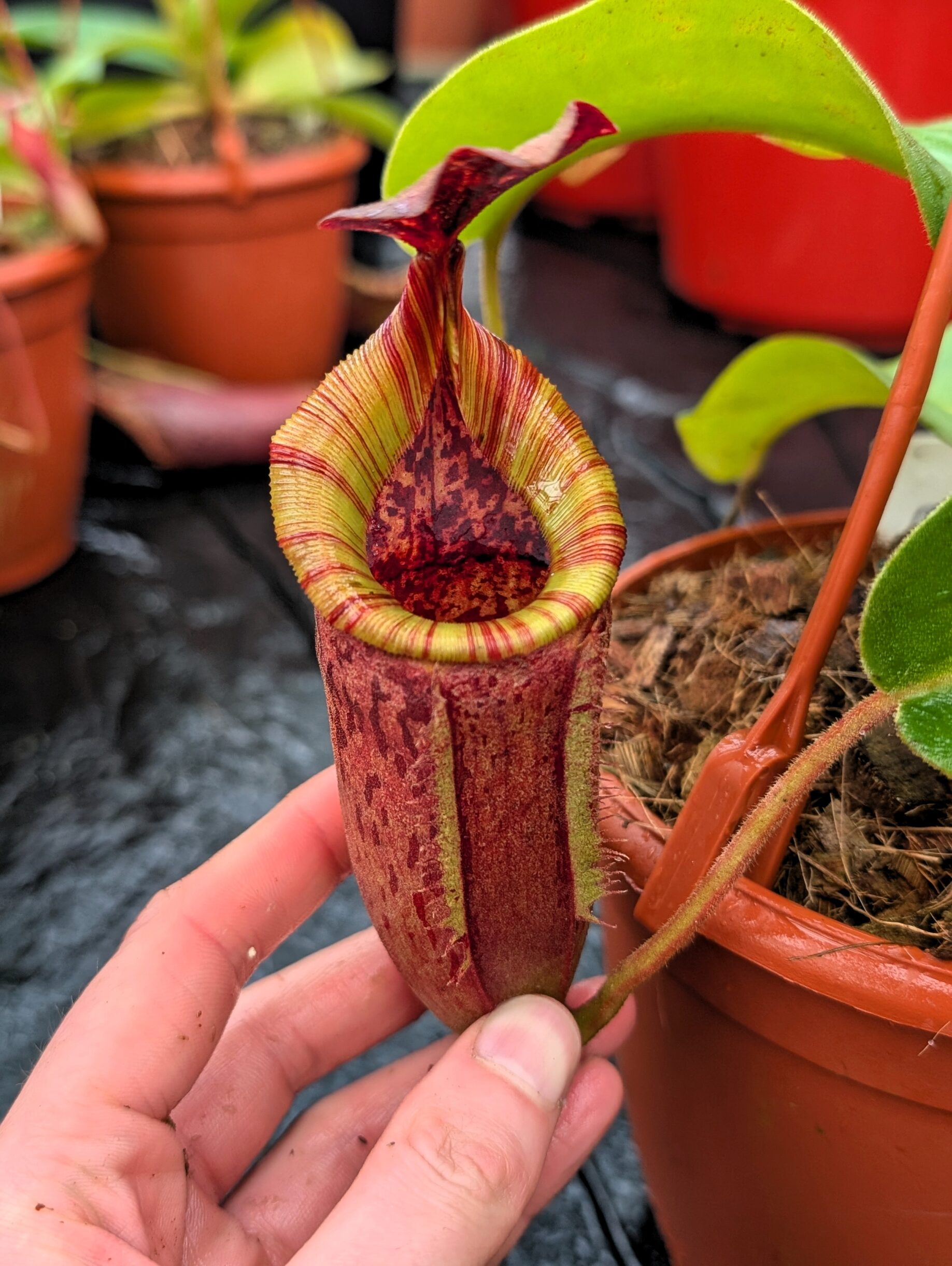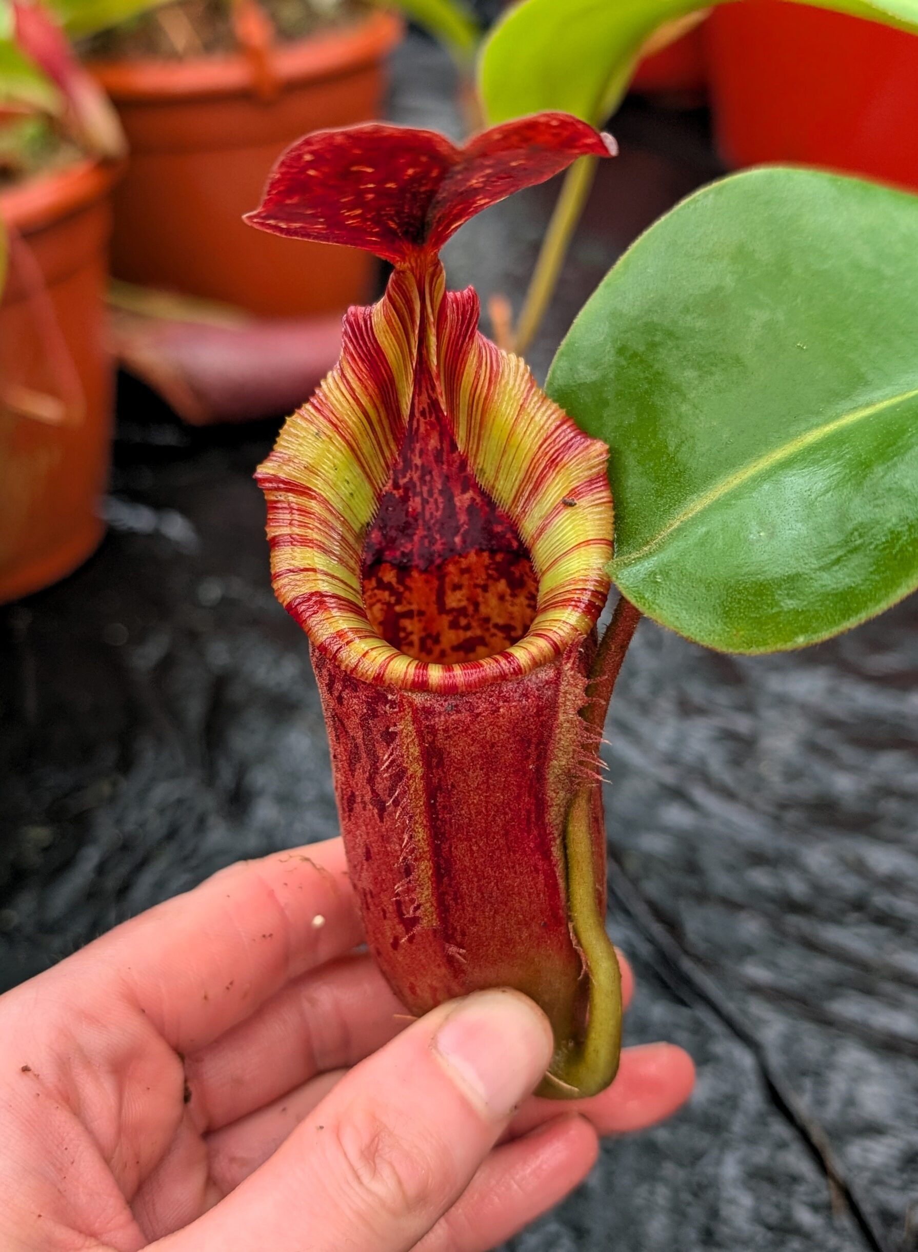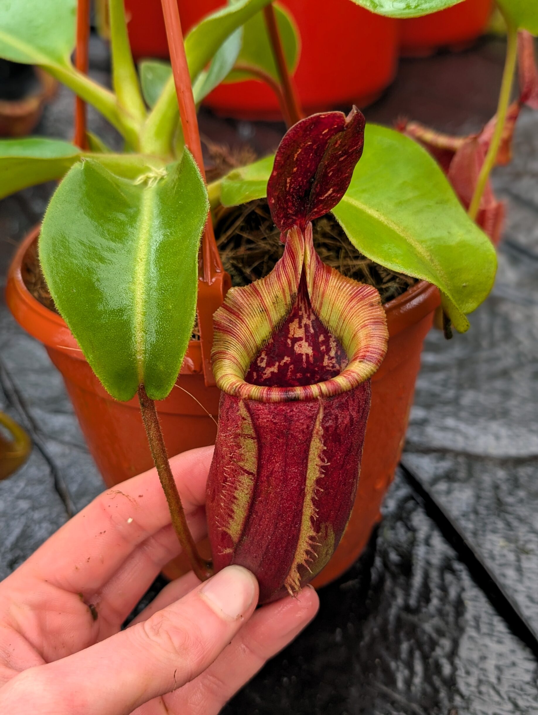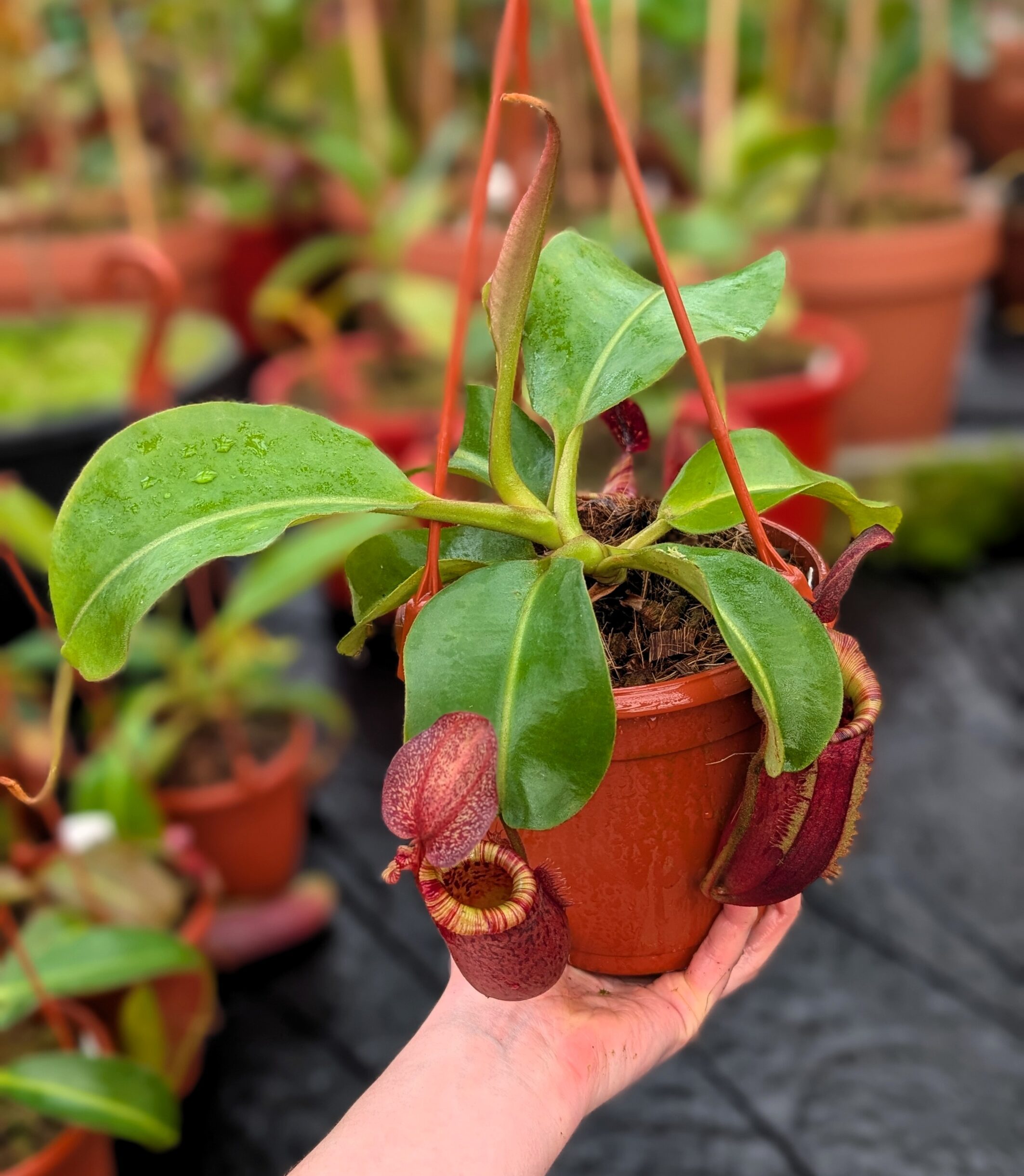 A spectacular multi-species hybrid combining the dramatic features of lowii, veitchii, boschiana, maxima, spectabilis, and ventricosa. This cross is bred for bold peristomes, striking pitcher coloration, and strong, compact growth.