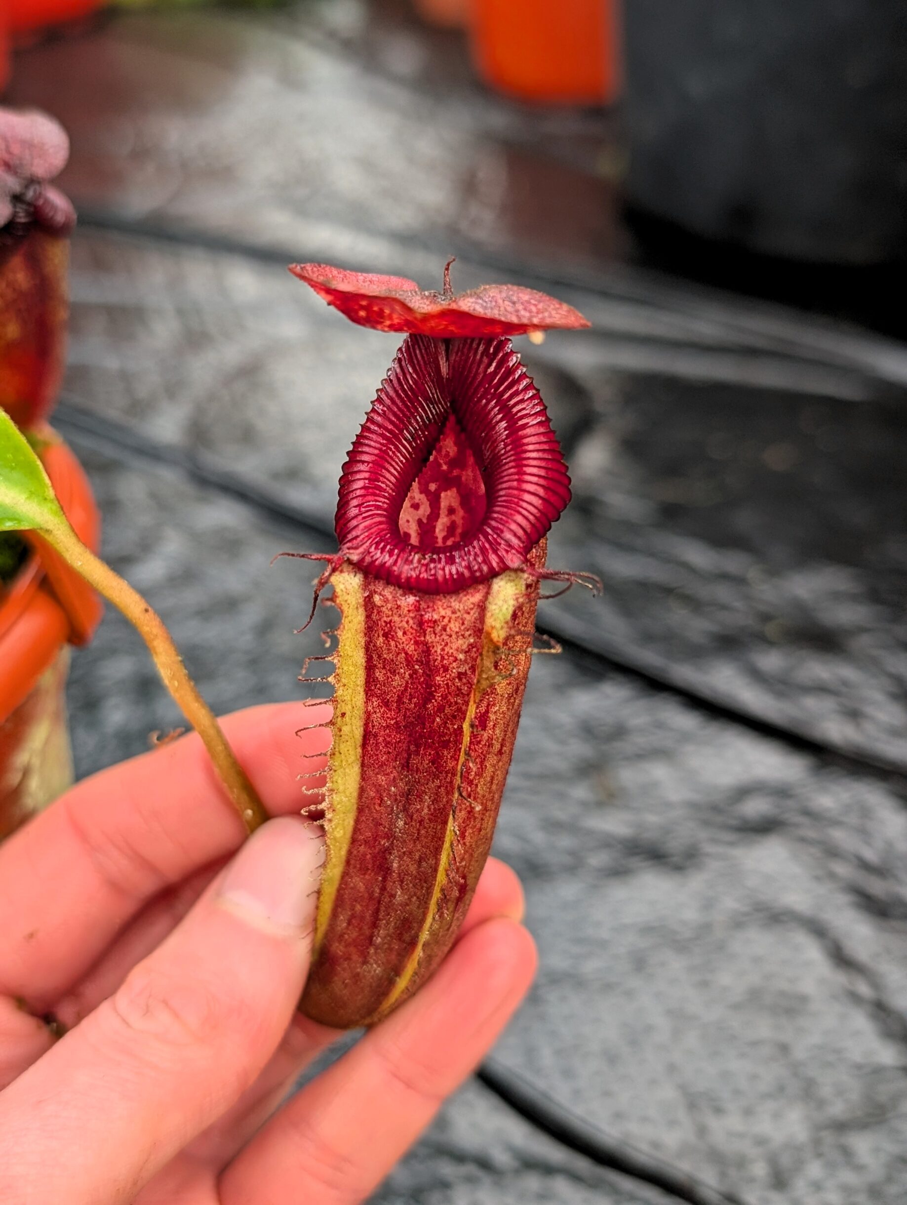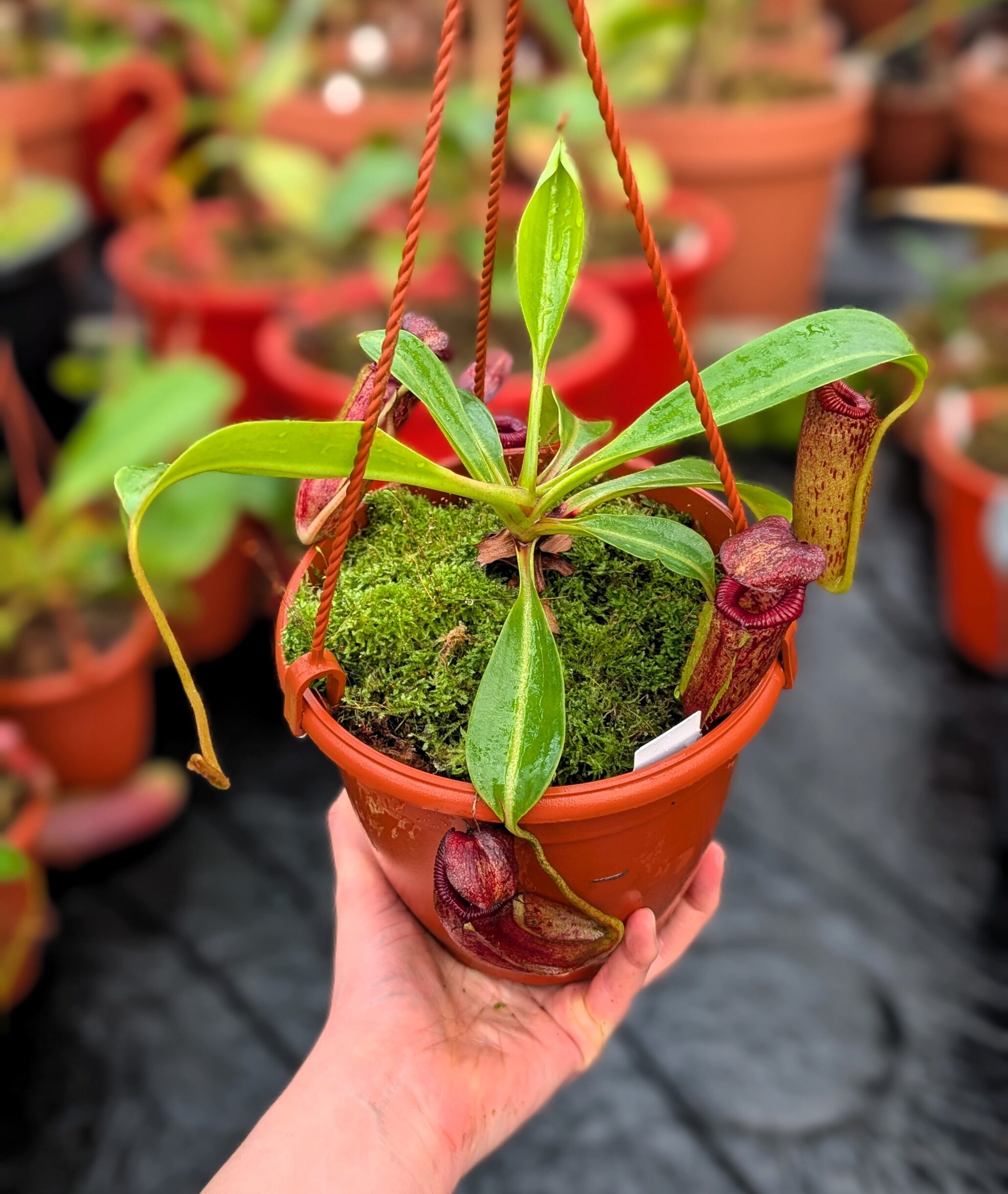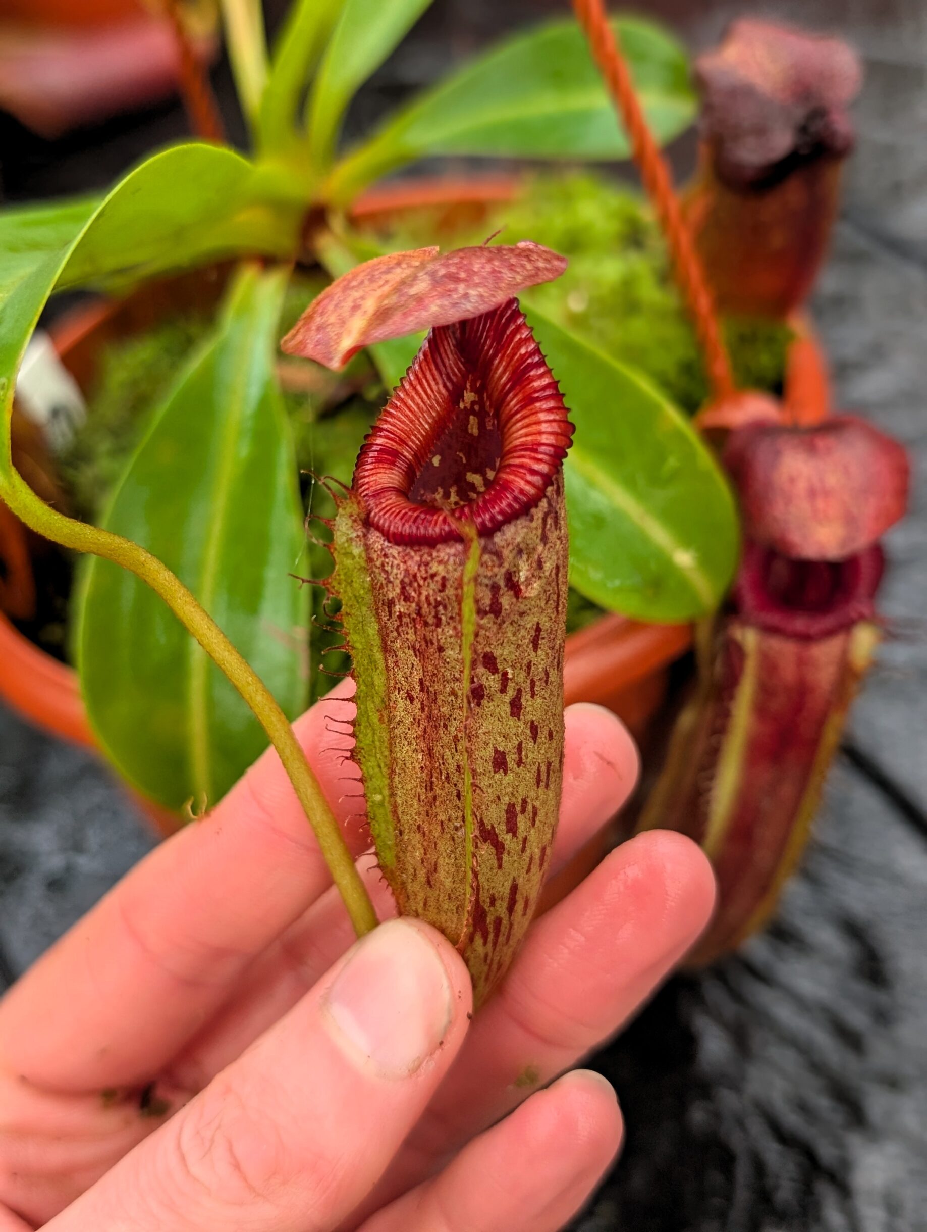 This hybrid promises rich coloration, flared striped peristomes, and strong, compact growth.
