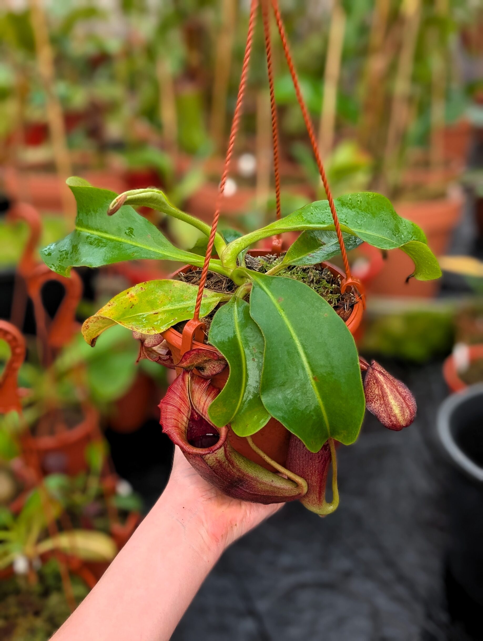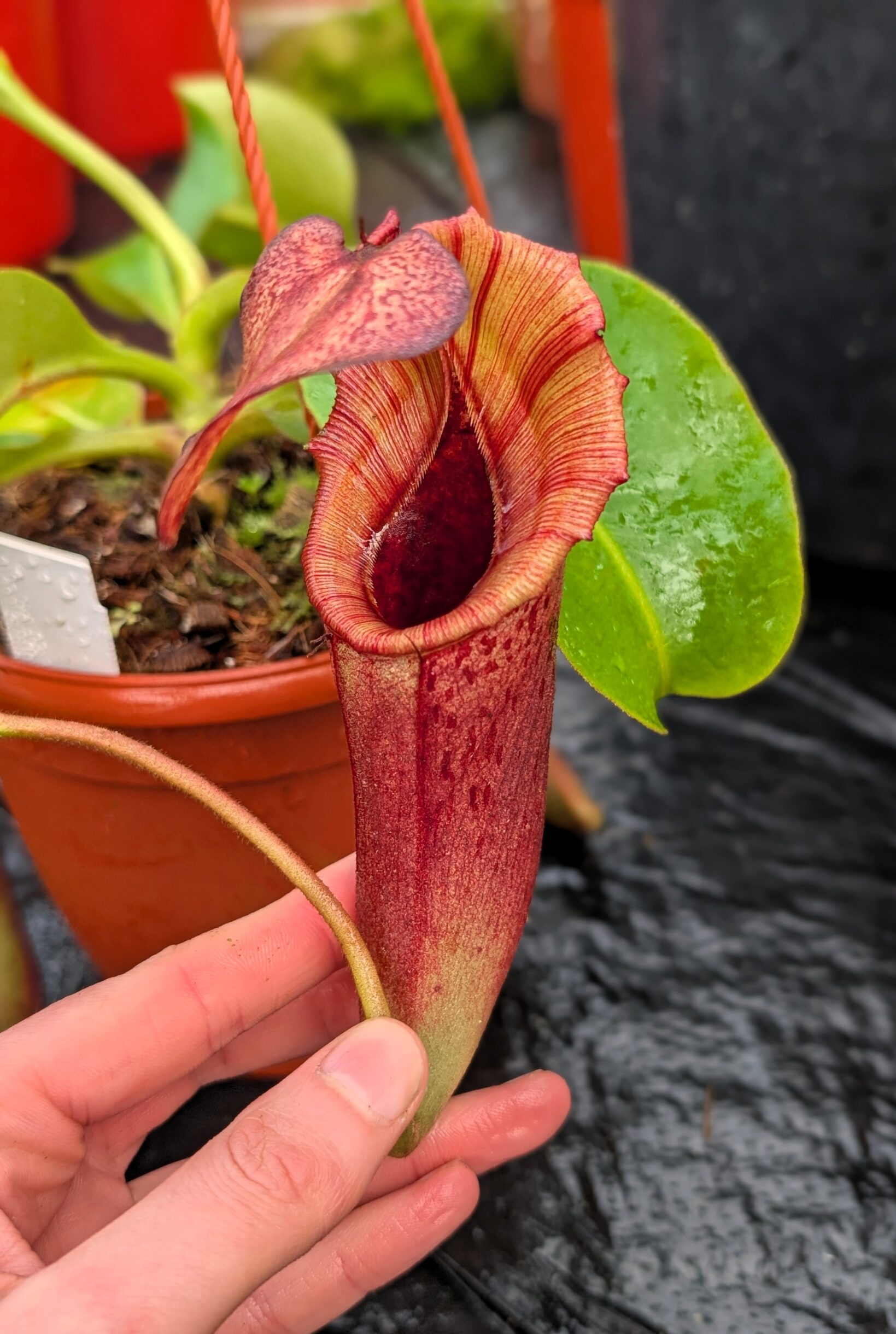 A spectacular multi-species hybrid combining the dramatic features of lowii, veitchii, boschiana, maxima, spectabilis, and ventricosa. This cross is bred for bold peristomes, striking pitcher coloration, and strong, compact growth.