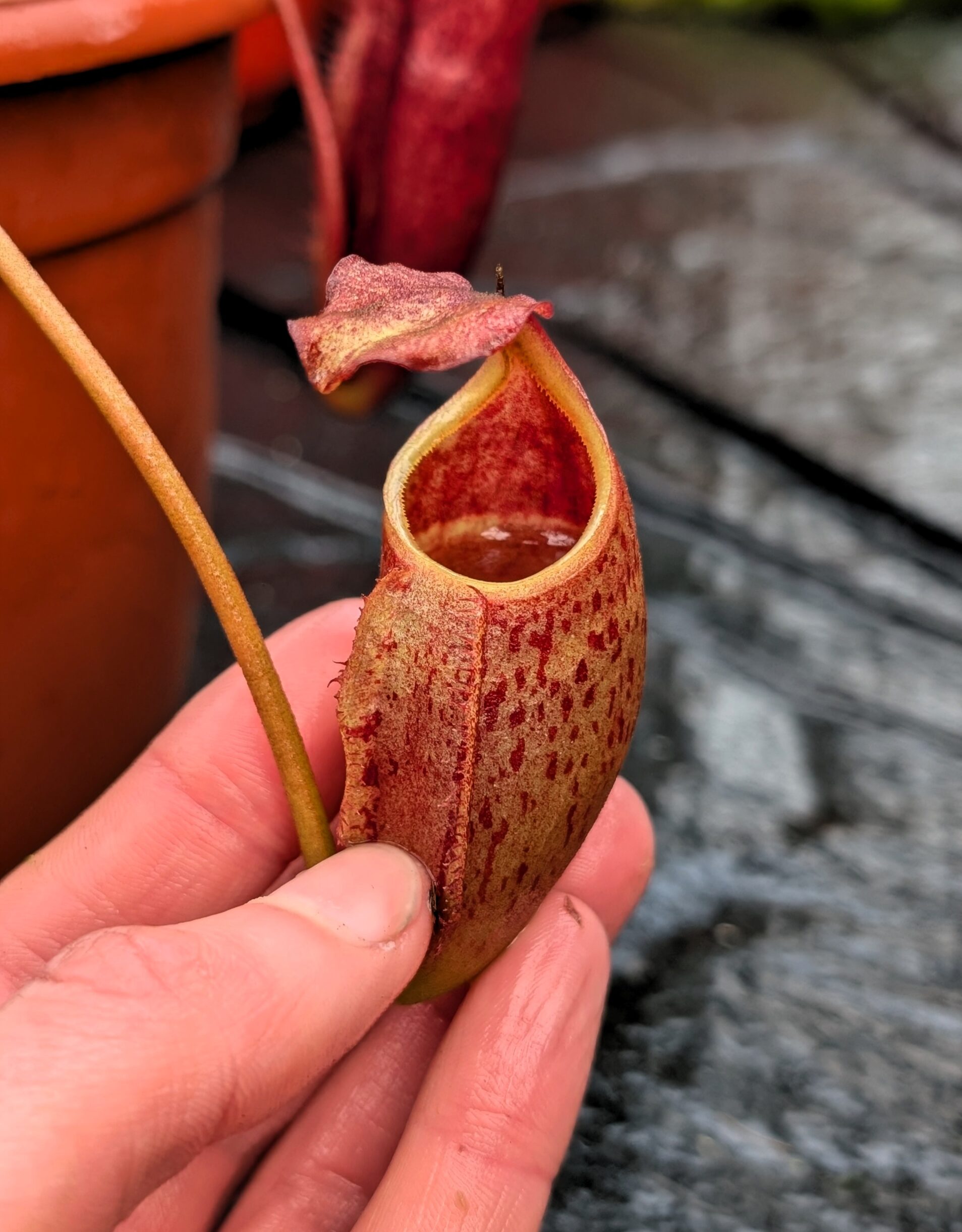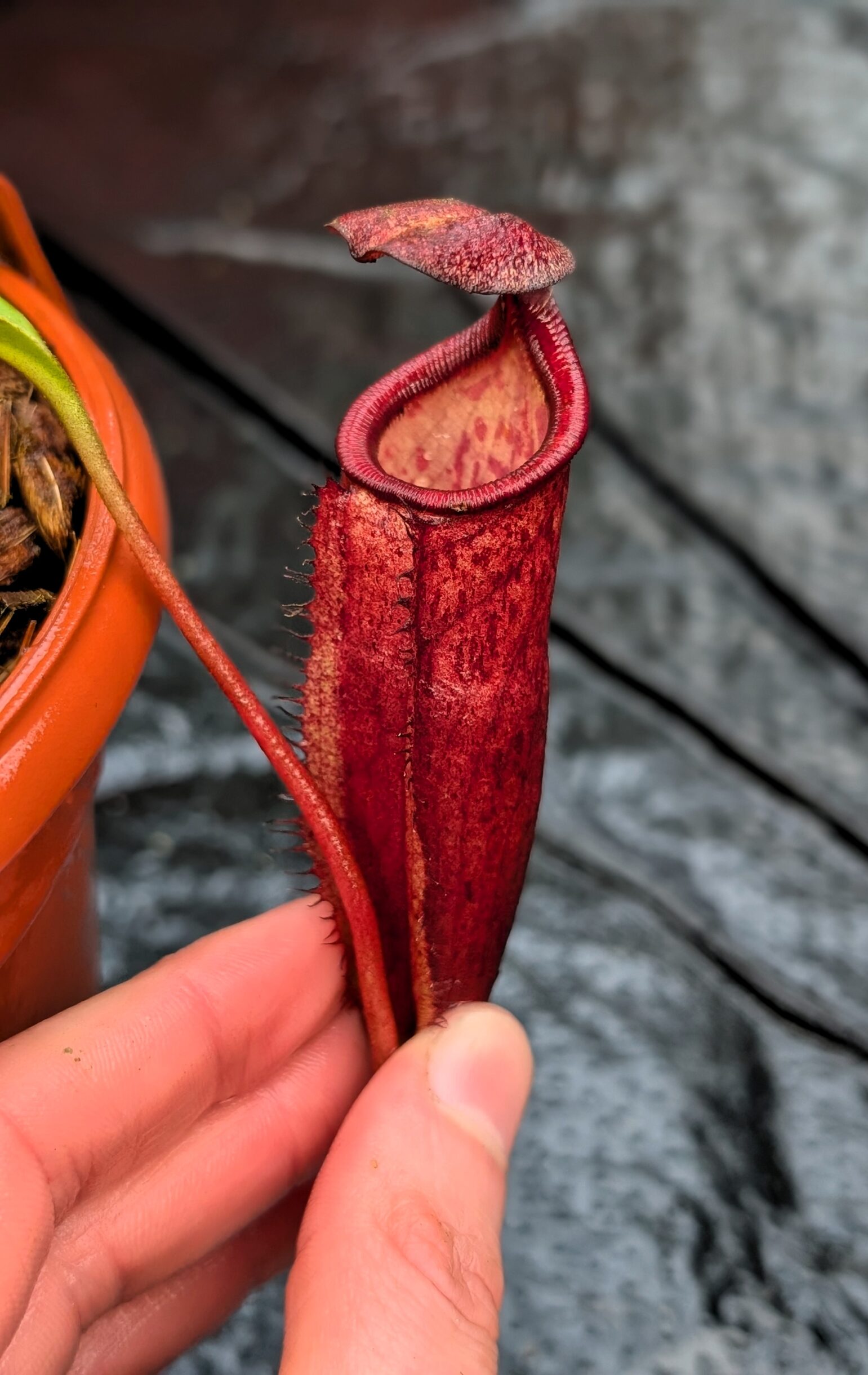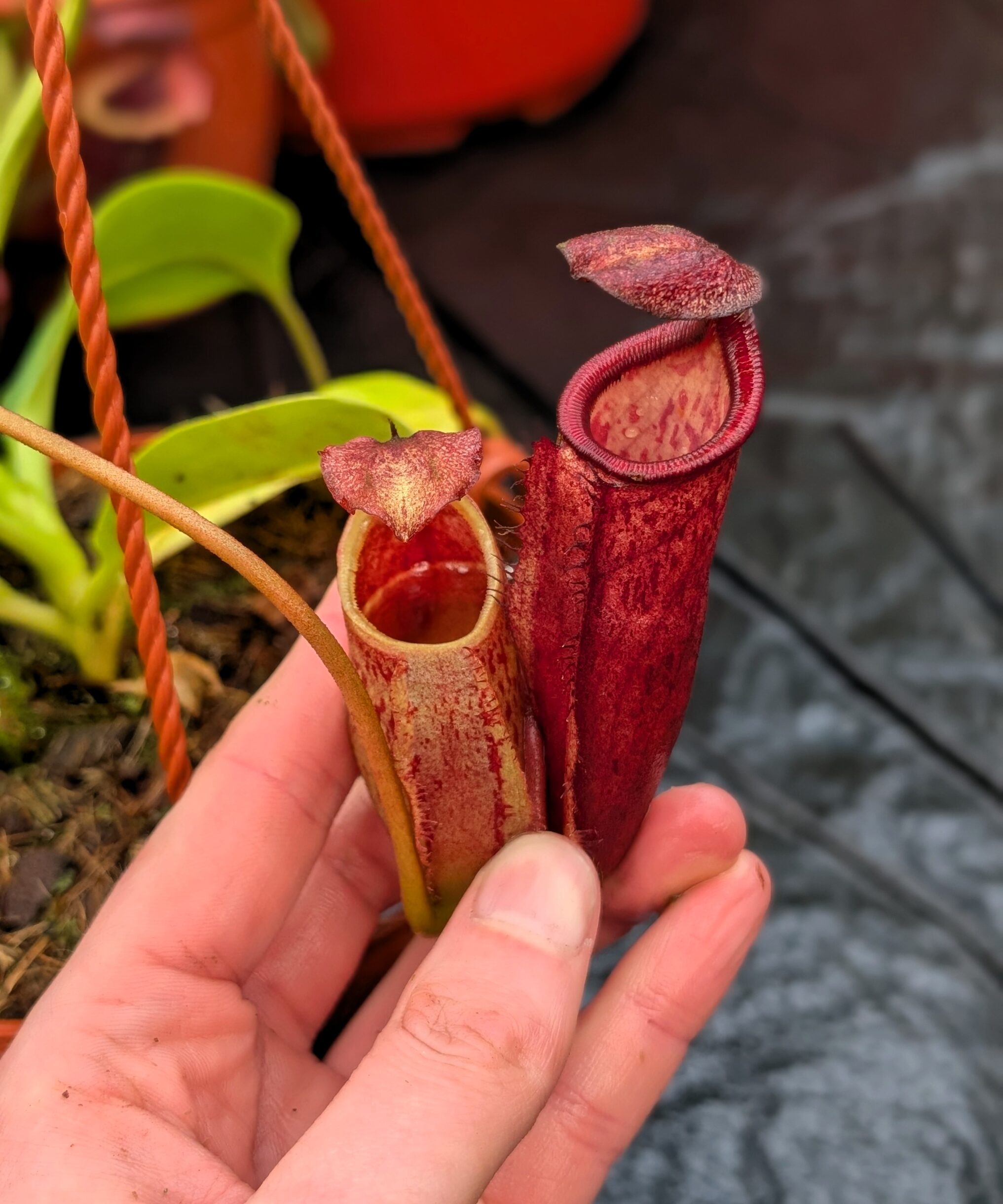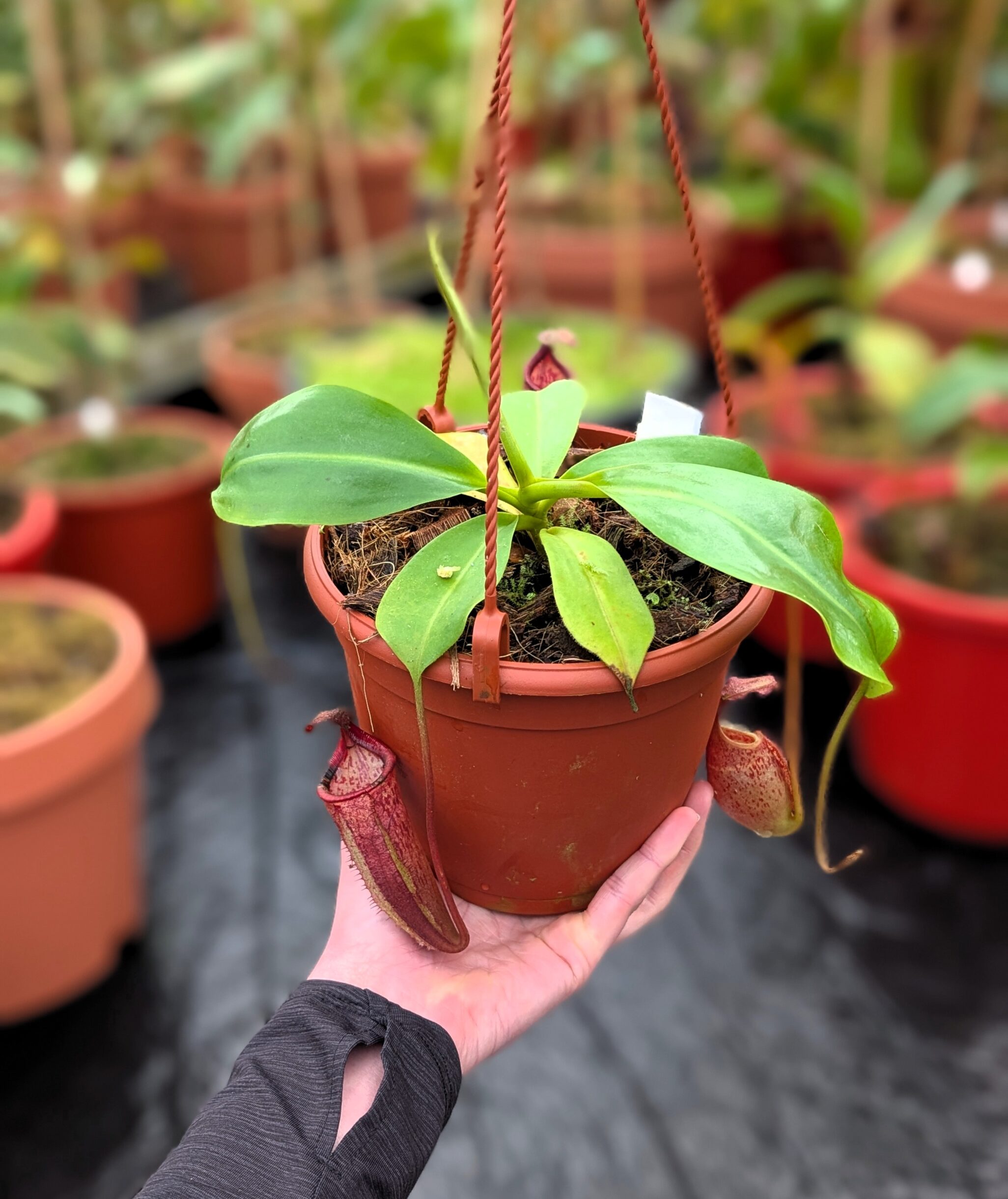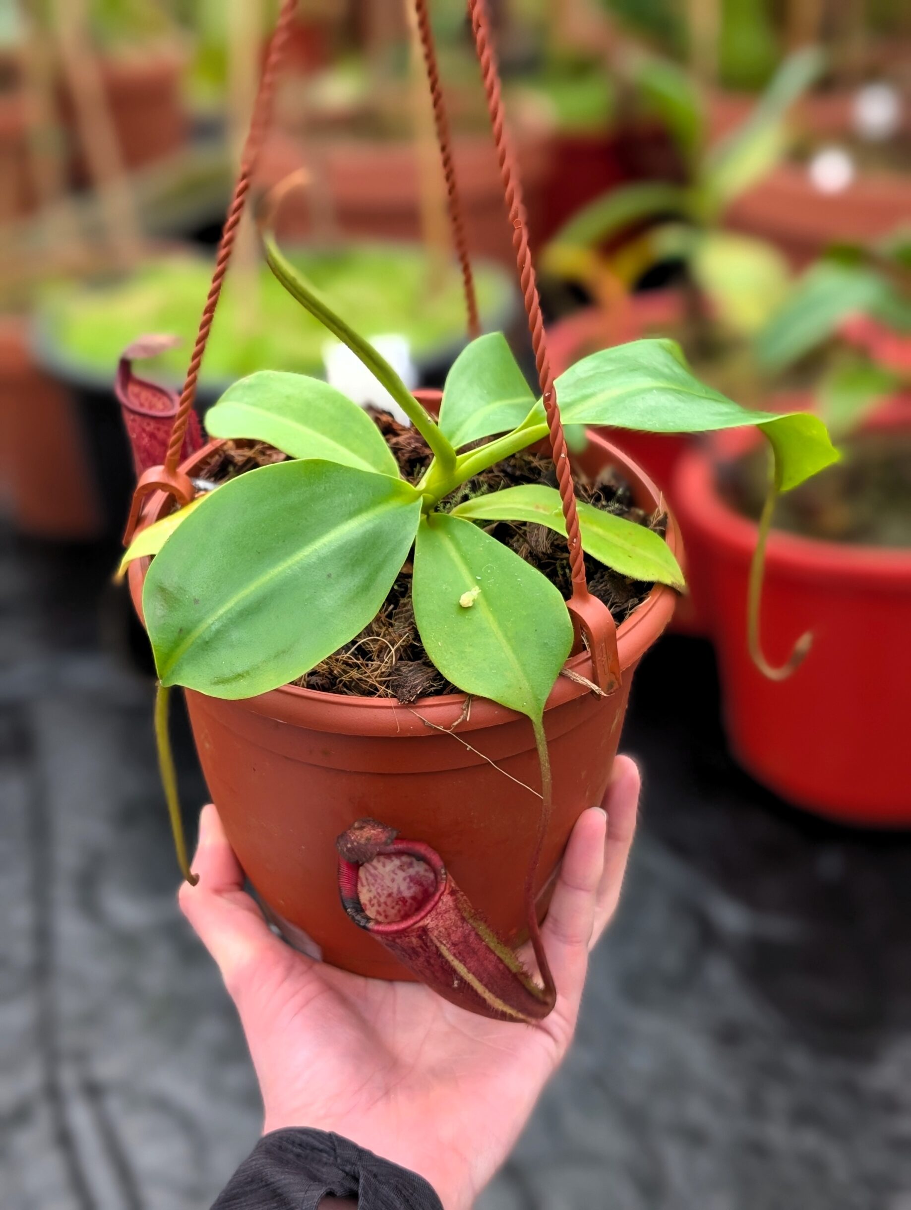This cross combines the bold character and colorful, flared peristome of N. mira with the elegant shapes and fascinating traits of lowii, veitchii, and campanulata.