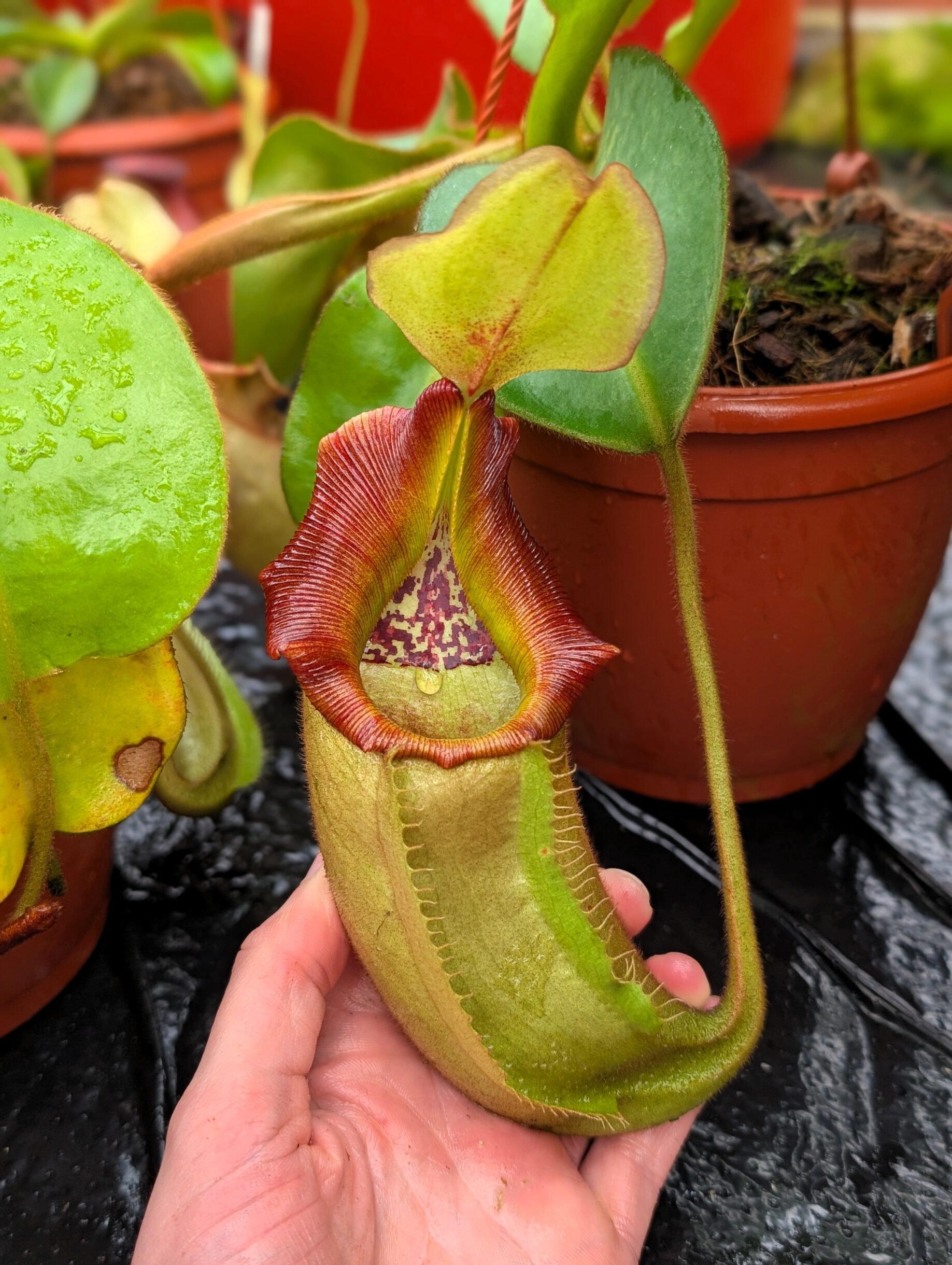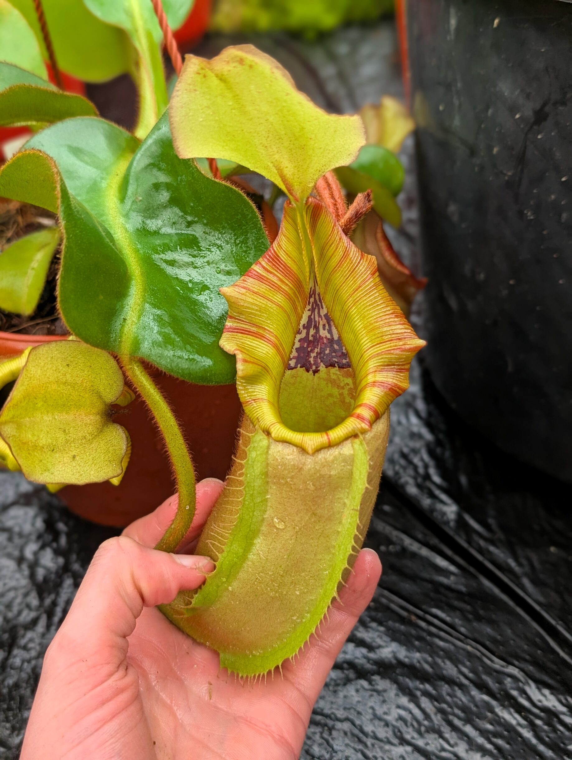 A striking hybrid combining the key traits of three iconic species: bold peristomes, unique pitcher shapes, and rich coloration.