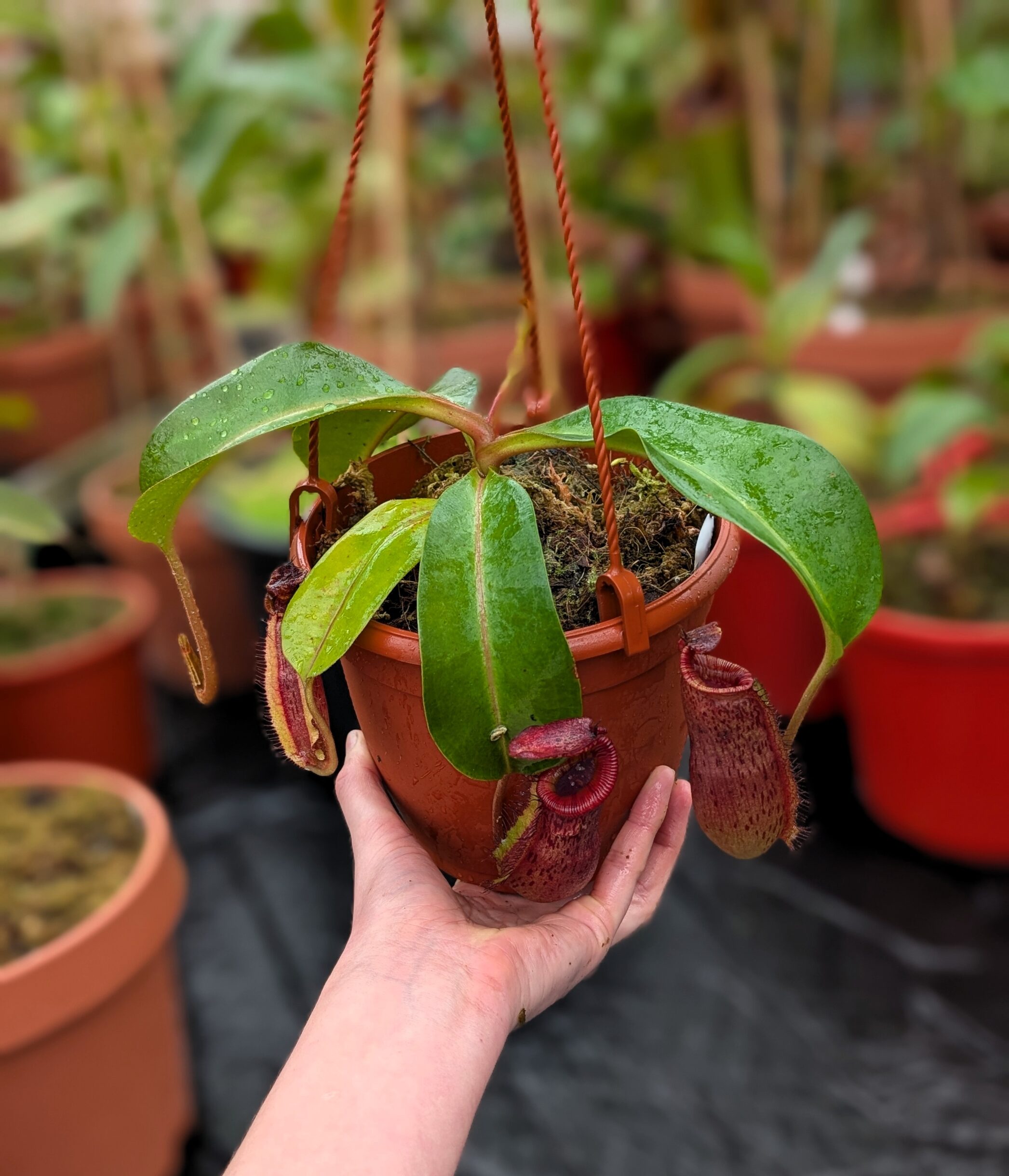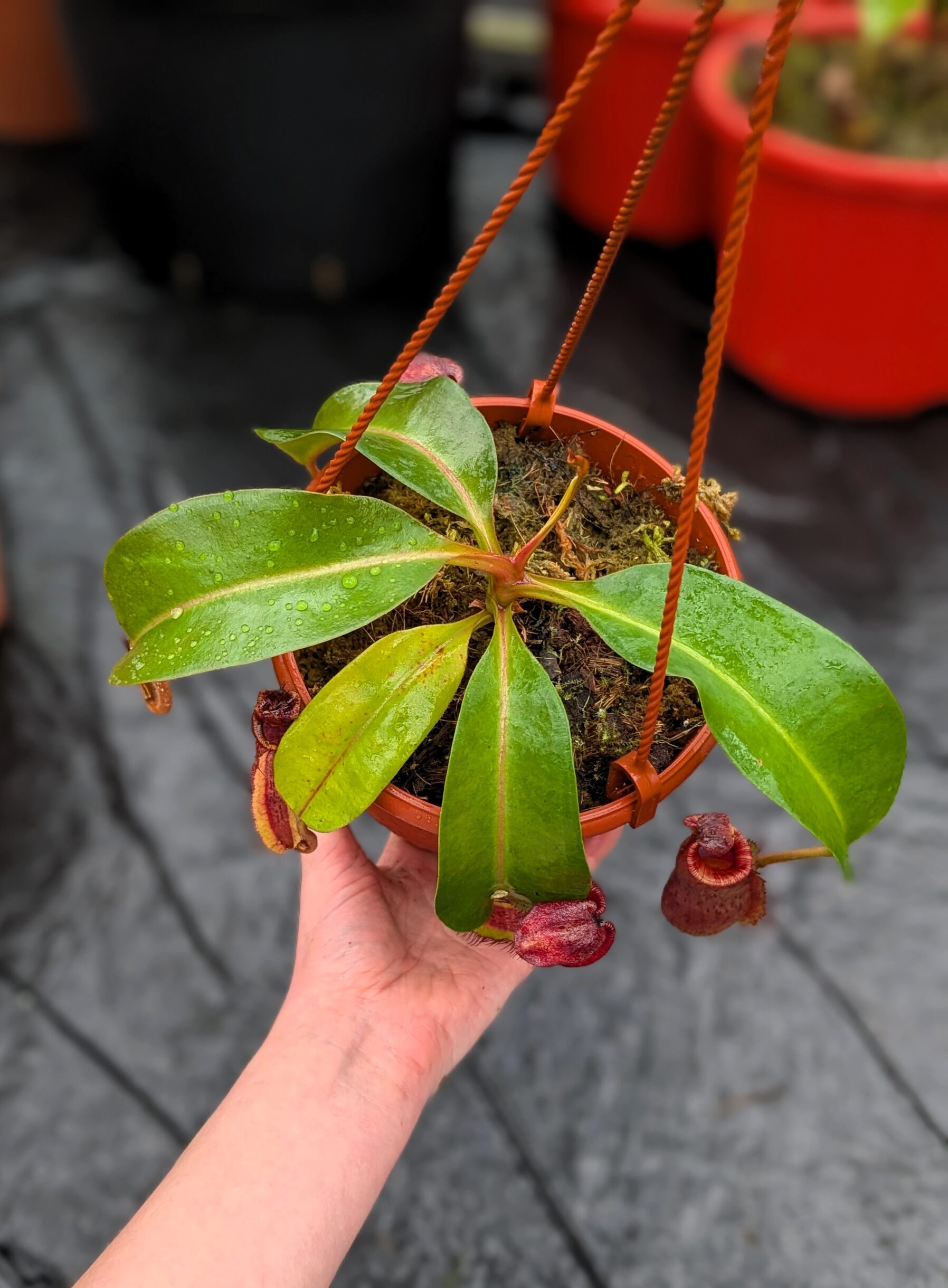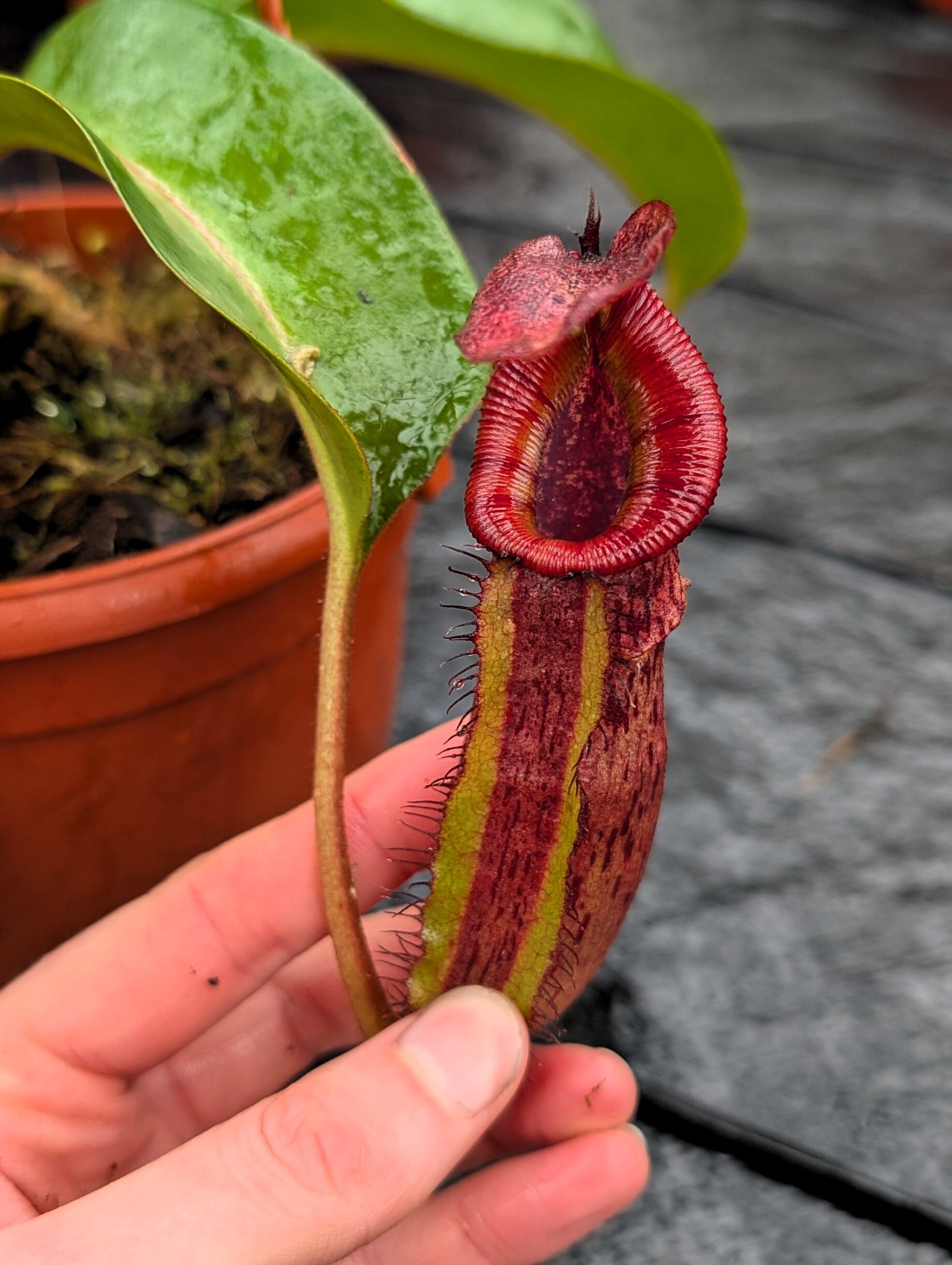 A unique, multi-generation Nepenthes hybrid. Characterized by vigorous growth, solid pitcher and refined details. This plant has excellent long-term potential.