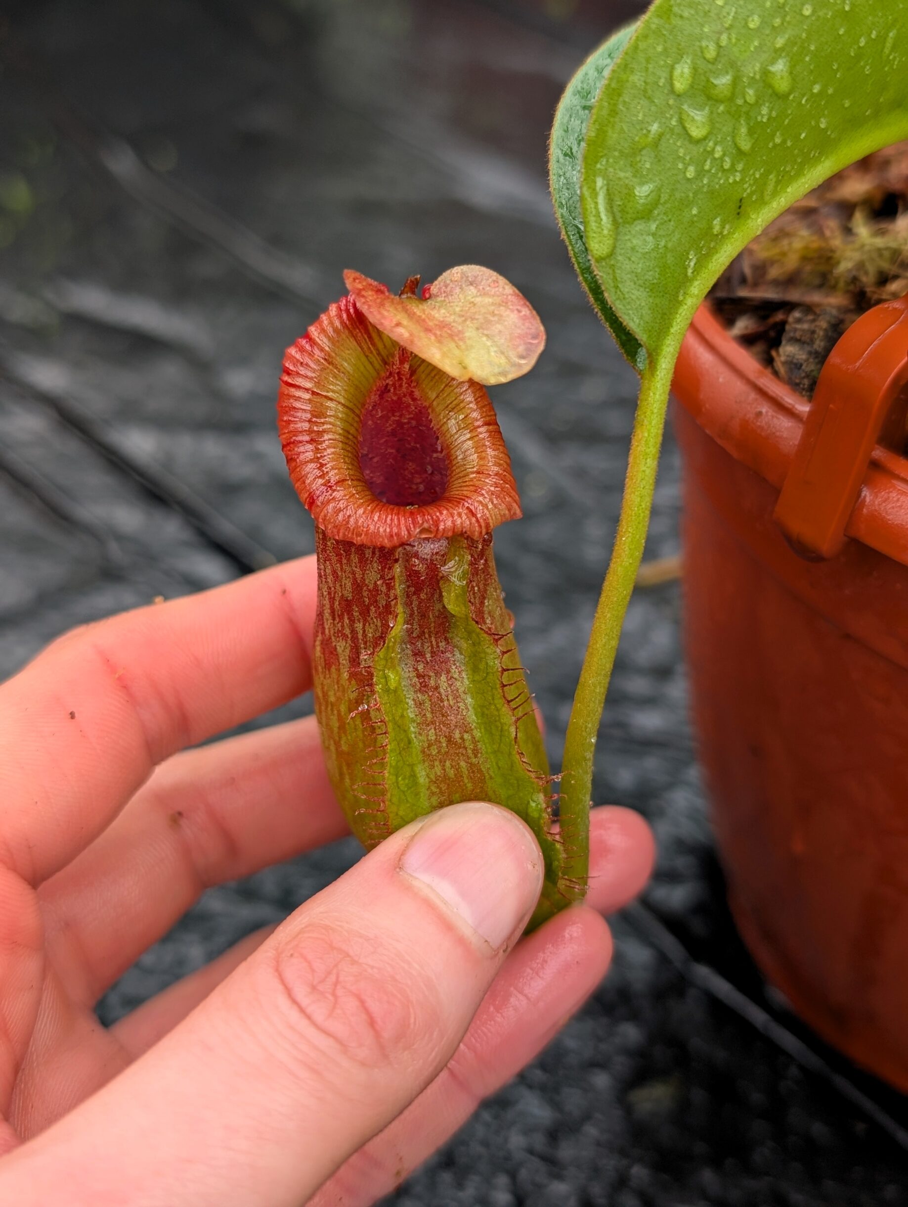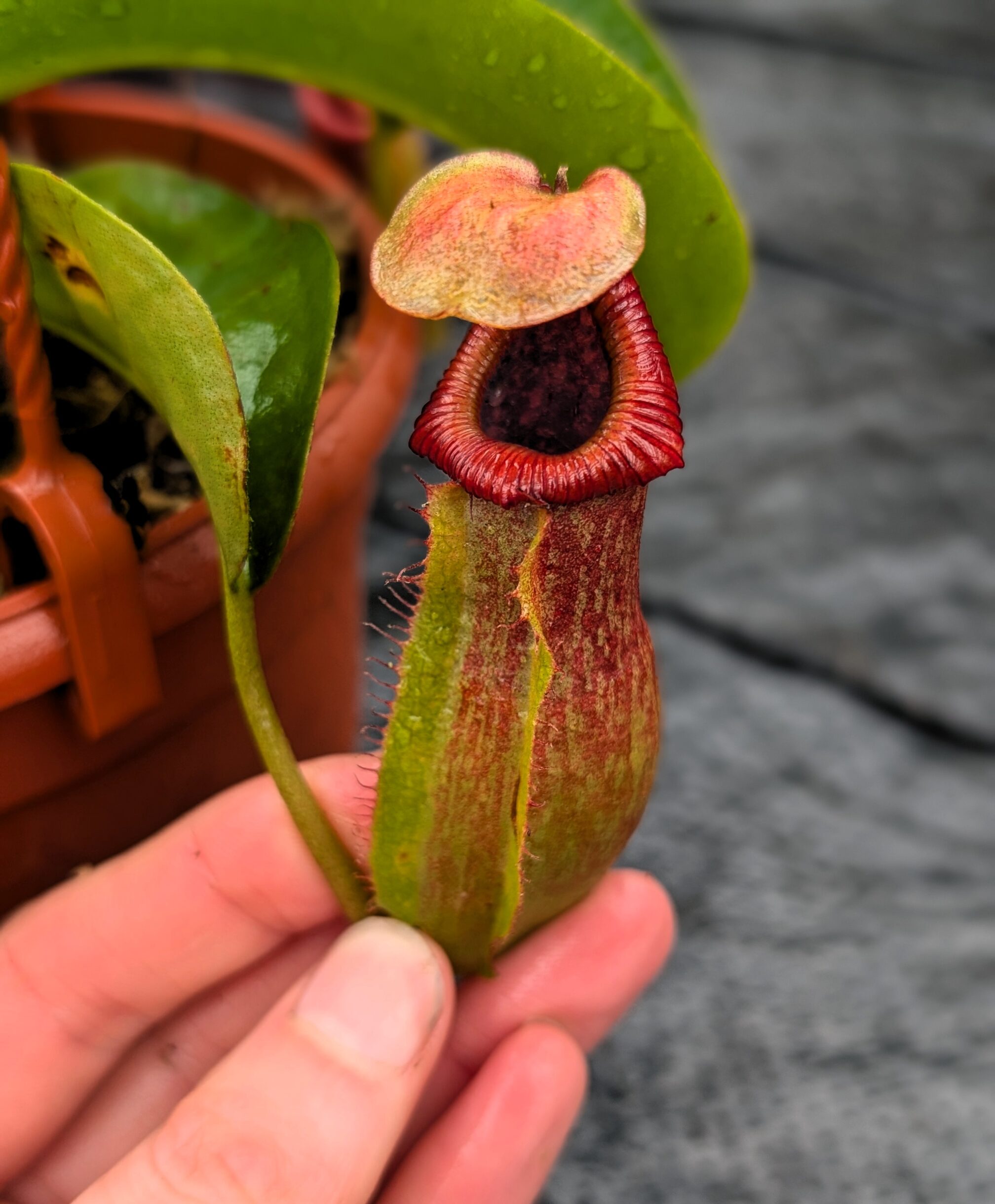 A unique, multi-generation Nepenthes hybrid. Characterized by vigorous growth, solid pitcher and refined details. This plant has excellent long-term potential.