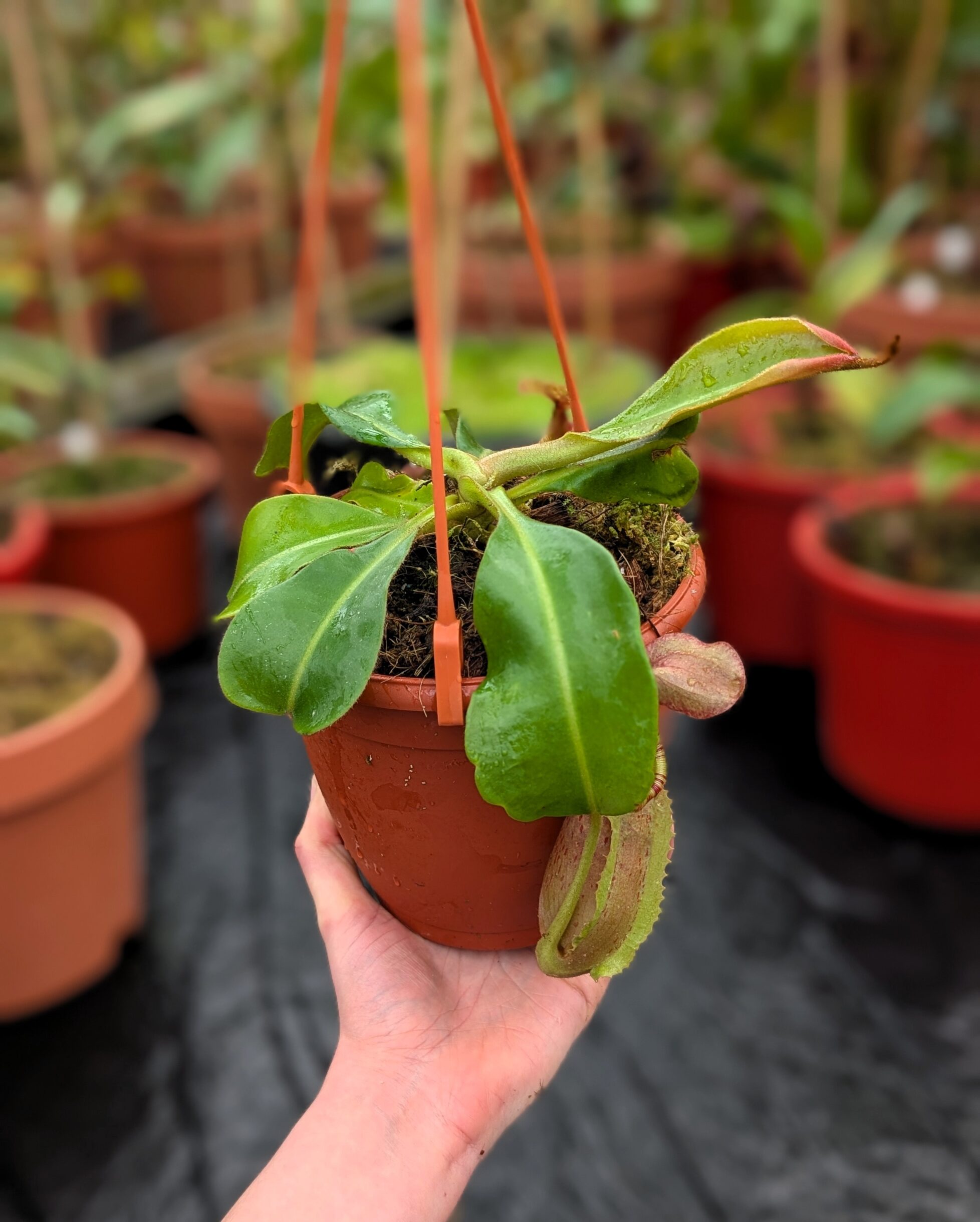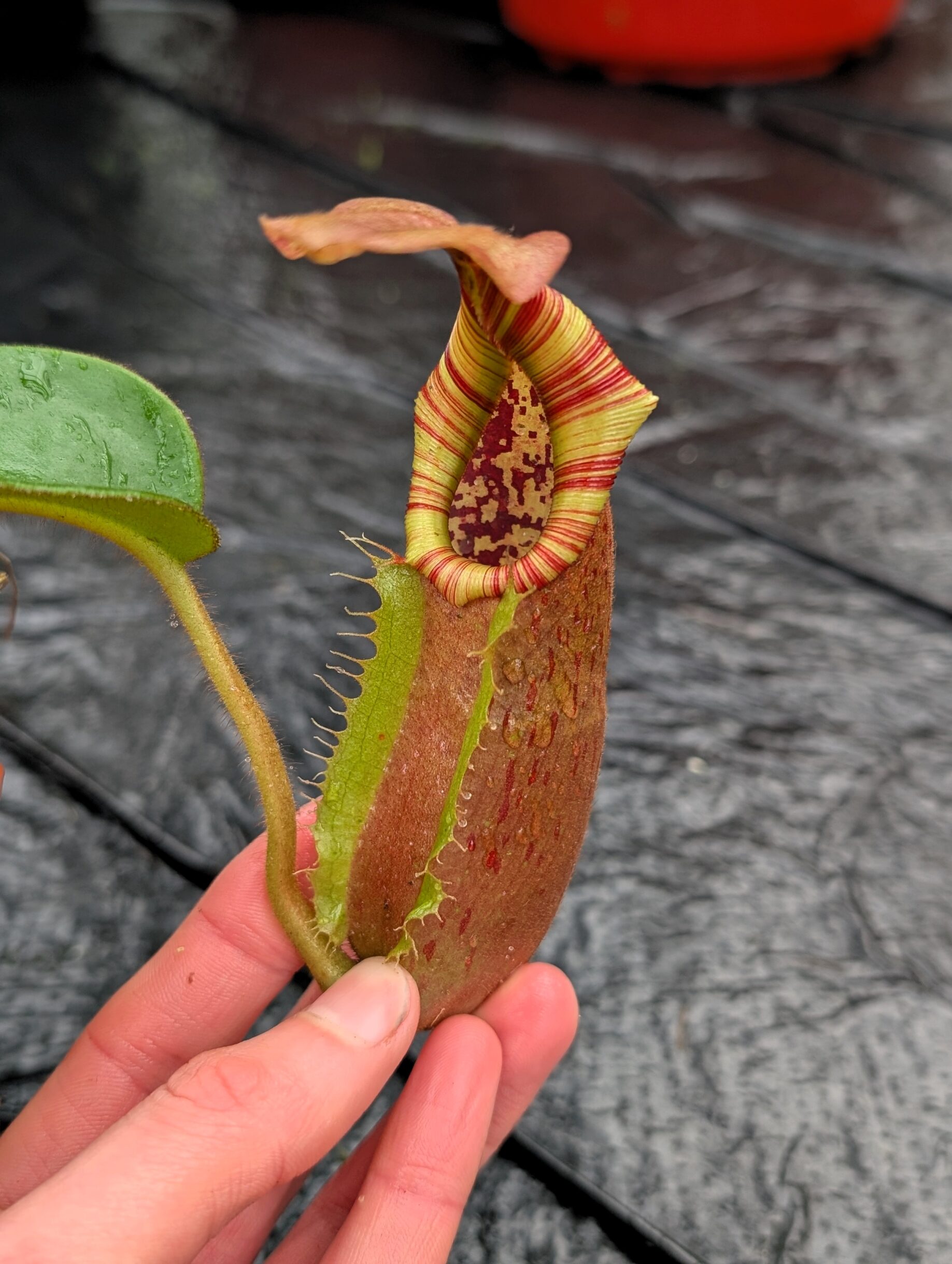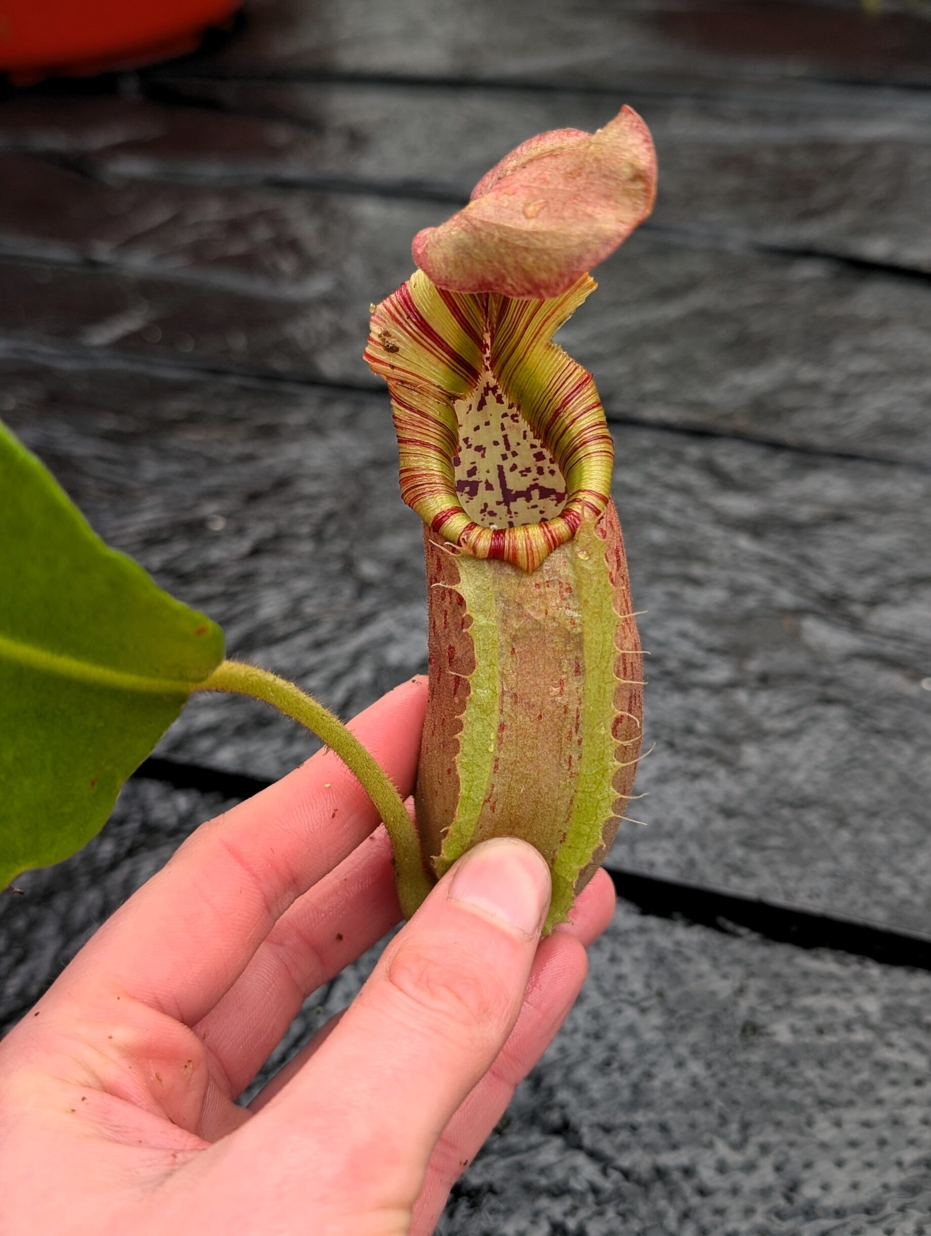 1196: N. ([Rokko ‘Exotica’ x boschiana) x veitchii] x {maxima x [(stenophylla x lowii) x (Rokko x veitchii)]}) x veitchii (m) – red, striped peristome – EP – (24 cm)