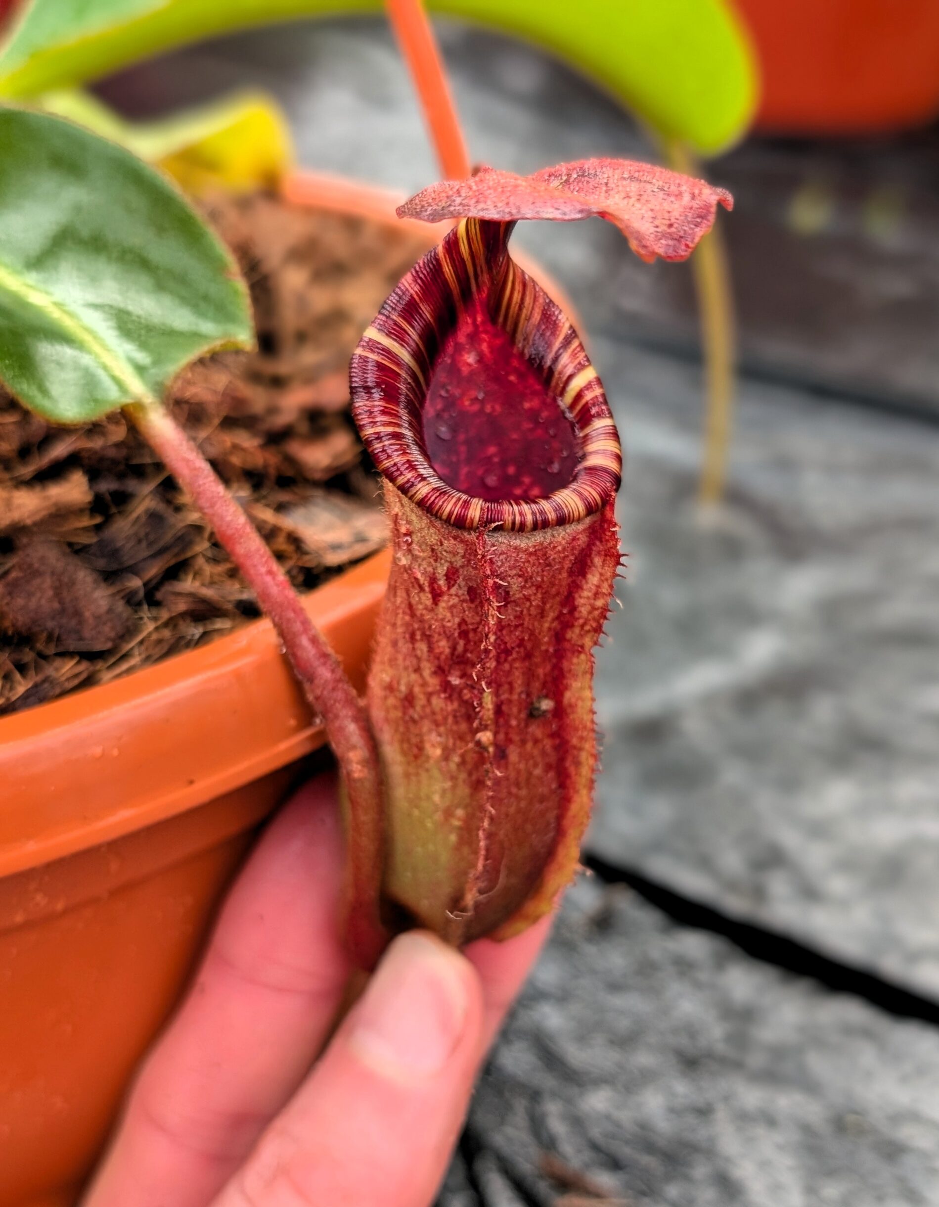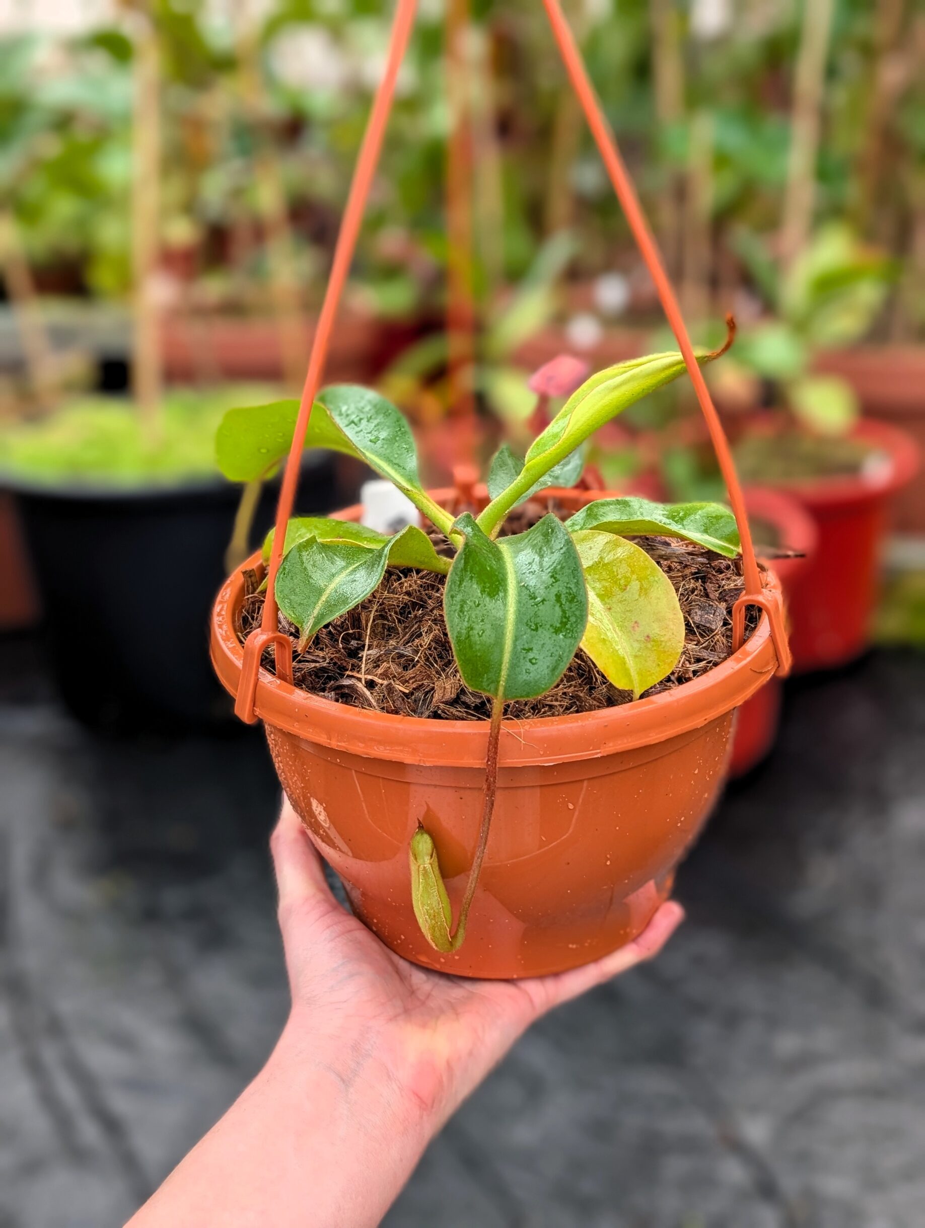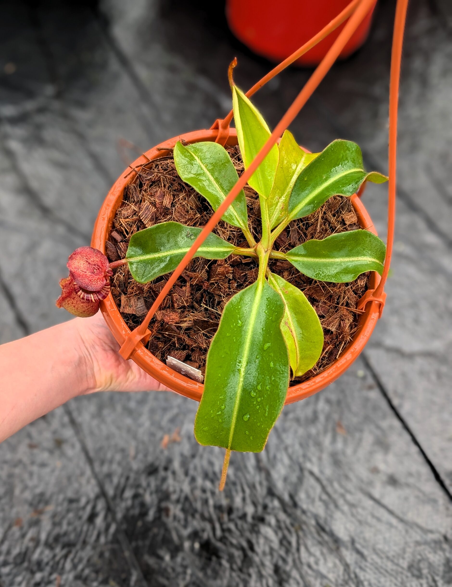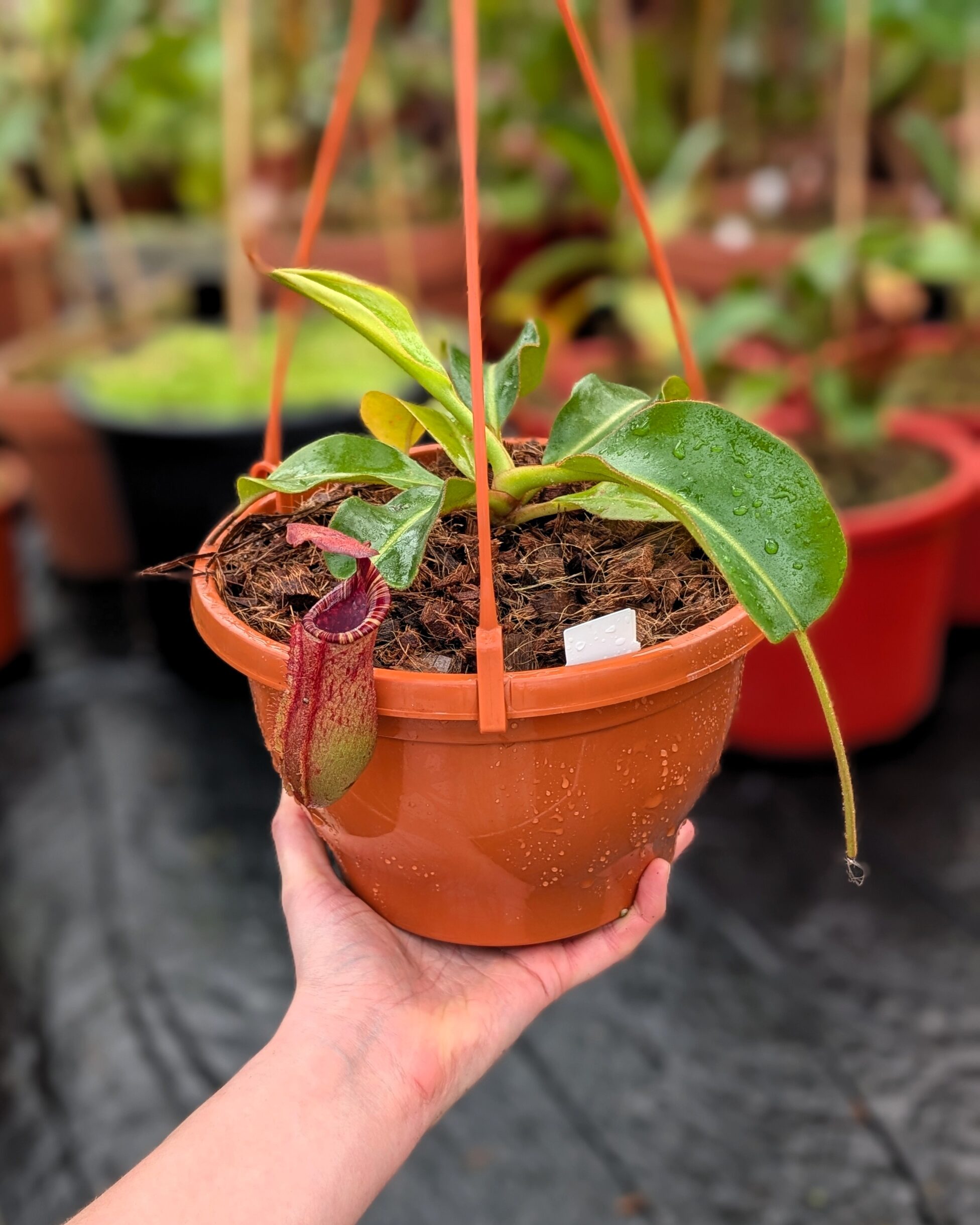 A striking and complex hybrid featuring elegant peristomes, bold pitcher shapes, and vibrant coloration inherited from multiple highland species. Vigorous and robust, it combines impressive aesthetics with reliable growth, making it a standout in any Nepenthes collection.