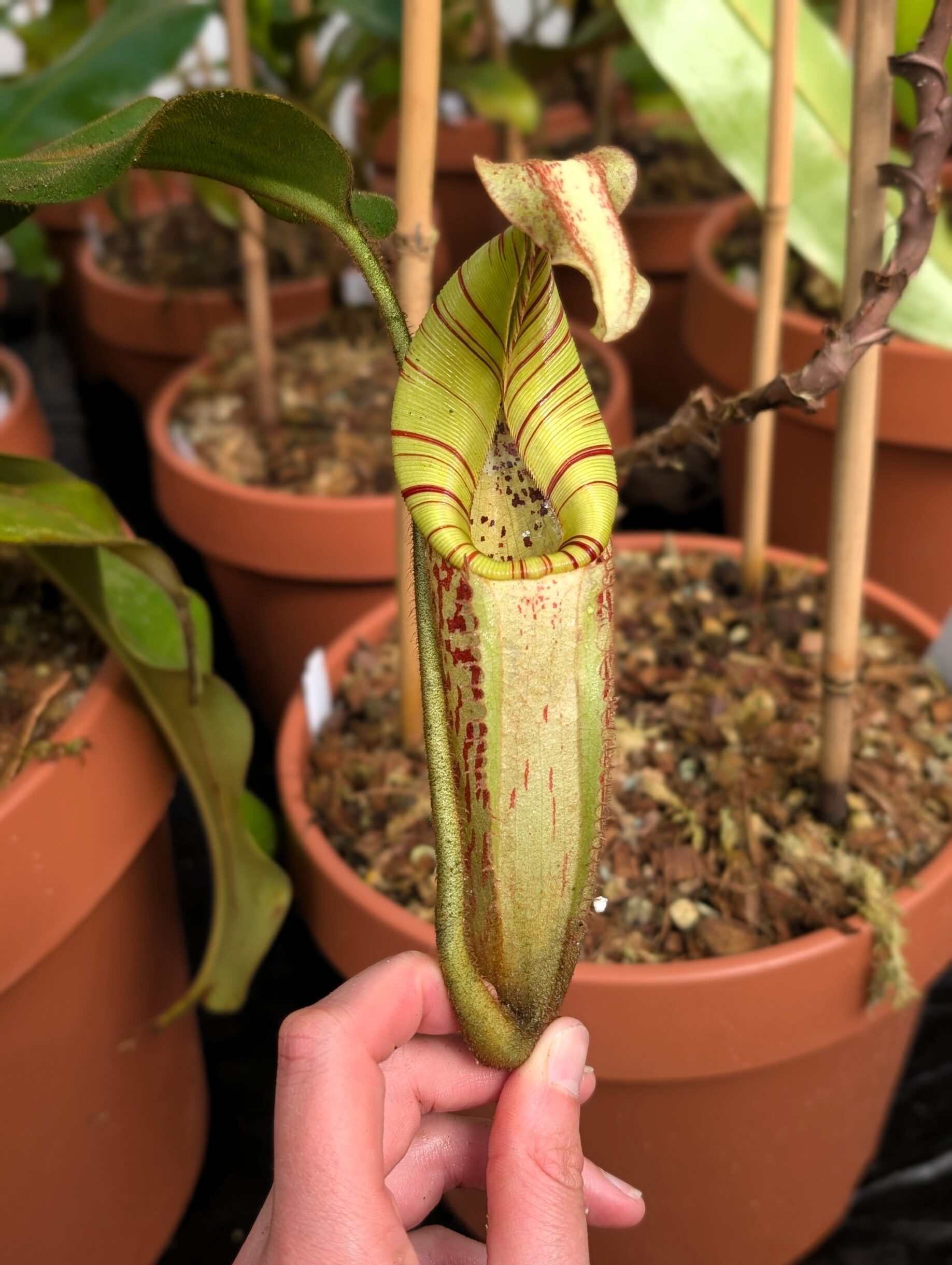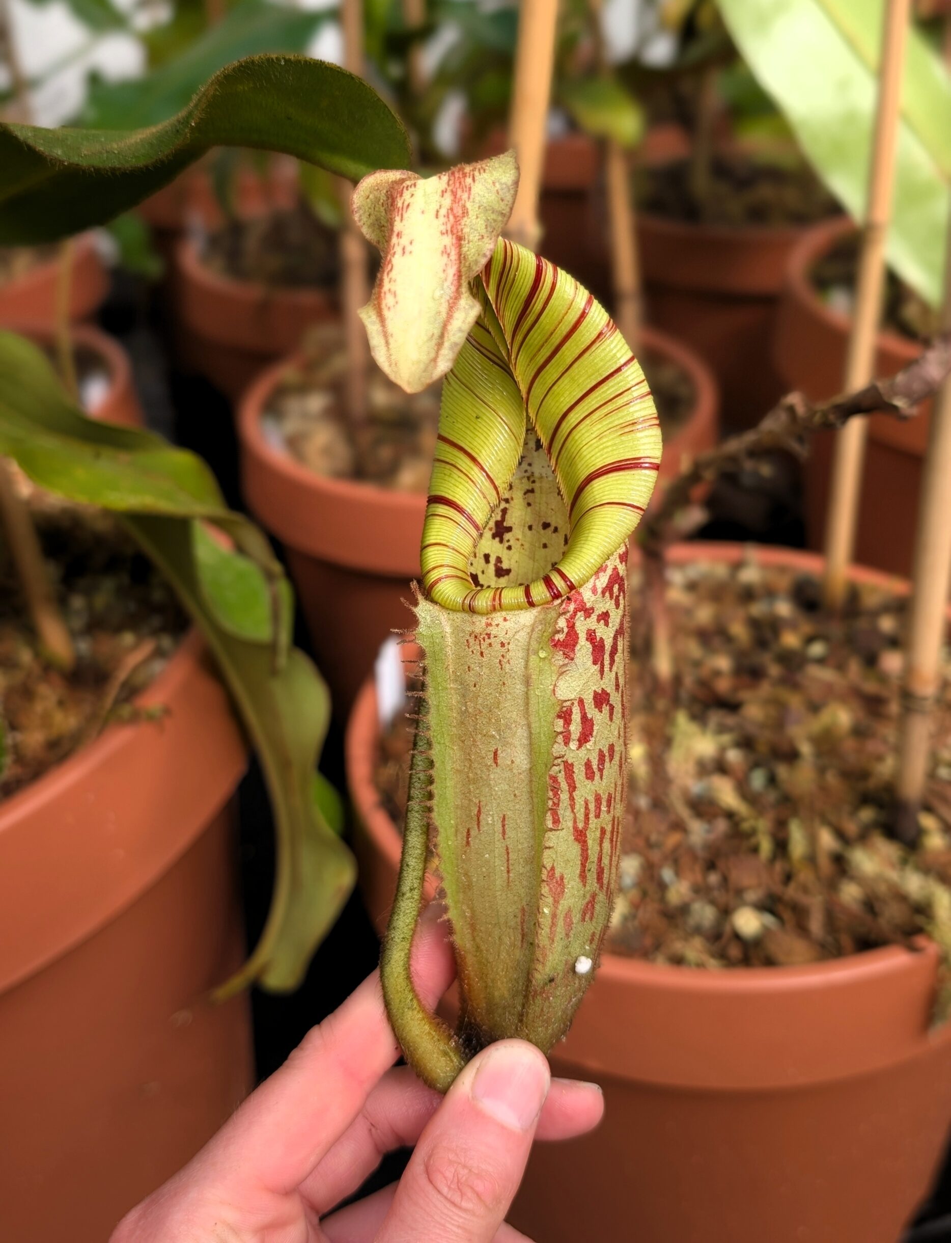 All the plants from this cross show an amazing long necked peristome with dark stripes that last with the aging of the picher. It is a very fast grower as well! Beautiful new hybrid from EP!