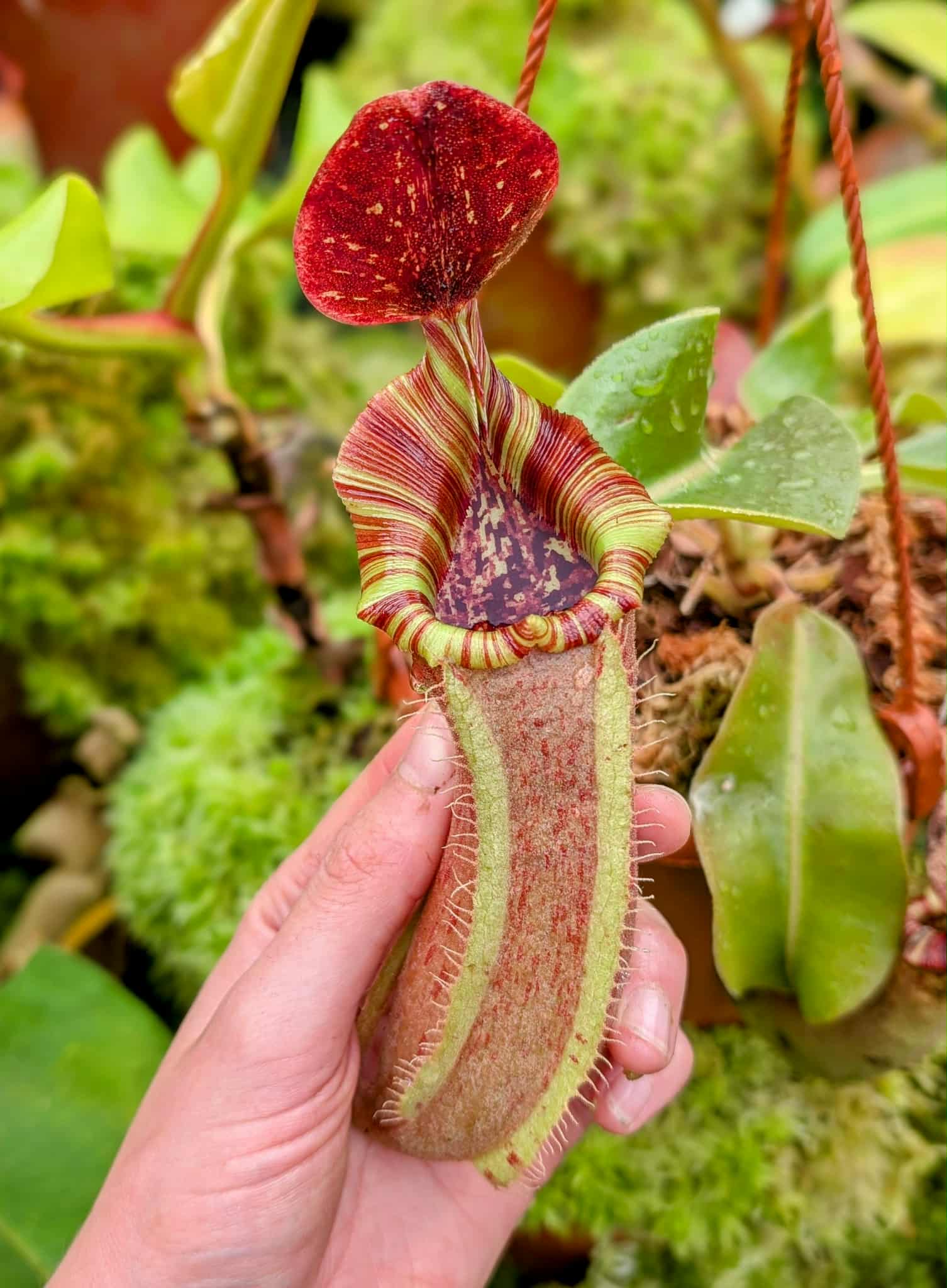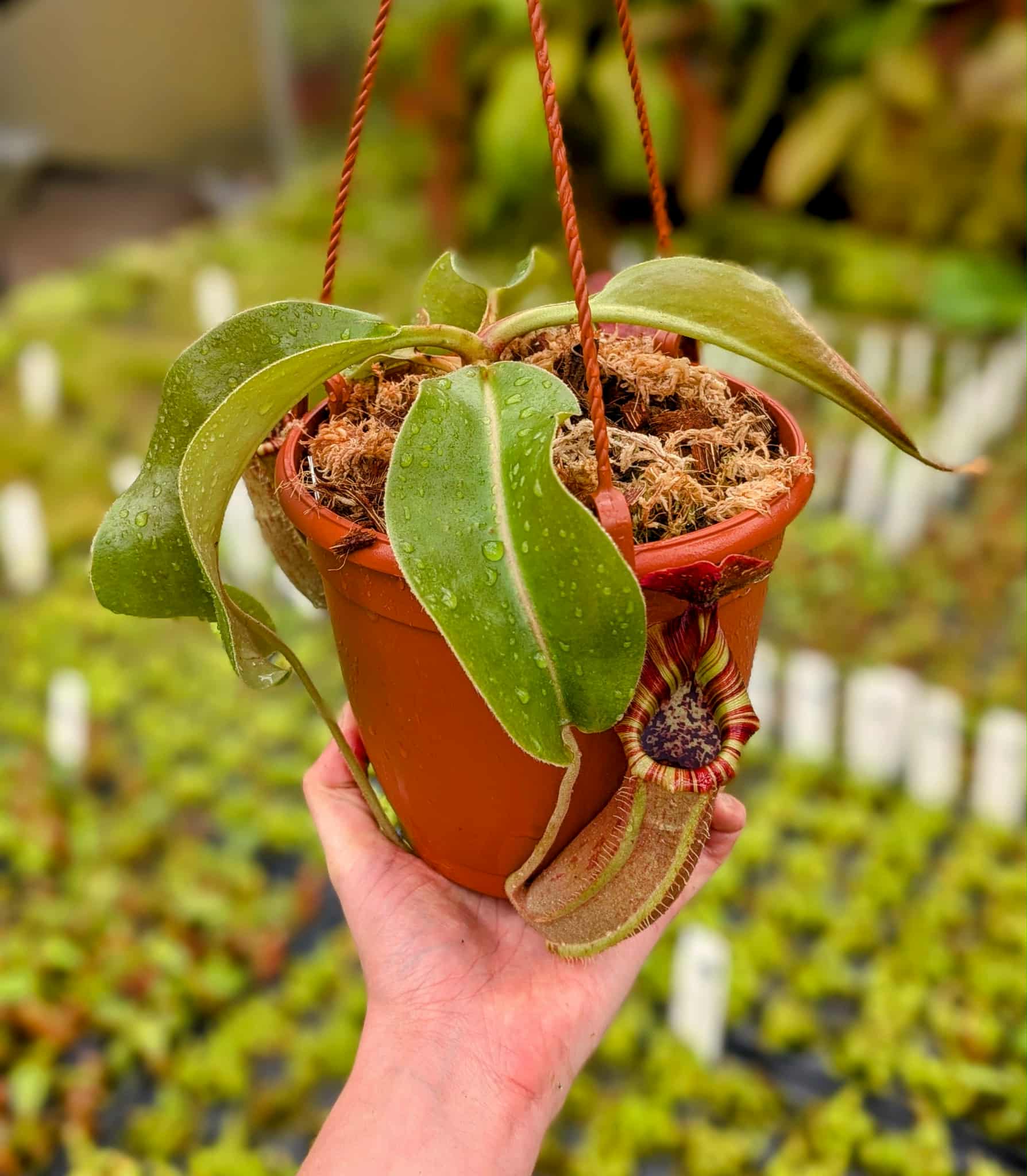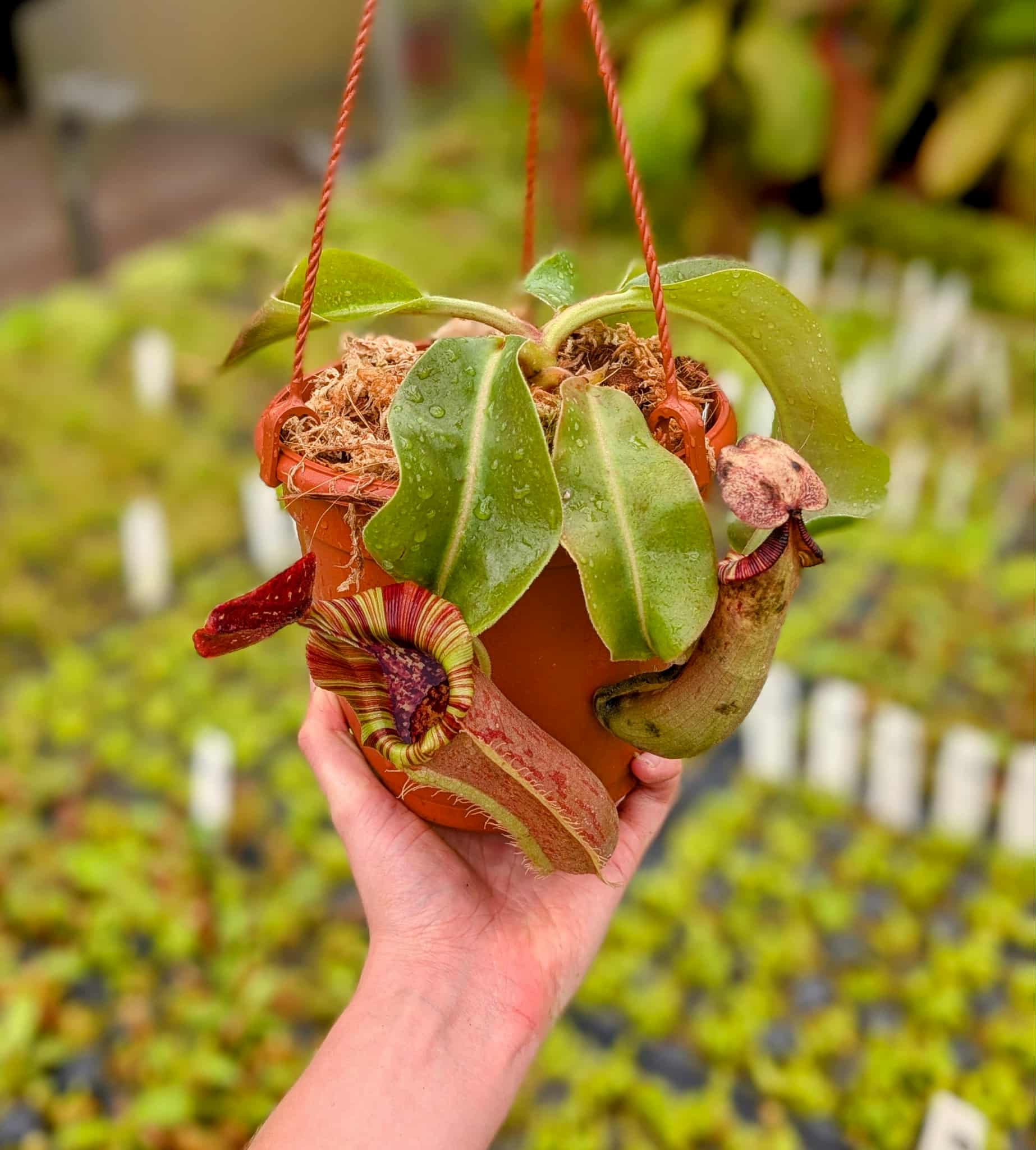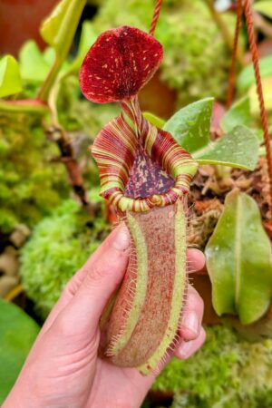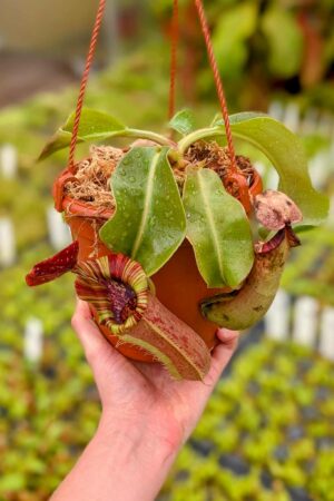 A striking and complex hybrid featuring elegant peristomes, bold pitcher shapes, and vibrant coloration inherited from multiple highland species. Vigorous and robust, it combines impressive aesthetics with reliable growth, making it a standout in any Nepenthes collection.
