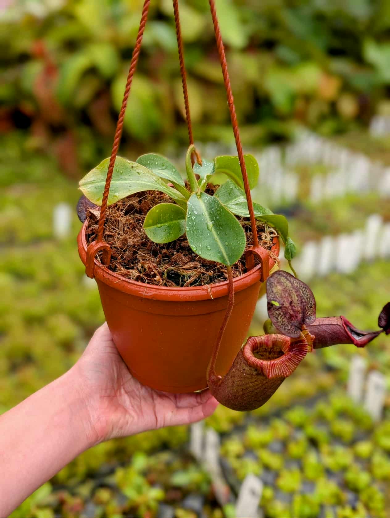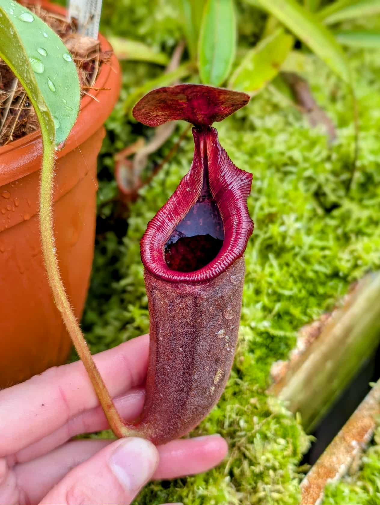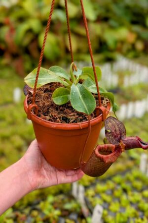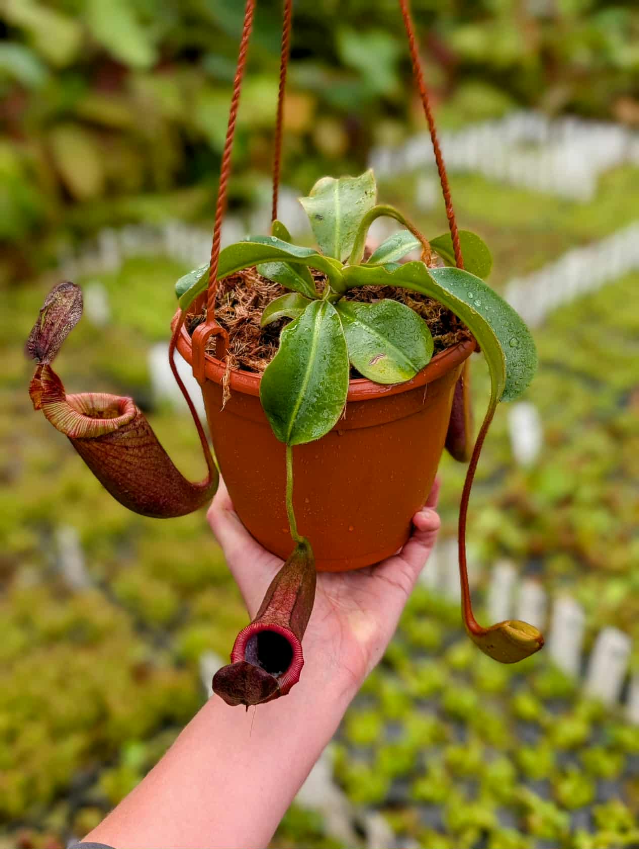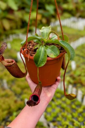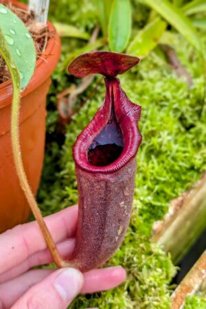 A spectacular multi-species hybrid combining the dramatic features of lowii, veitchii, boschiana, maxima, spectabilis, and ventricosa. This cross is bred for bold peristomes, striking pitcher coloration, and strong, compact growth.