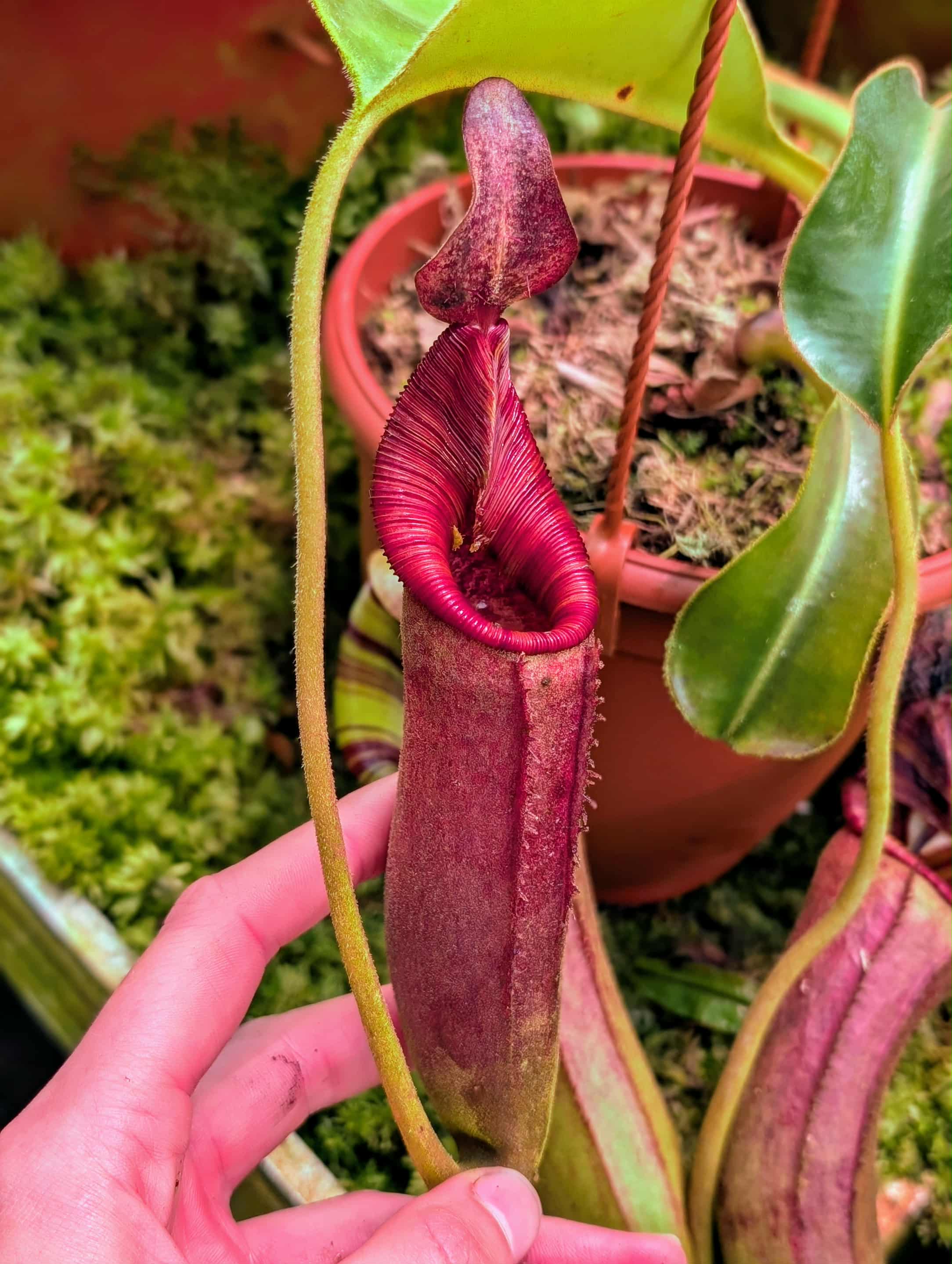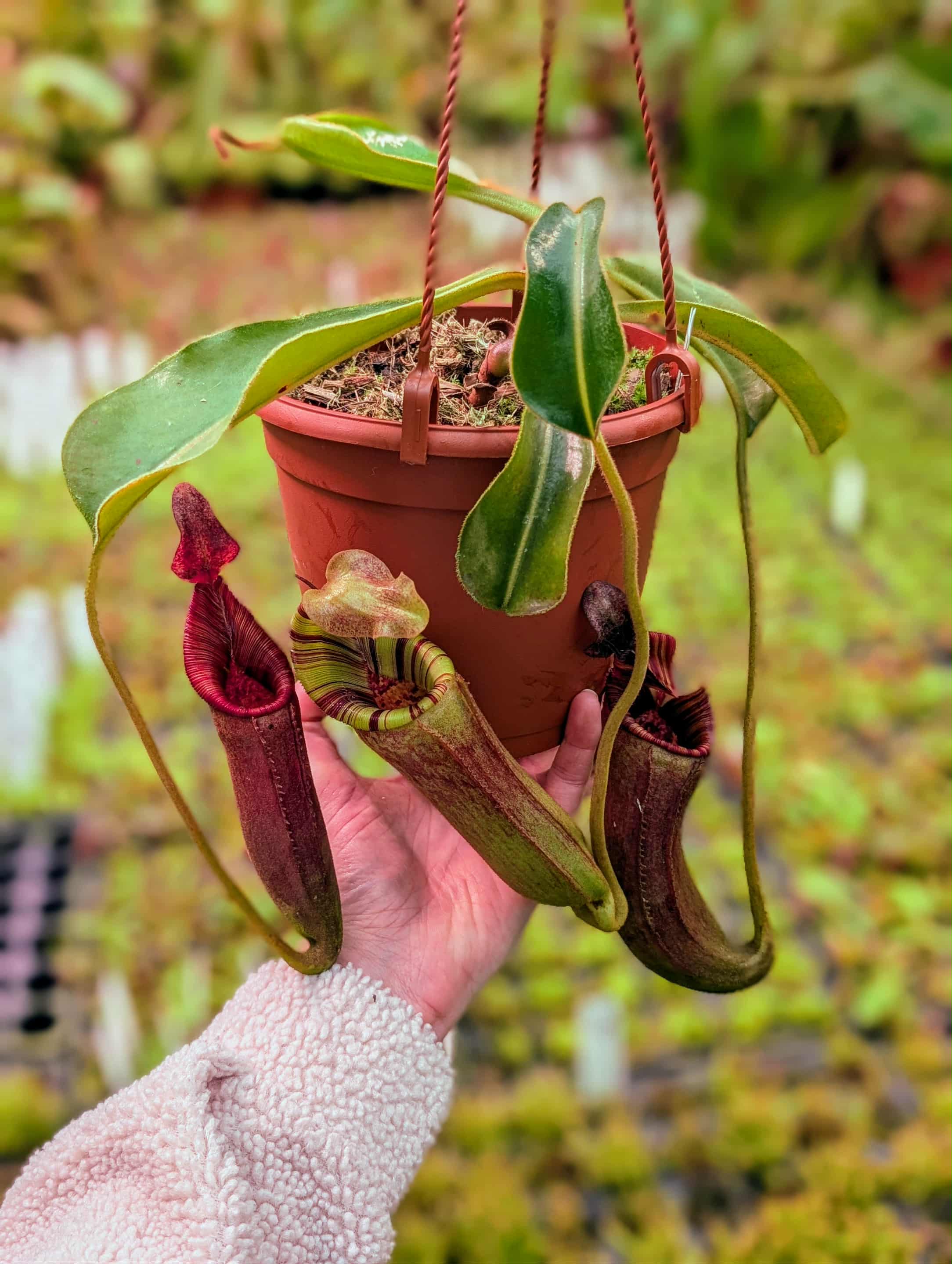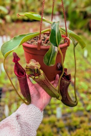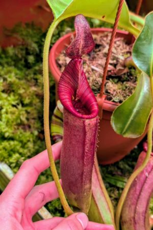 A striking and rare hybrid combining lowii’s unique funnel-shaped pitchers with mollis’ graceful, elongated form. Expect elegant pitchers with subtle patterns and soft coloration