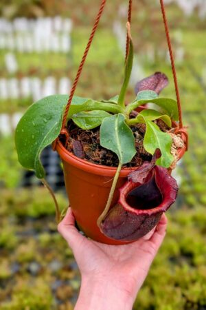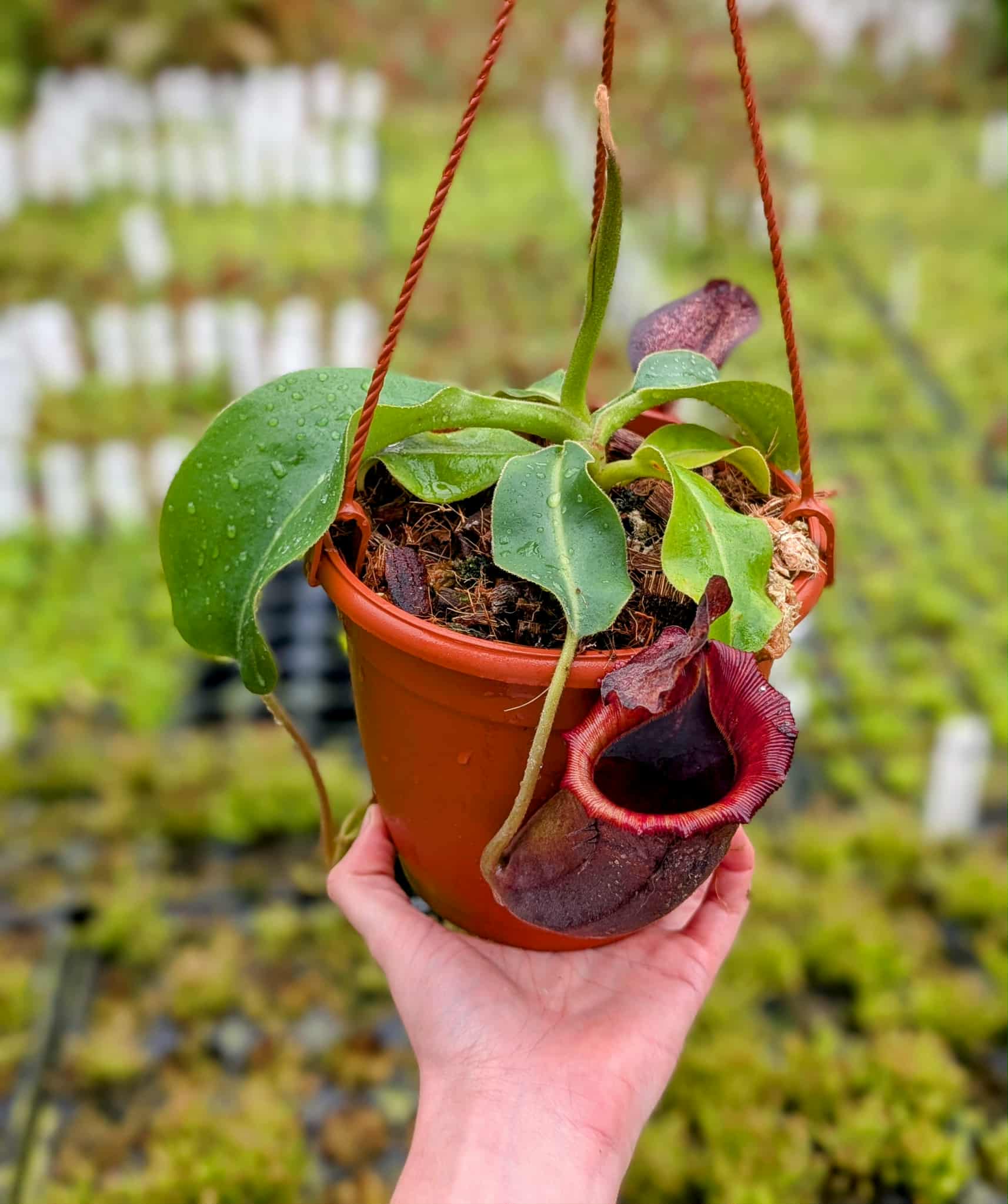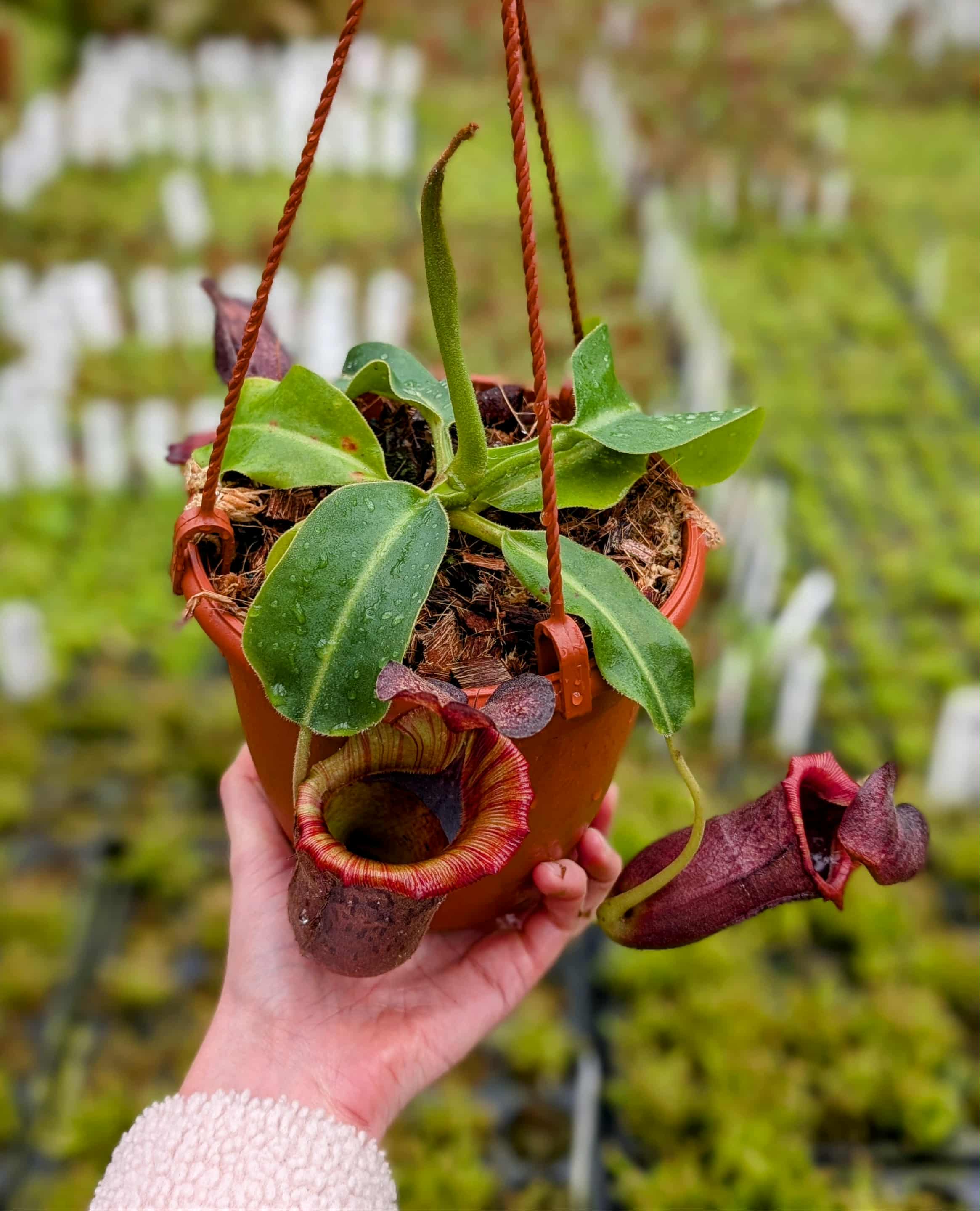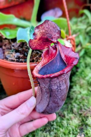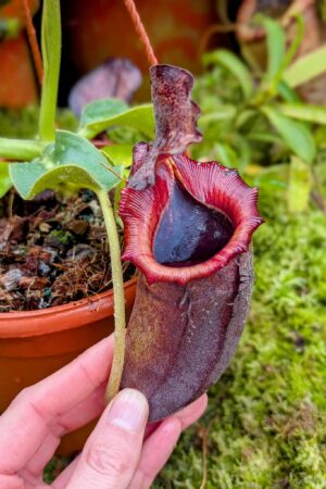 A spectacular multi-species hybrid combining the dramatic features of lowii, veitchii, boschiana, maxima, spectabilis, and ventricosa. This cross is bred for bold peristomes, striking pitcher coloration, and strong, compact growth.