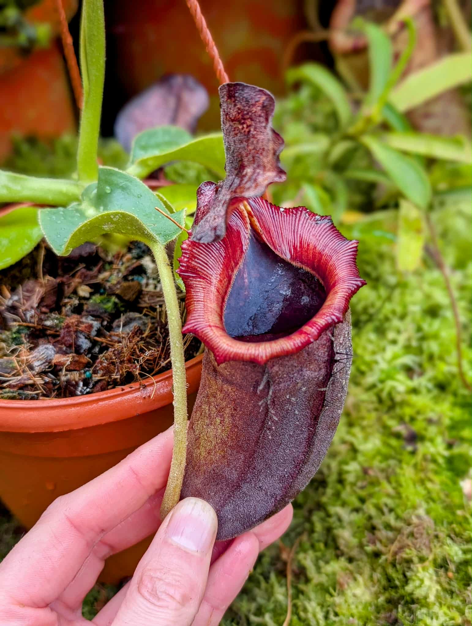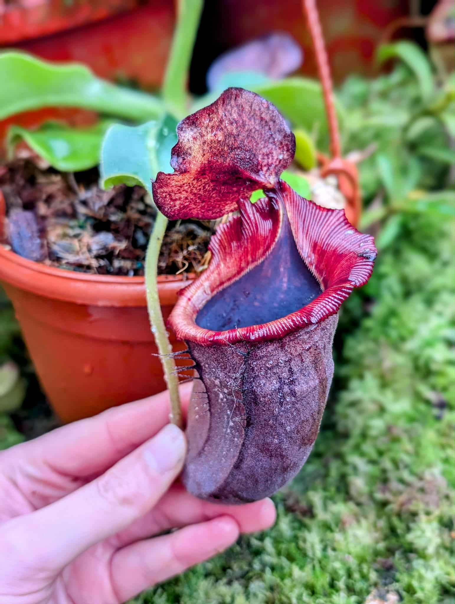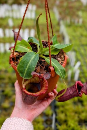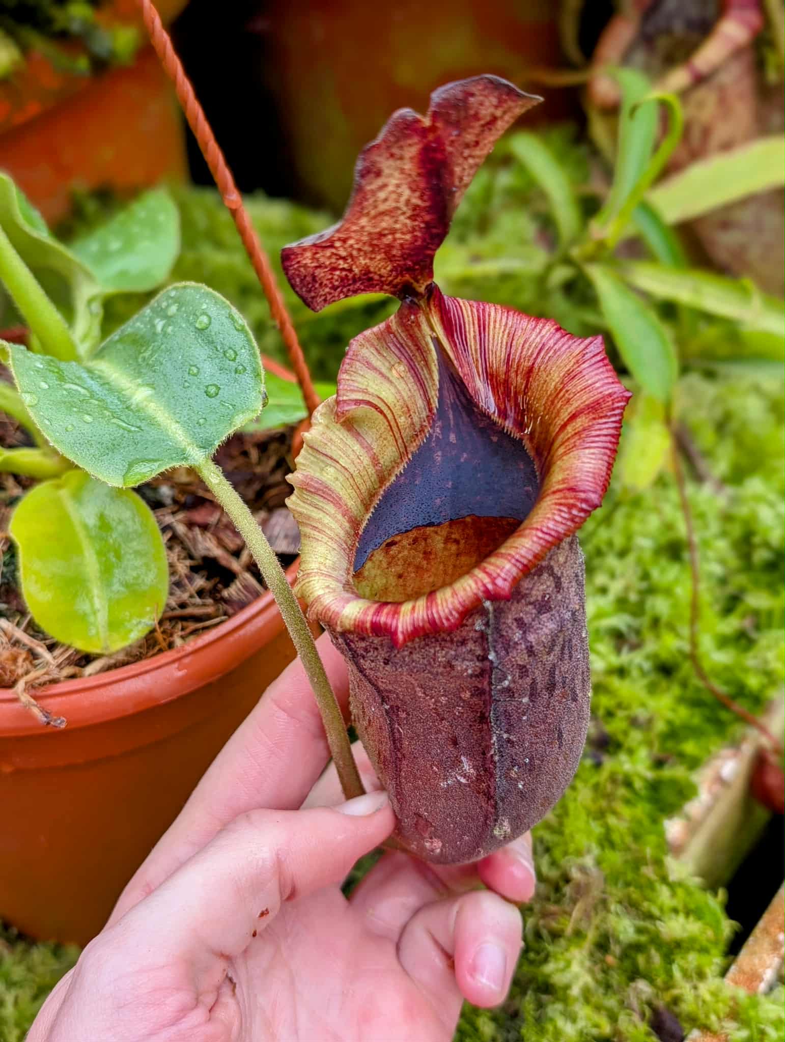 A spectacular multi-species hybrid combining the dramatic features of lowii, veitchii, boschiana, maxima, spectabilis, and ventricosa. This cross is bred for bold peristomes, striking pitcher coloration, and strong, compact growth.