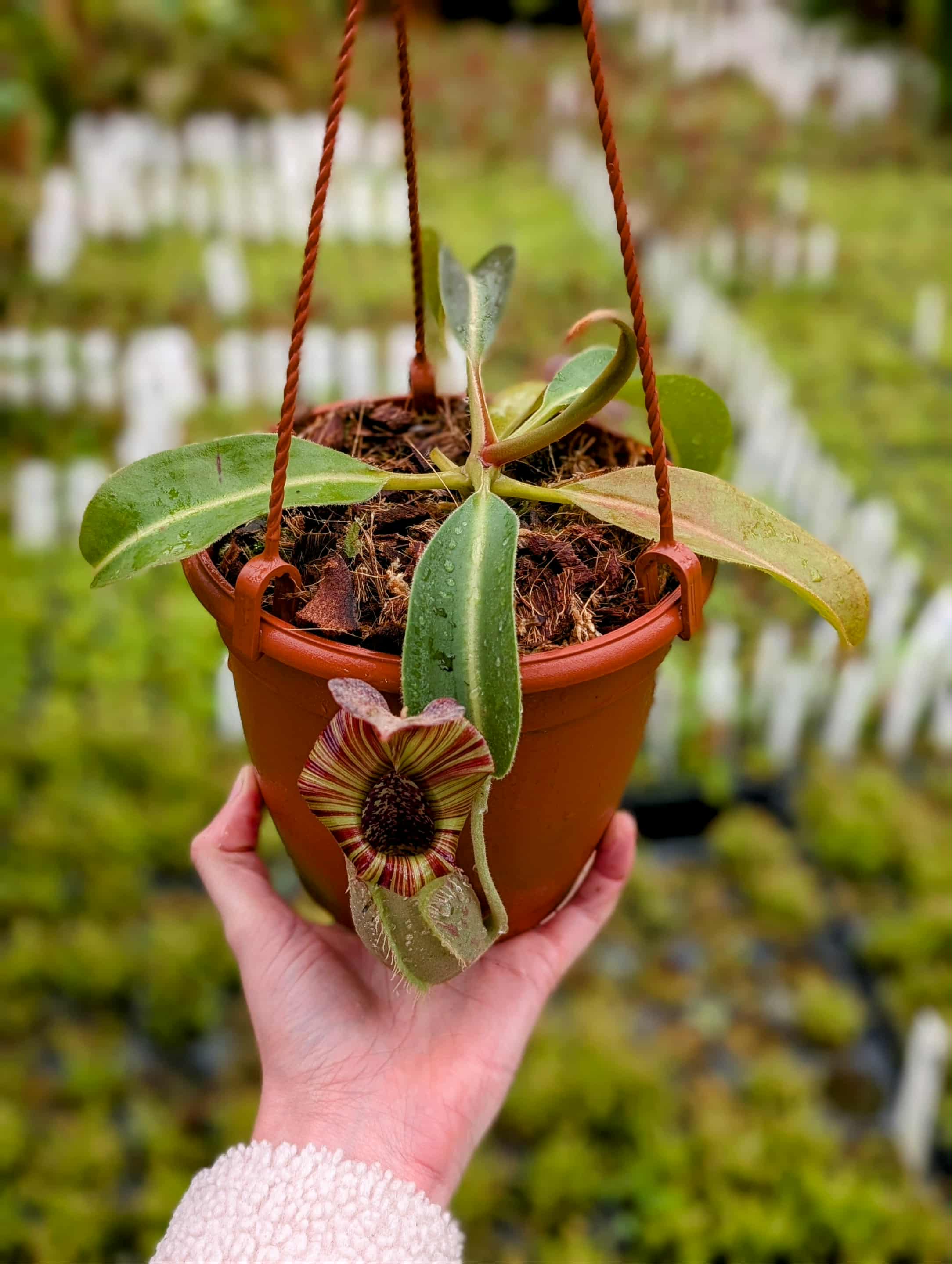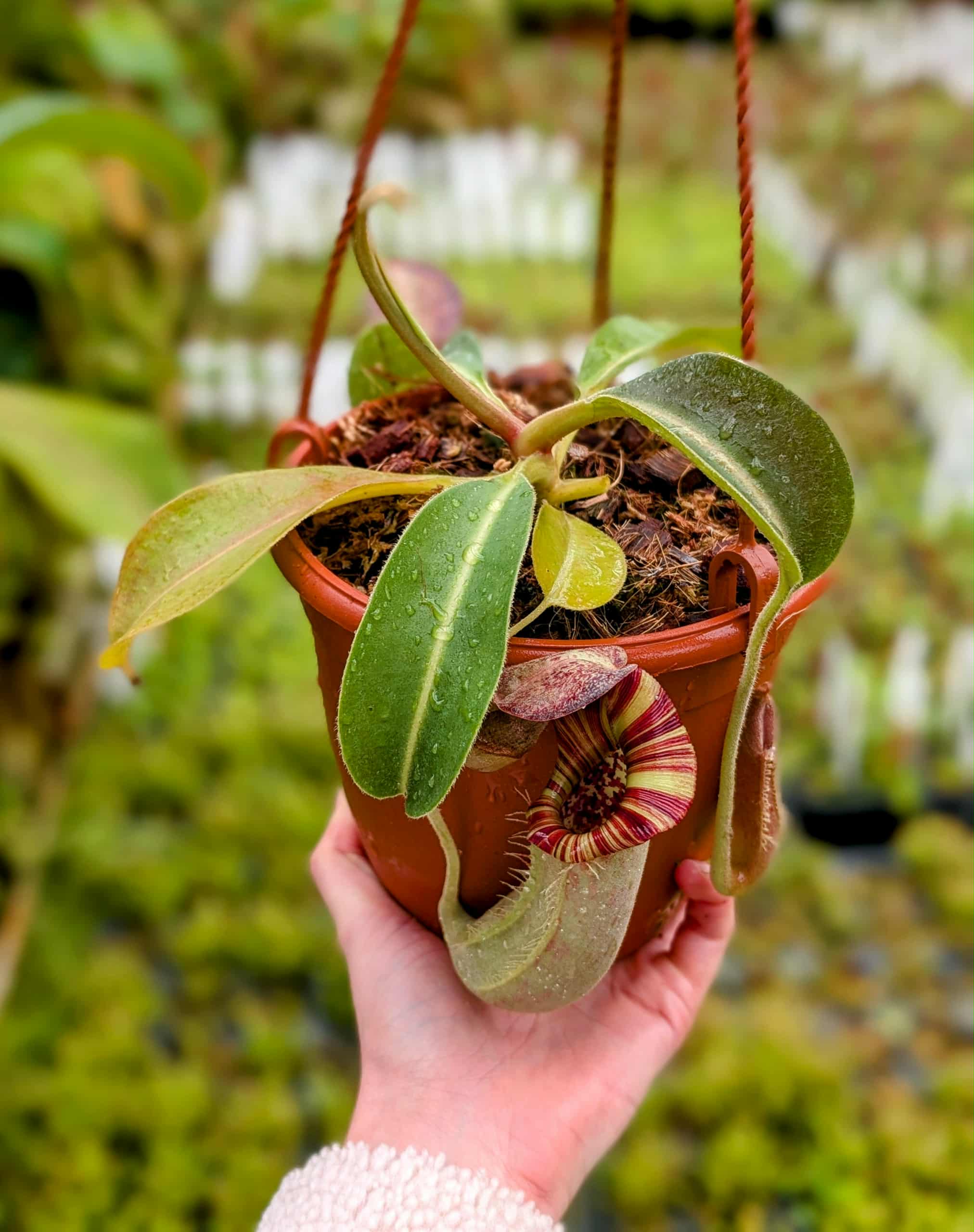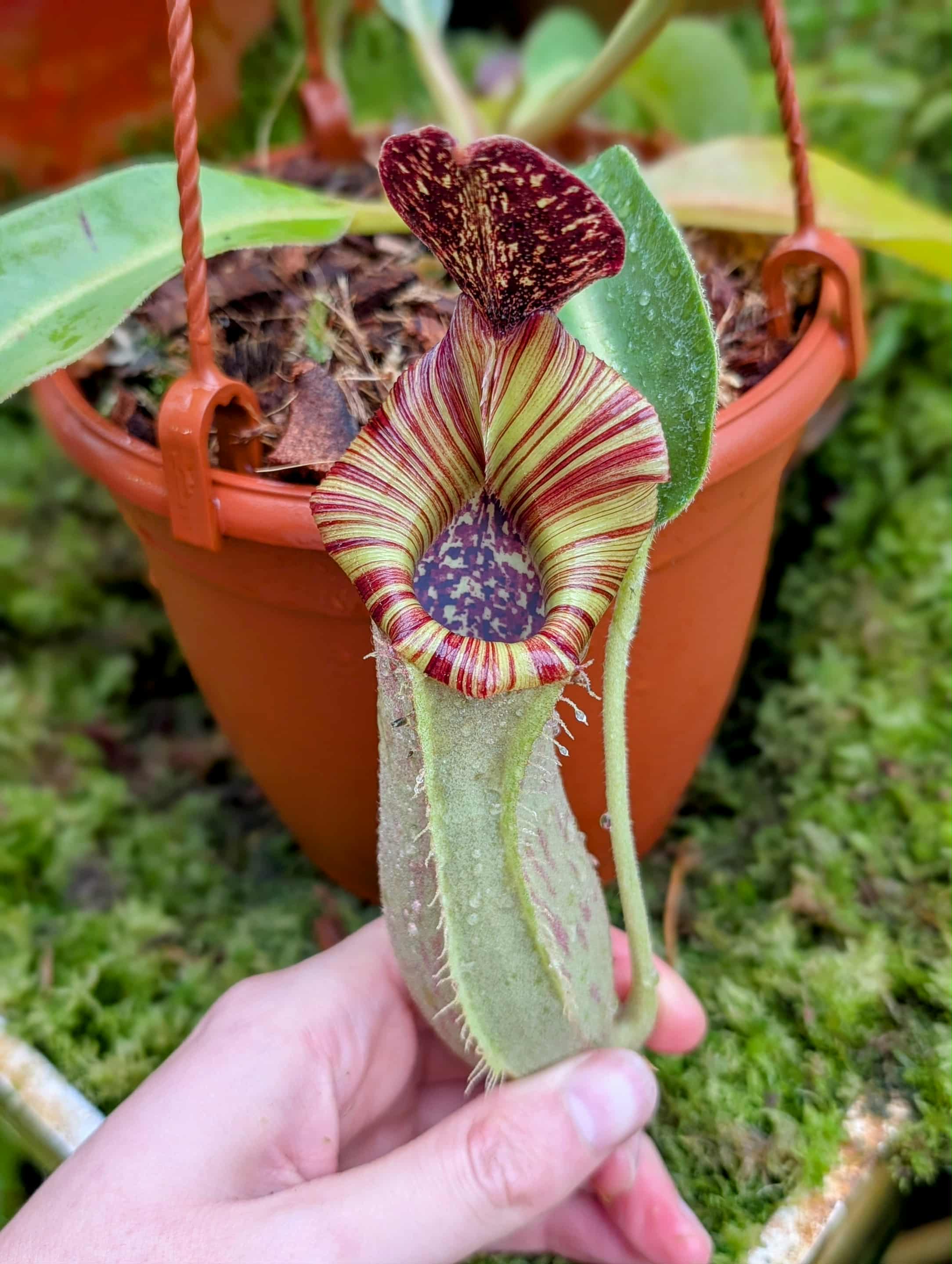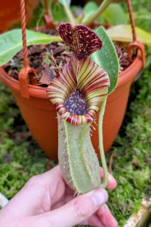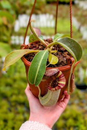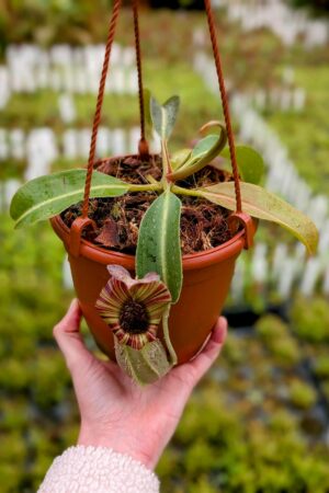 A striking and complex hybrid featuring elegant peristomes, bold pitcher shapes, and vibrant coloration inherited from multiple highland species. Vigorous and robust, it combines impressive aesthetics with reliable growth, making it a standout in any Nepenthes collection.