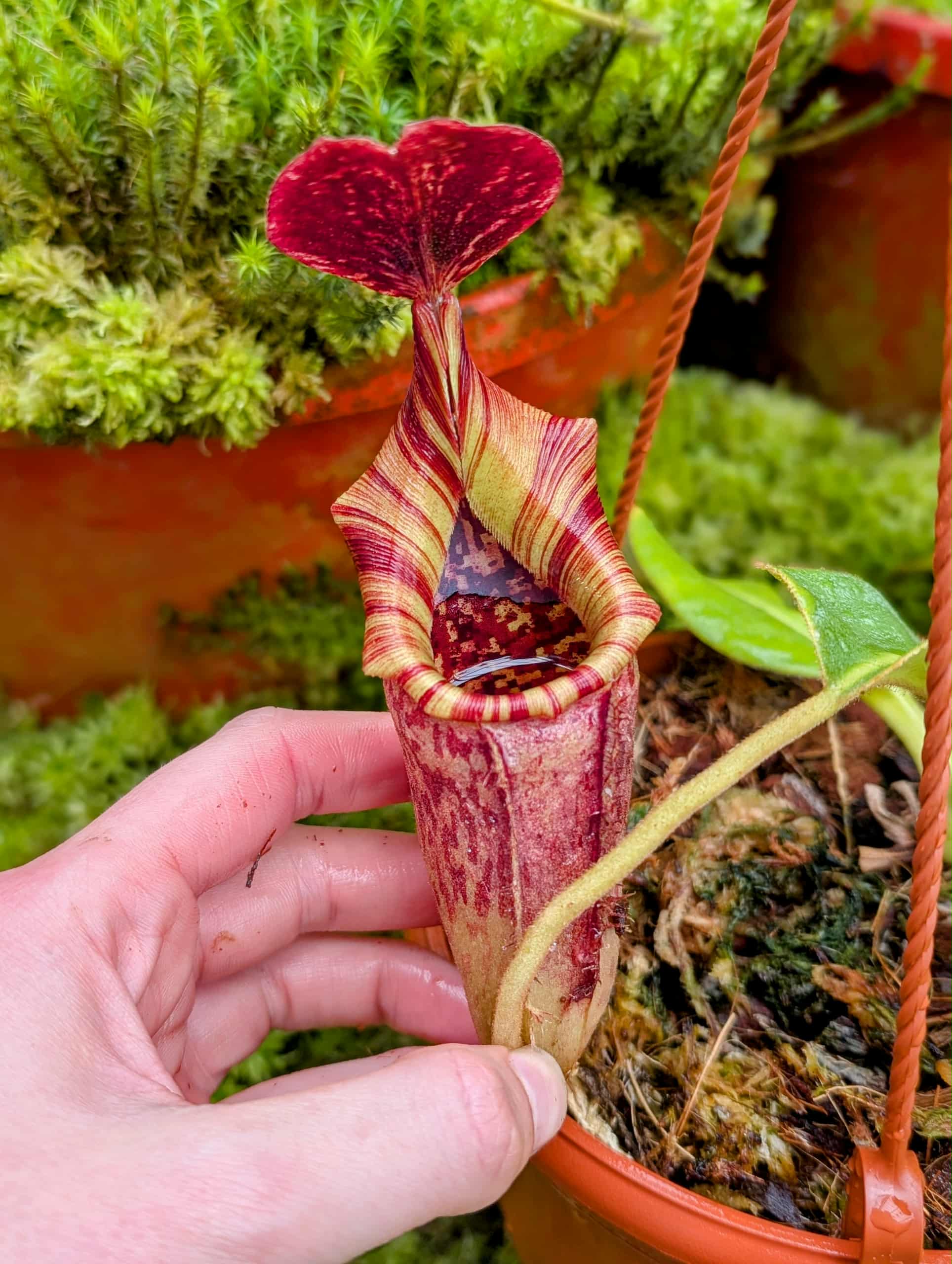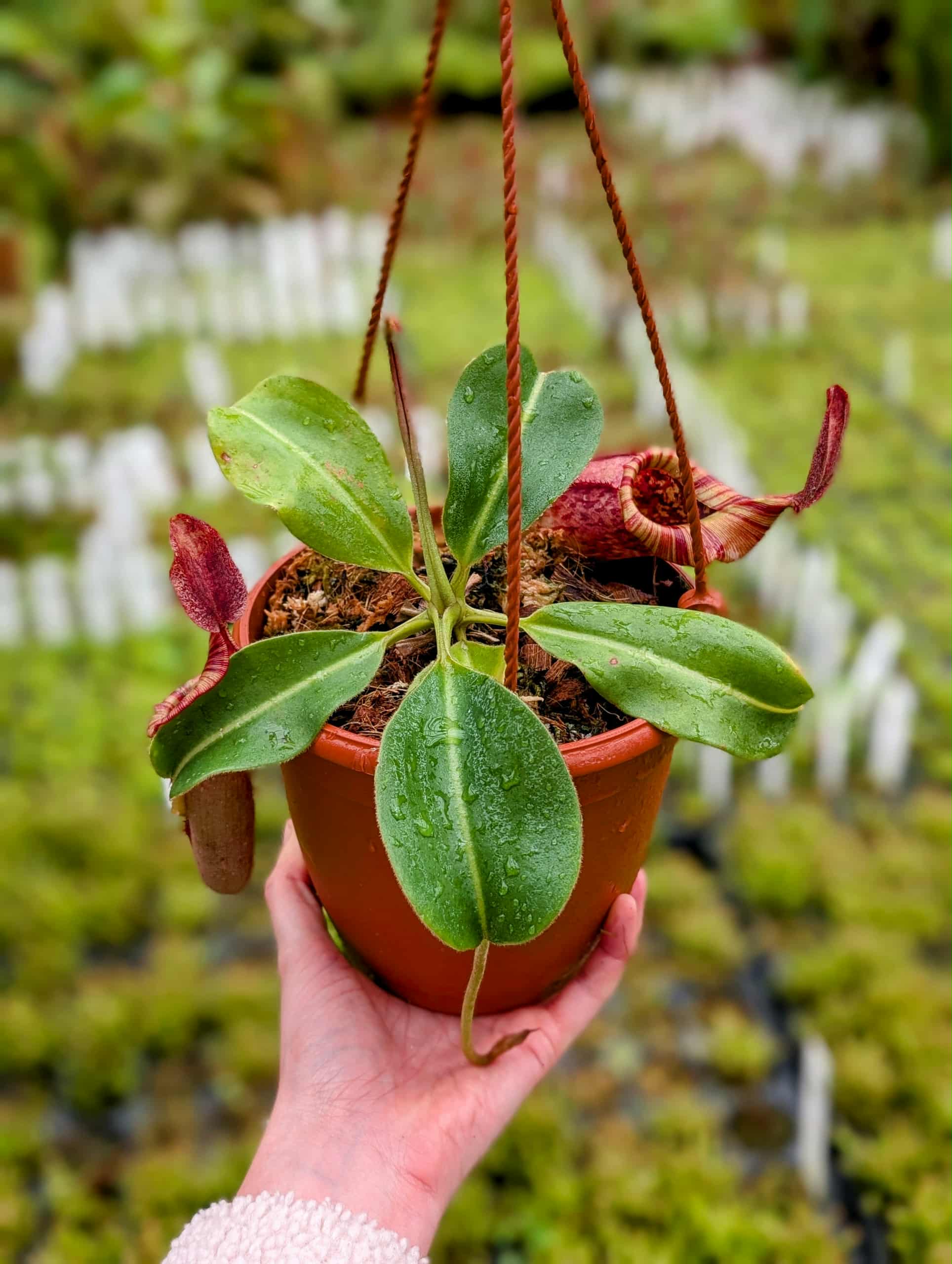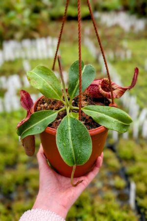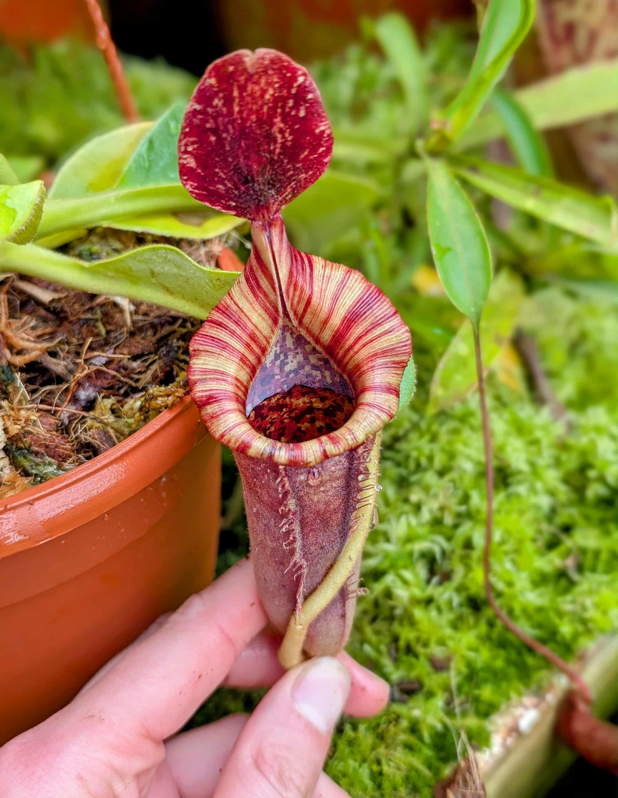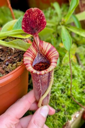 A spectacular multi-species hybrid combining the dramatic features of lowii, veitchii, boschiana, maxima, spectabilis, and ventricosa. This cross is bred for bold peristomes, striking pitcher coloration, and strong, compact growth.