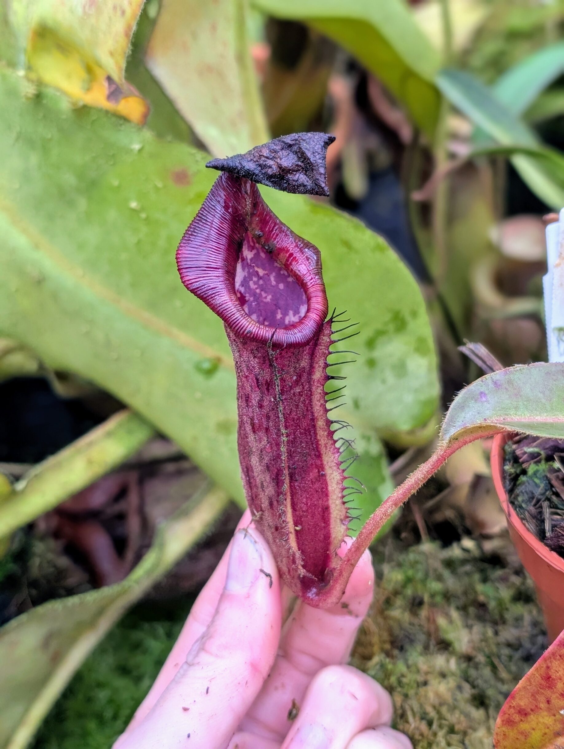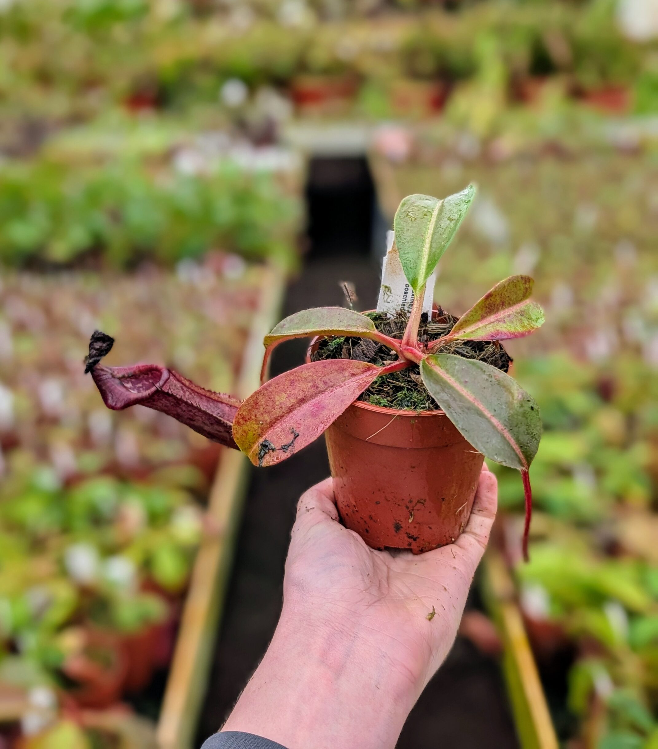 A striking and complex hybrid featuring elegant peristomes, bold pitcher shapes, and vibrant coloration inherited from multiple highland species. Vigorous and robust, it combines impressive aesthetics with reliable growth, making it a standout in any Nepenthes collection.