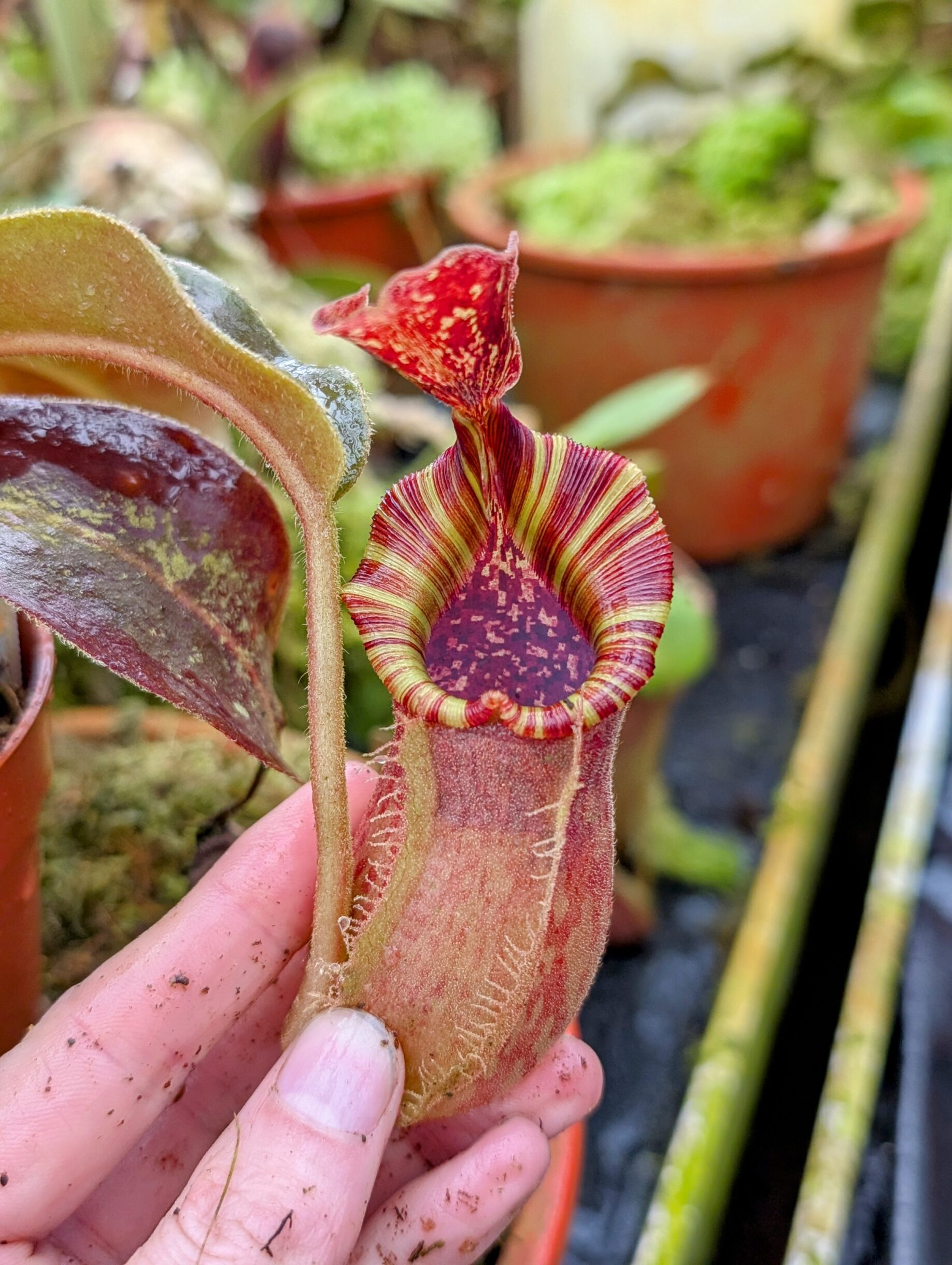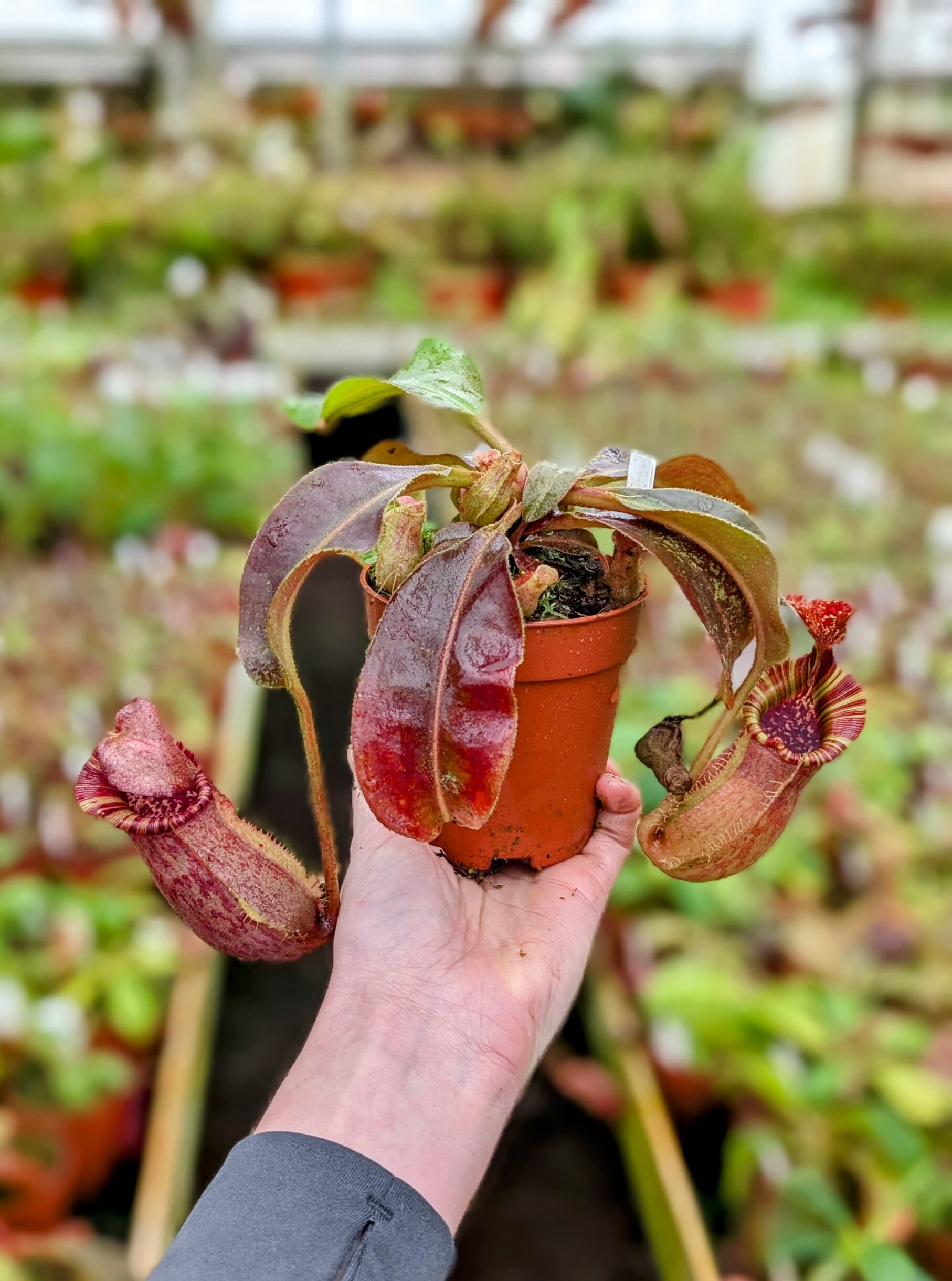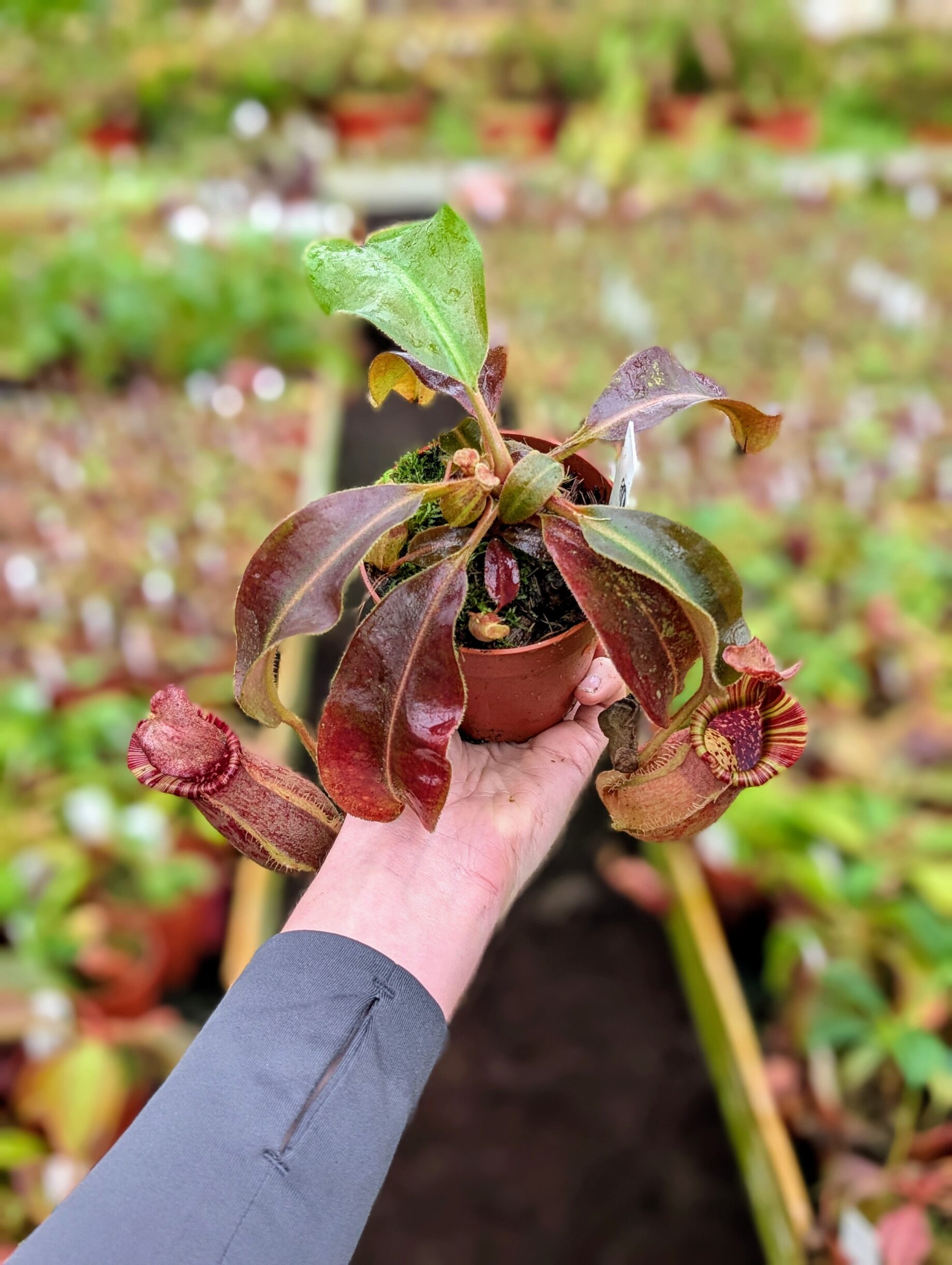 A striking and complex hybrid featuring elegant peristomes, bold pitcher shapes, and vibrant coloration inherited from multiple highland species. Vigorous and robust, it combines impressive aesthetics with reliable growth, making it a standout in any Nepenthes collection.