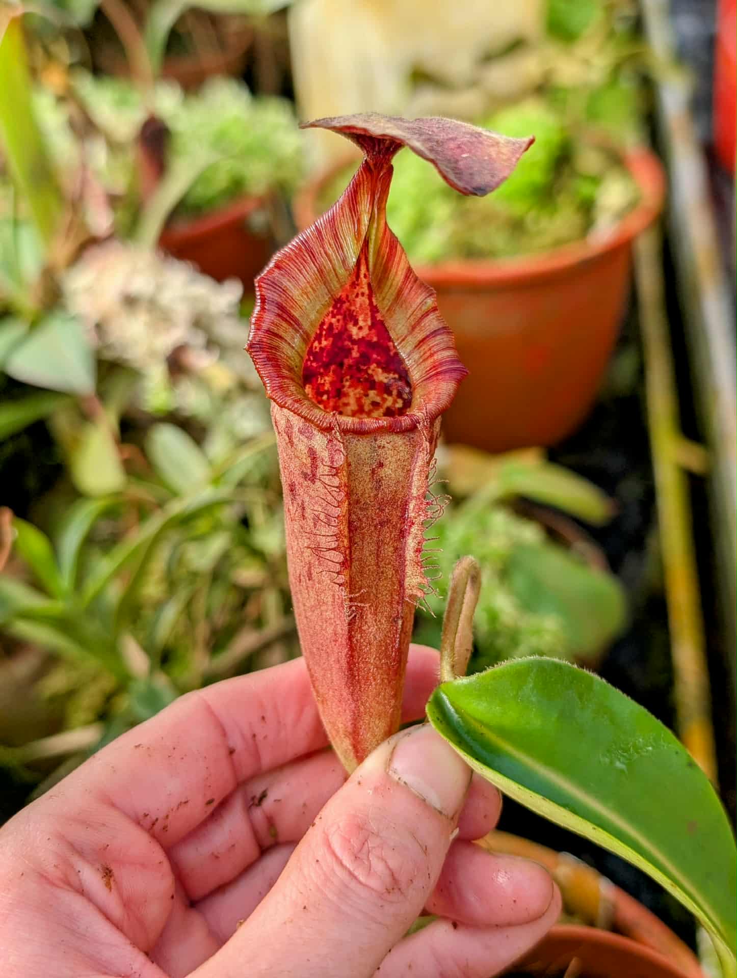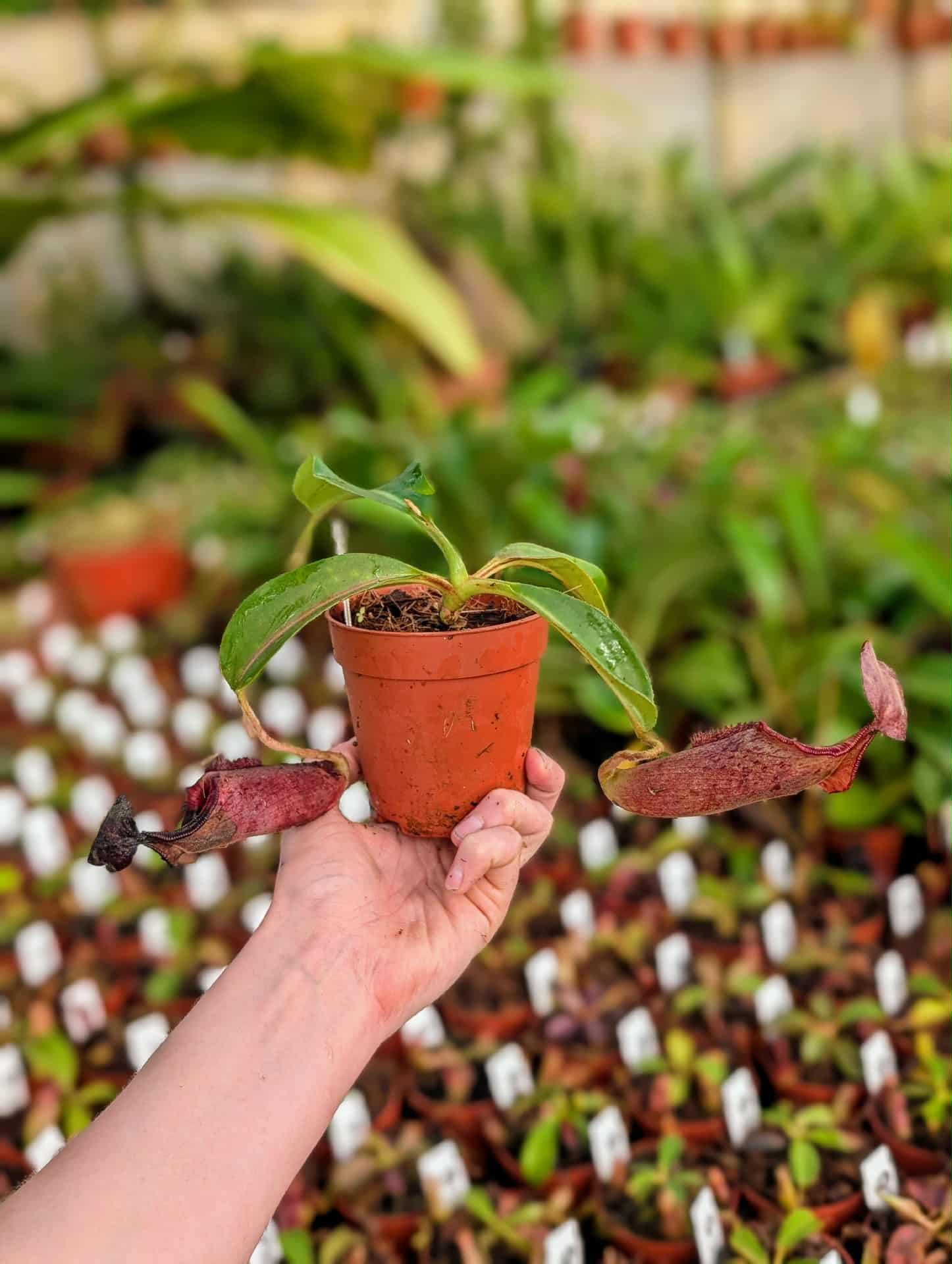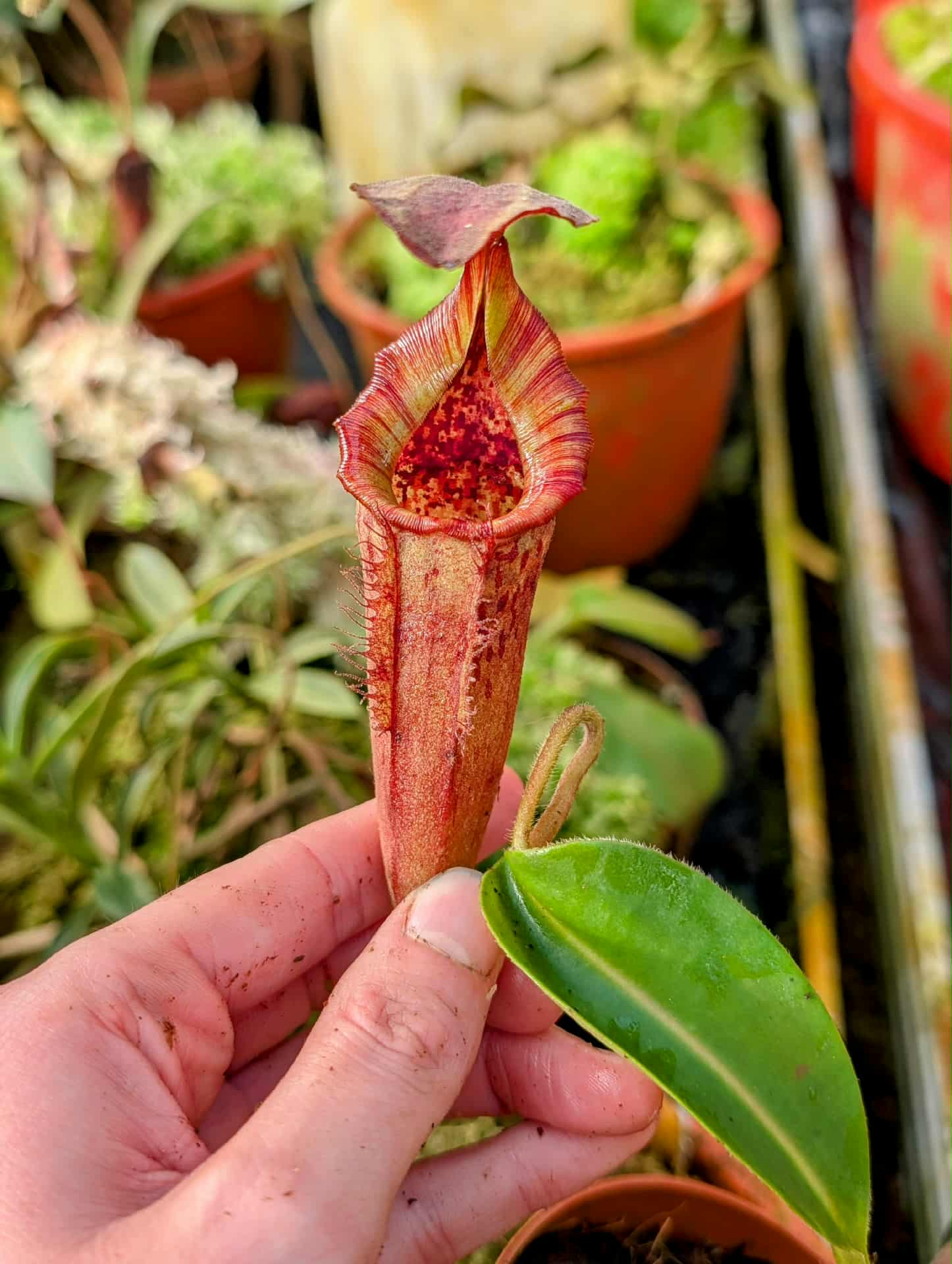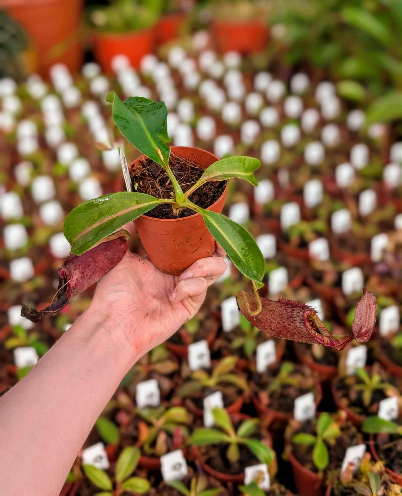 A spectacular multi-species hybrid combining the dramatic features of lowii, veitchii, boschiana, maxima, spectabilis, and ventricosa. This cross is bred for bold peristomes, striking pitcher coloration, and strong, compact growth.