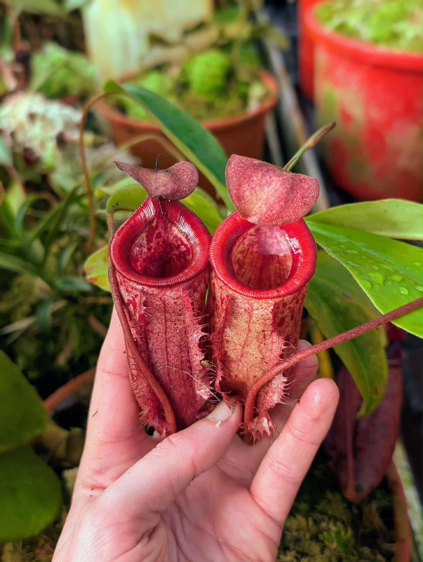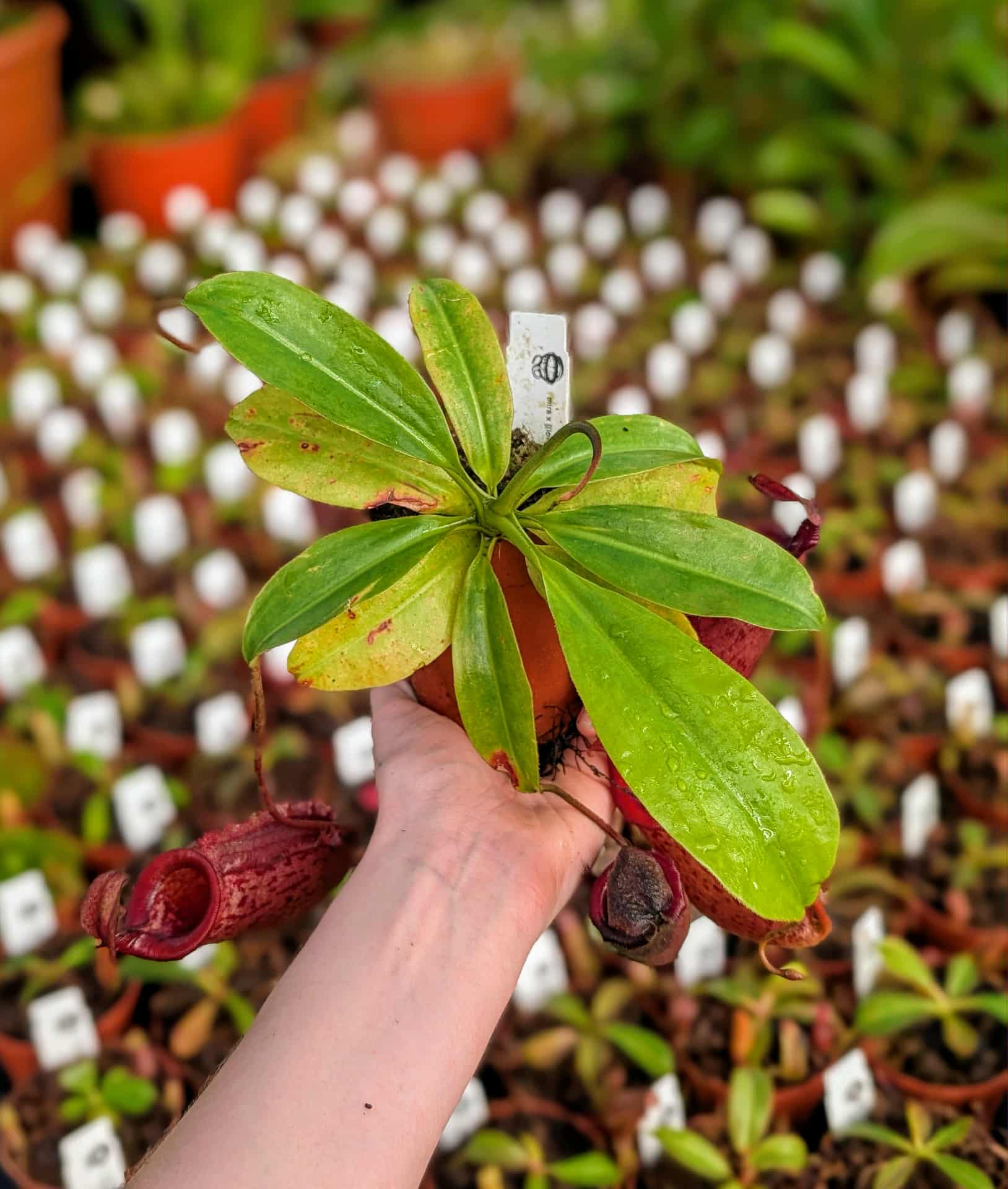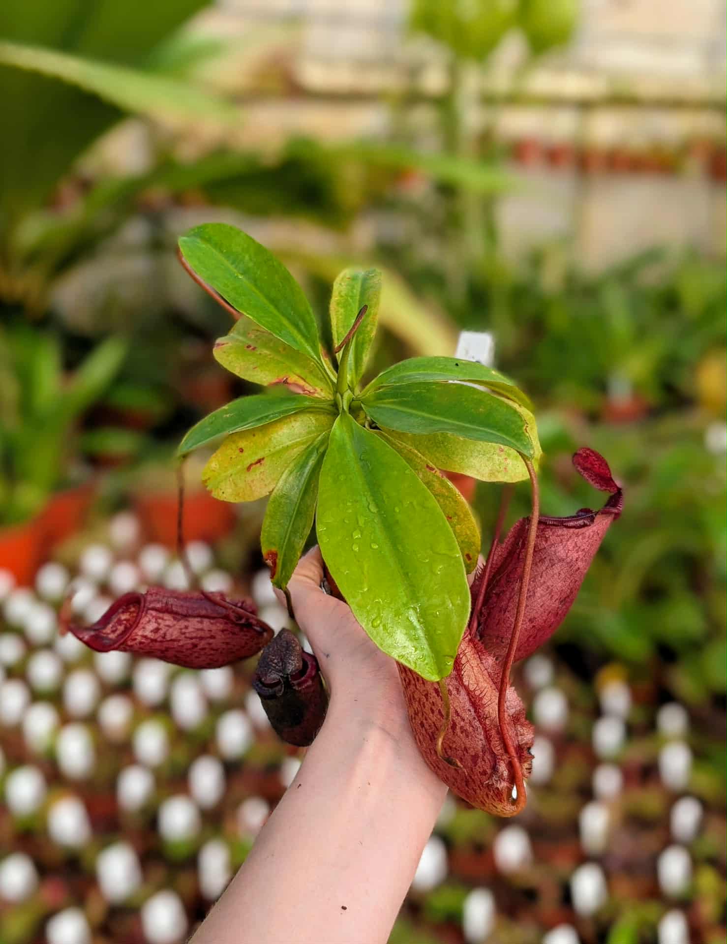 This cross combines the bold character and colorful, flared peristome of N. mira with the elegant shapes and fascinating traits of lowii, veitchii, and campanulata.