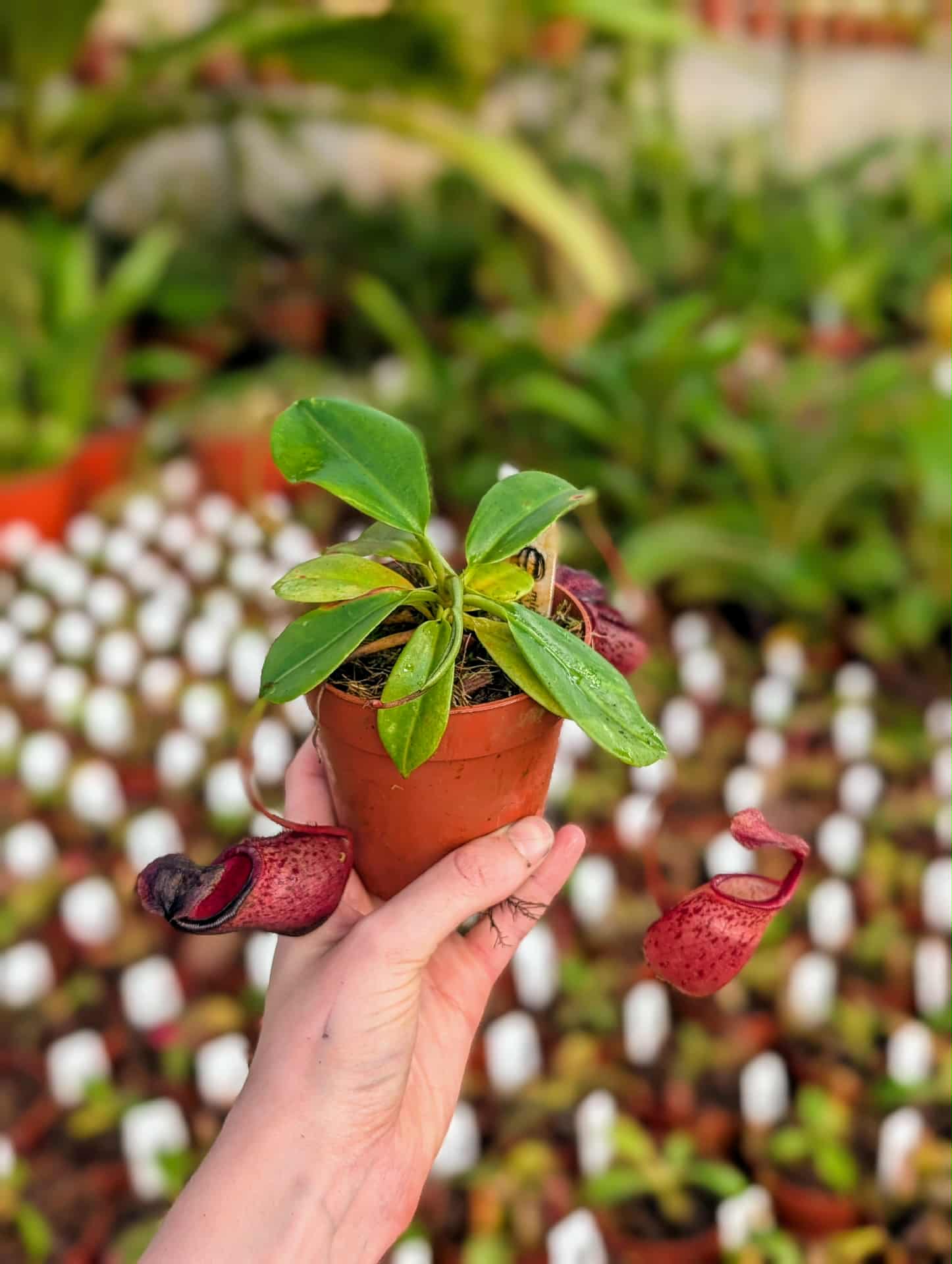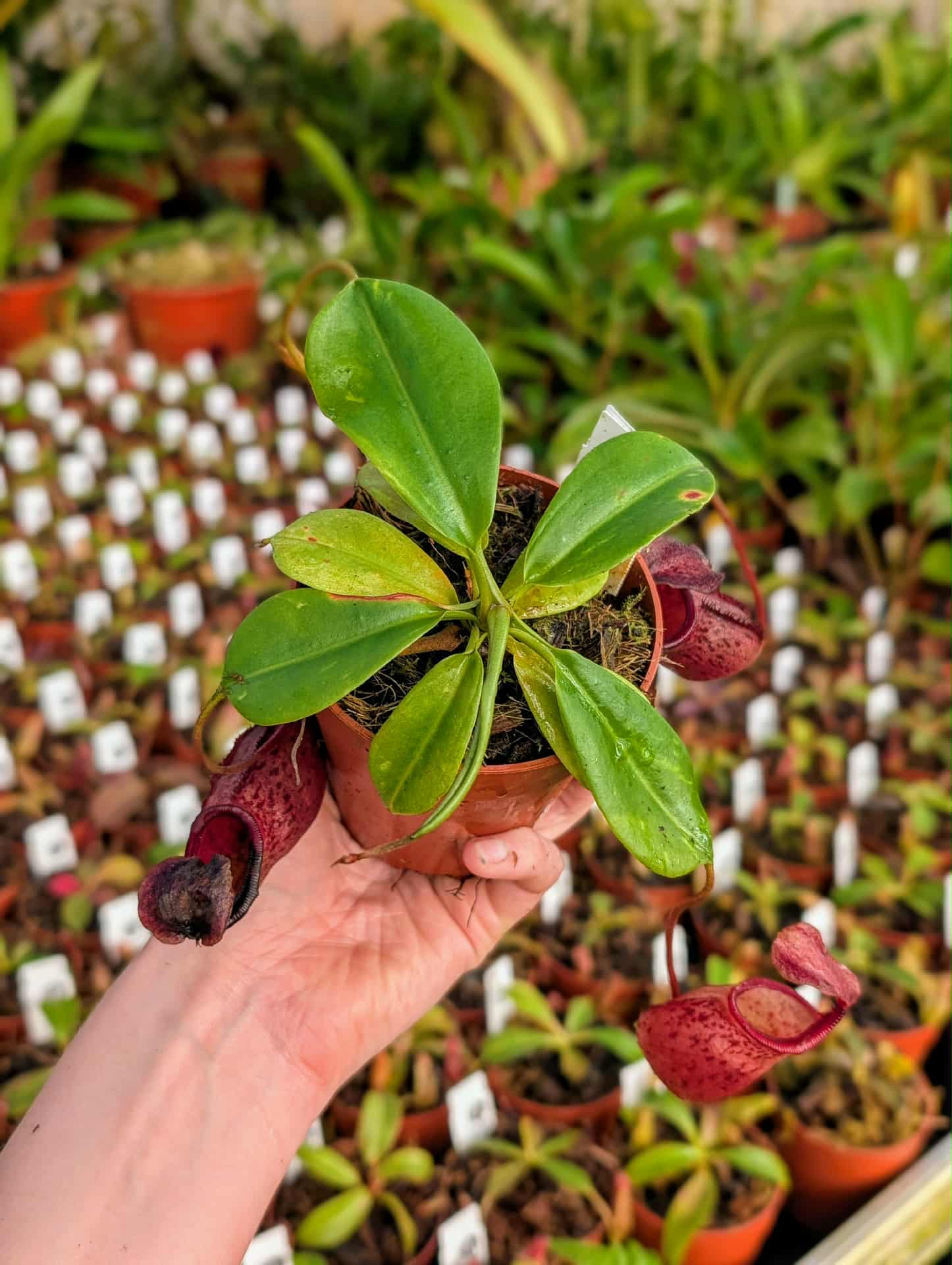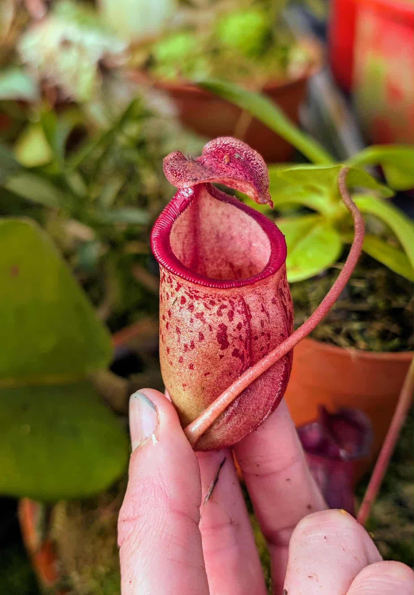 This cross combines the bold character and colorful, flared peristome of N. mira with the elegant shapes and fascinating traits of lowii, veitchii, and campanulata.
