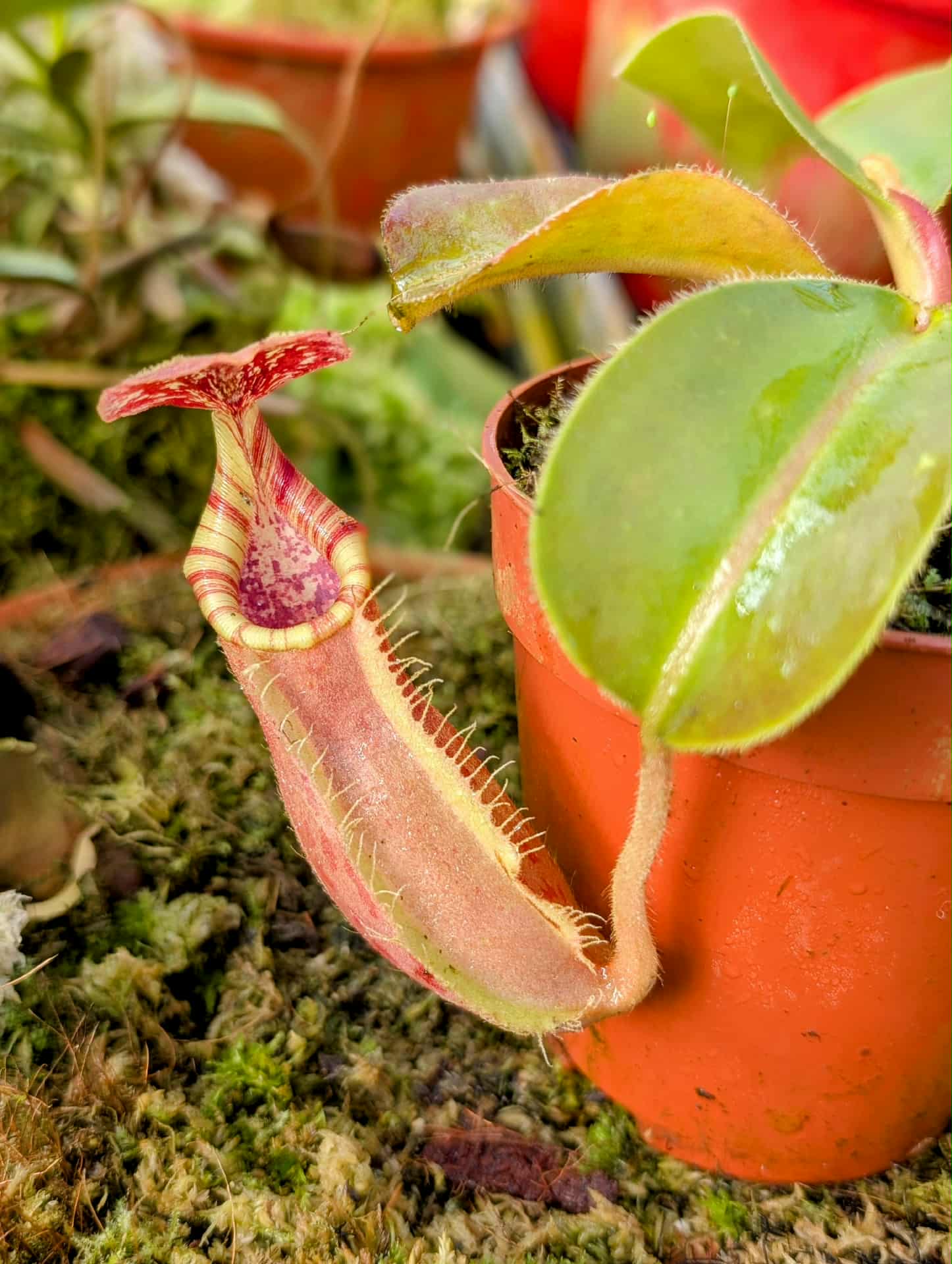 A striking and complex hybrid featuring elegant peristomes, bold pitcher shapes, and vibrant coloration inherited from multiple highland species. Vigorous and robust, it combines impressive aesthetics with reliable growth, making it a standout in any Nepenthes collection.