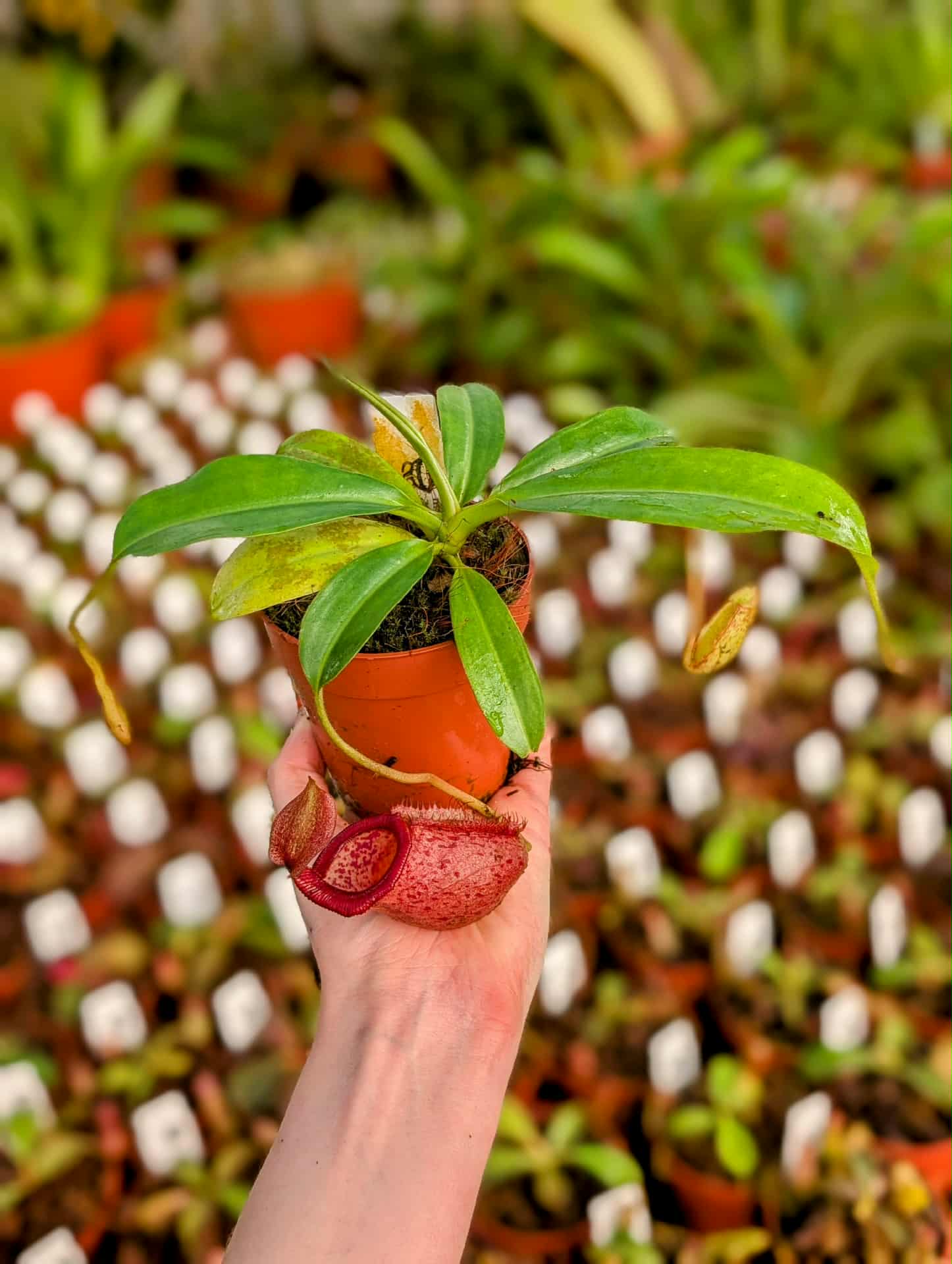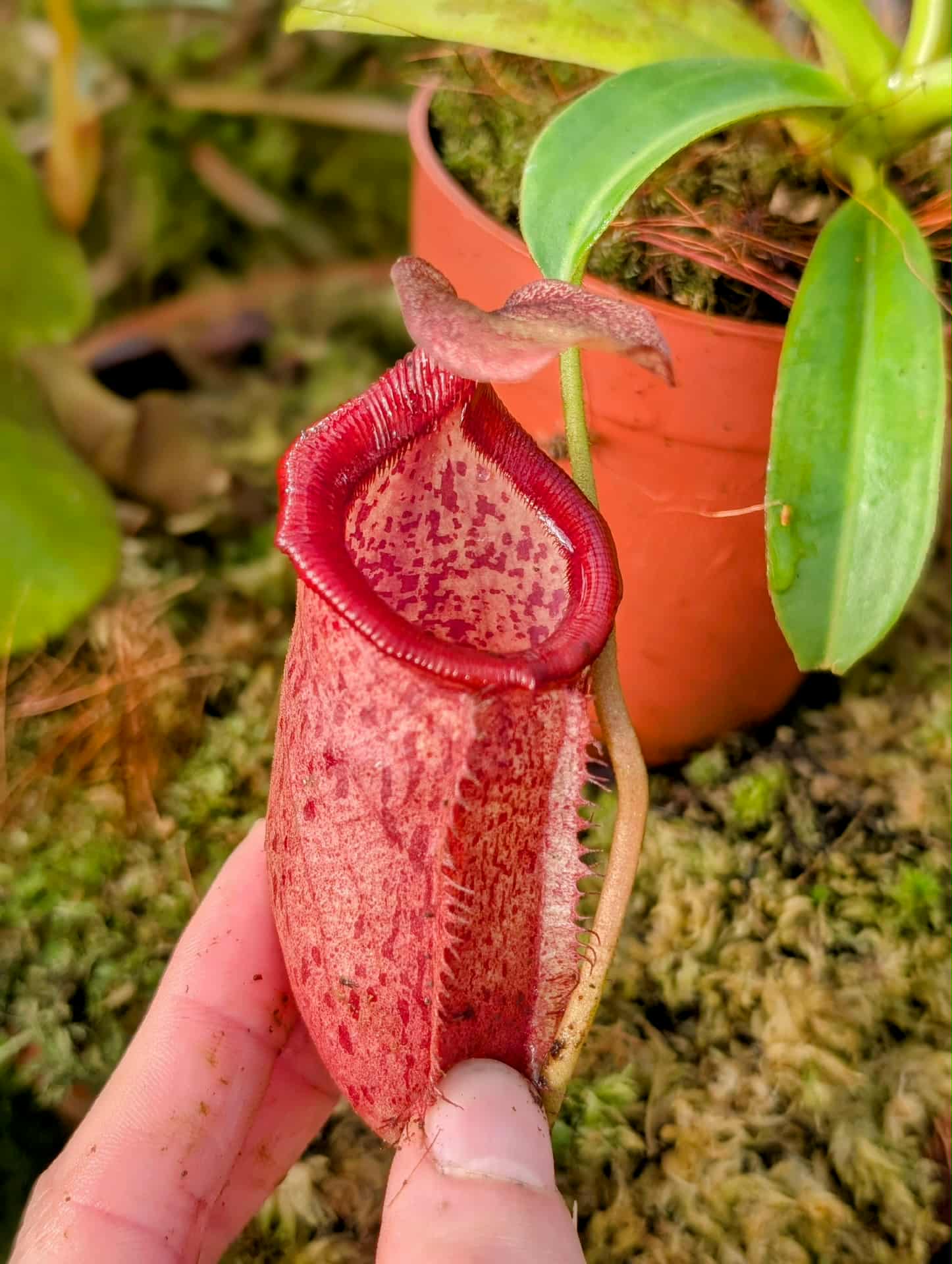 This cross combines the bold character and colorful, flared peristome of N. mira with the elegant shapes and fascinating traits of lowii, veitchii, and campanulata.
