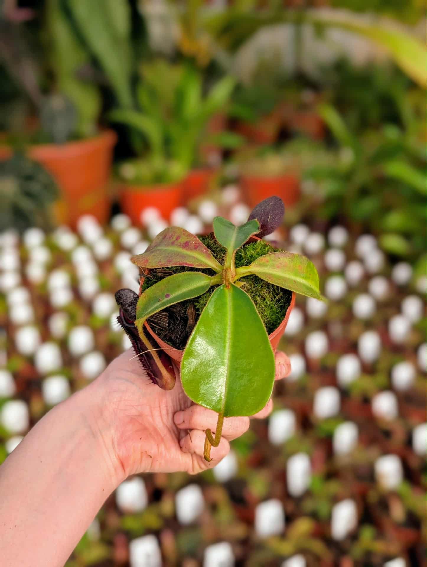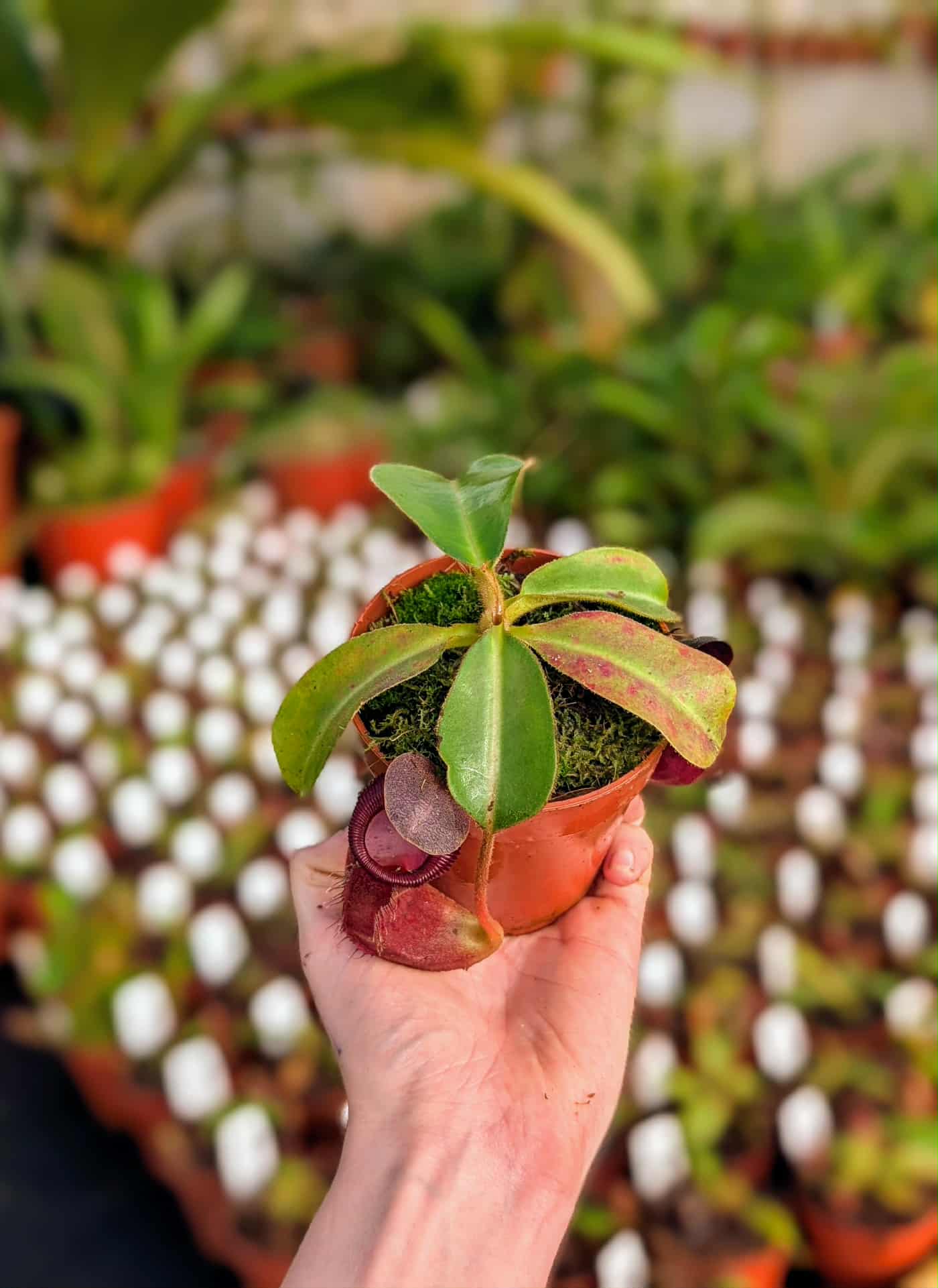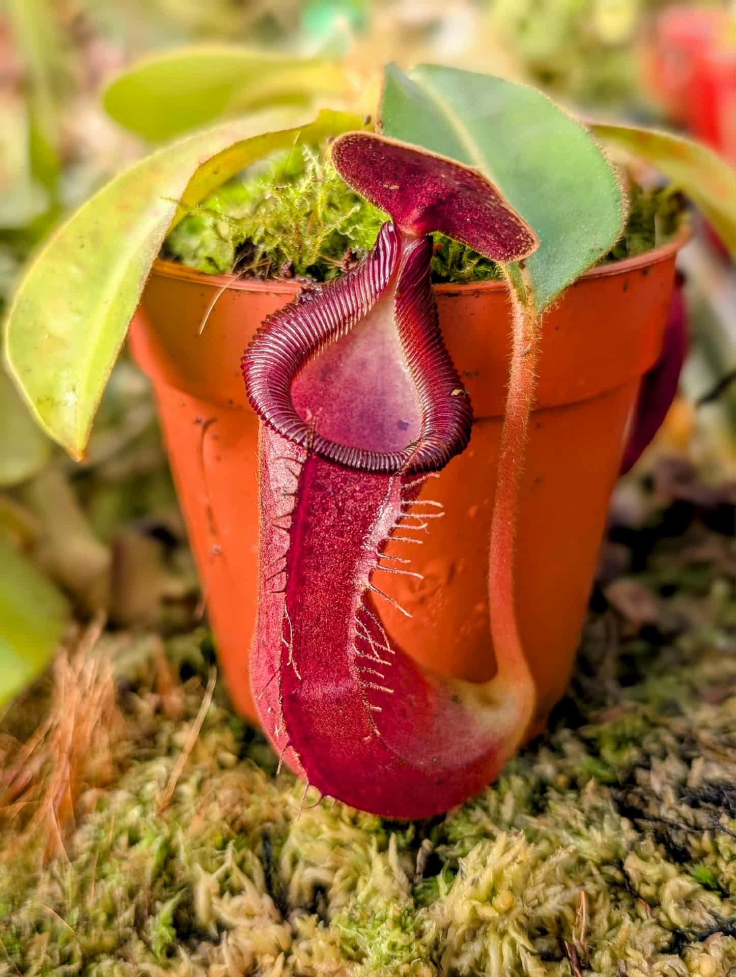 A new hybrid by Taerwe Tropicals. I expect some large, elongated pitchers with slightly ribbed peristomes